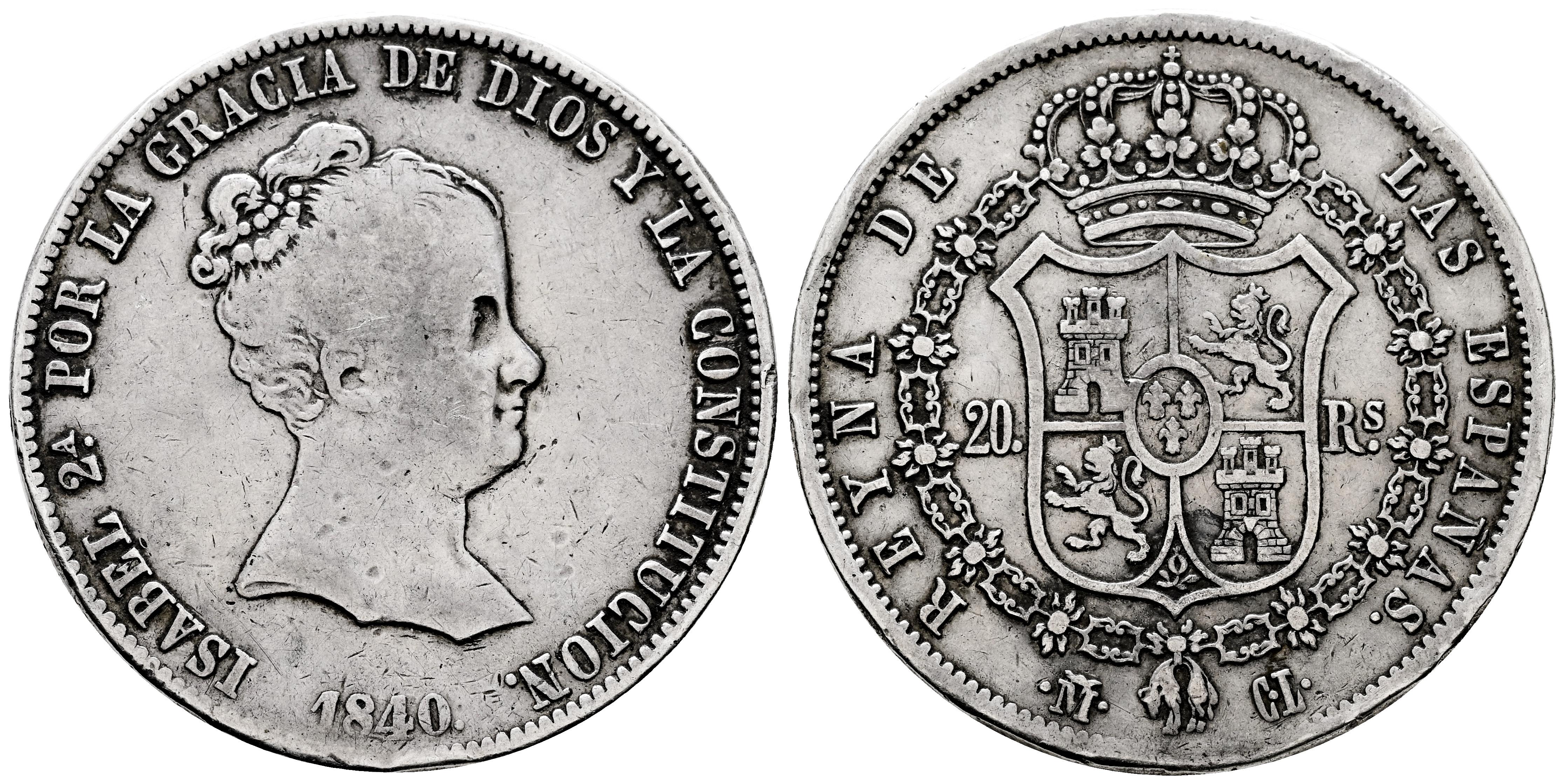 Isabel II (1833-1868). 20 reales. 1840. Madrid. CL. (Cal-584). Ag. 26,87 g. Leves golpecitos. Extremadamente rara, solamente 4 ó 5 ejemplares conocidos. MBC-/MBC. Est...3000,00.