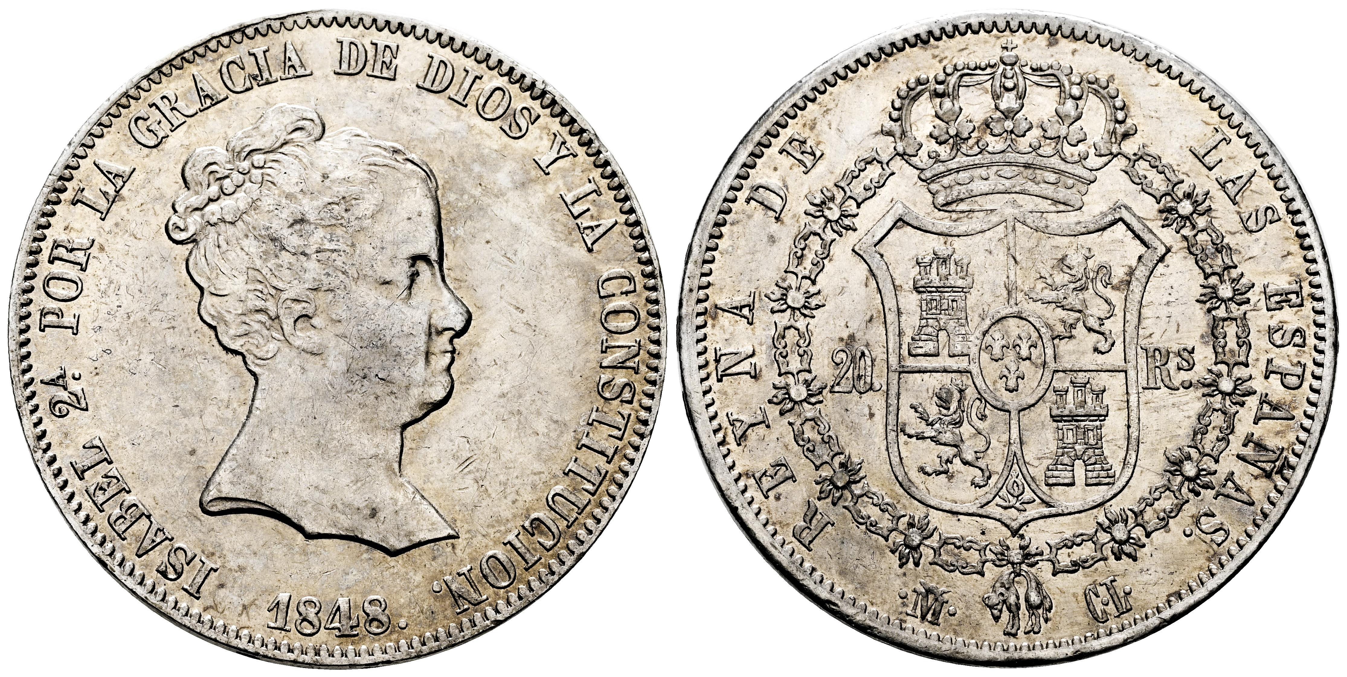 Isabel II (1833-1868). 20 reales. 1848. Madrid. CL. (Cal-587). Ag. 26,10 g. Restos de brillo original con un ligero tono dorado. Leves marquitas. Muy escasa en esta conservación. EBC-/EBC. Est...600,00.