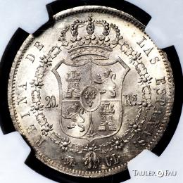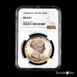 Isabel II (1833-1868). 20 reales. 1850. Madrid. CL. (Cal-591). Ag. Magnífico ejemplar con un excelente atractivo visual. Pleno brillo original. Rarísima en esta conservación. Encapsulada por NGC como MS 63+ (Top Pop), el mejor ejemplar conservado según los censos de NGC y PCGS. Est...5000,00.