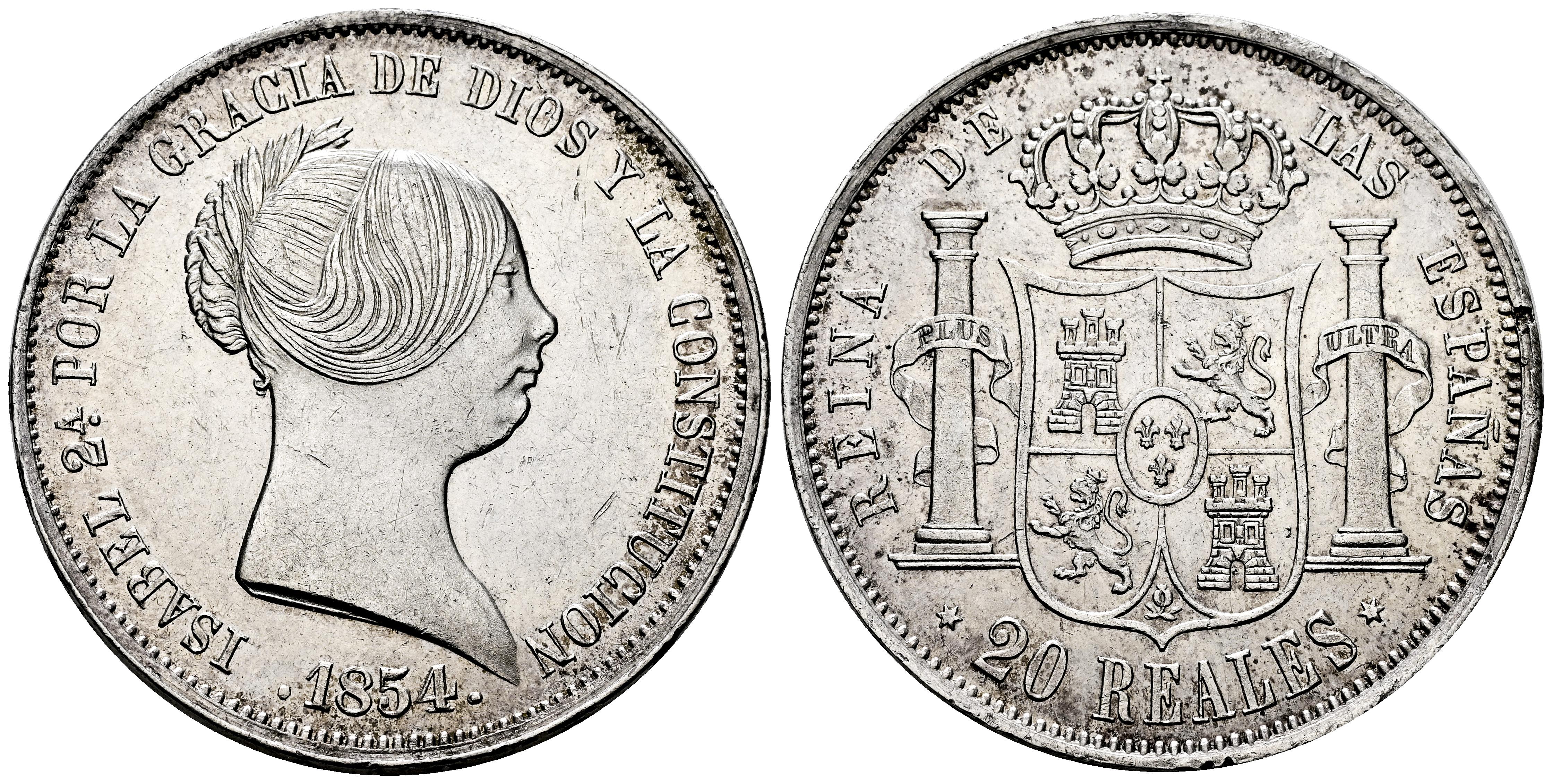 Isabel II (1833-1868). 20 reales. 1854. Madrid. (Cal-596). Ag. 25,89 g. Rayitas y golpecitos en canto. Ex Áureo (19/06/2001), lote 1092. EBC-/EBC. Est...250,00.