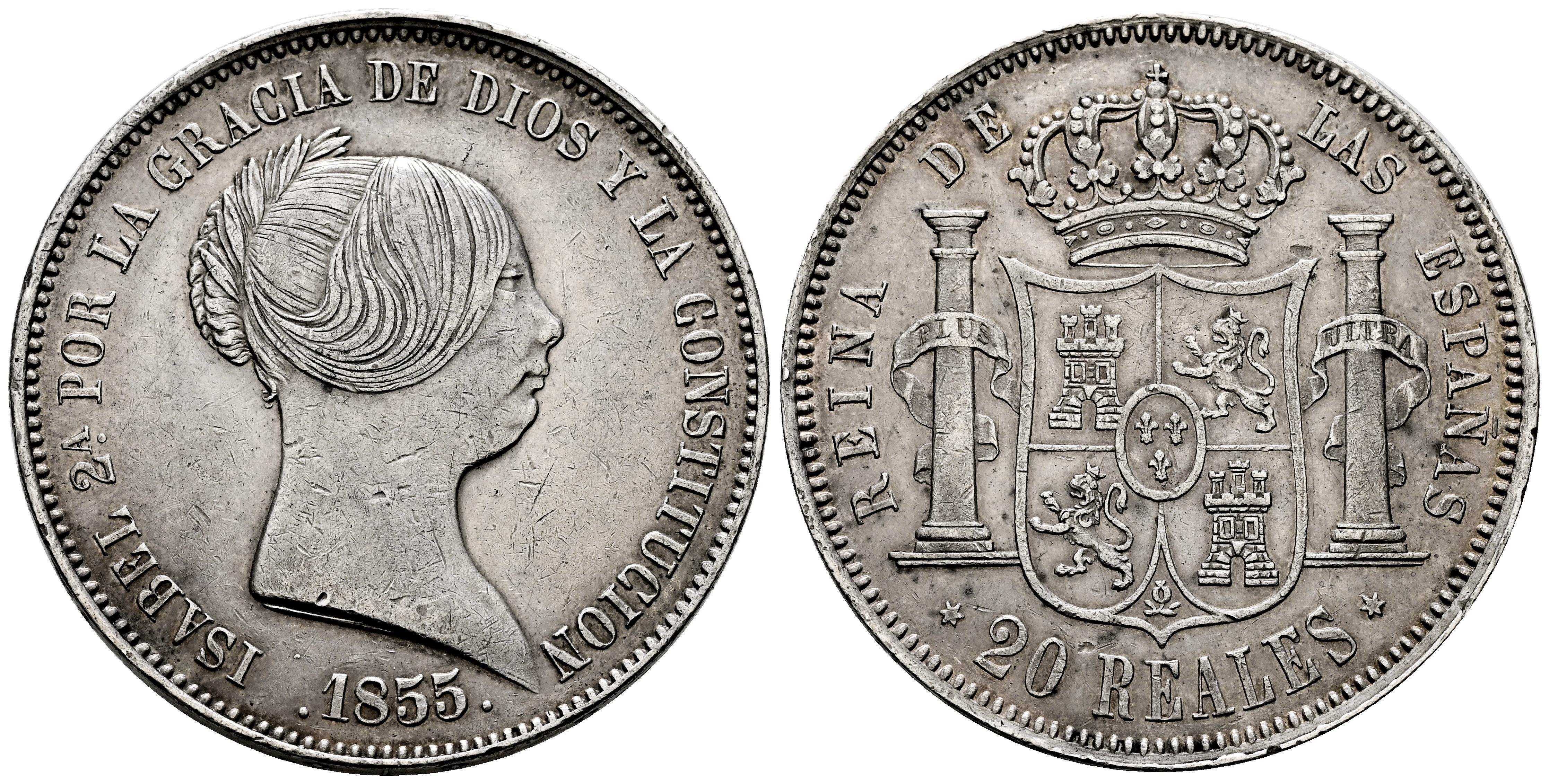 Isabel II (1833-1868). 20 reales. 1855. Madrid. (Cal-597). Ag. 25,80 g. Marquitas. Ligero tono. MBC+. Est...180,00.