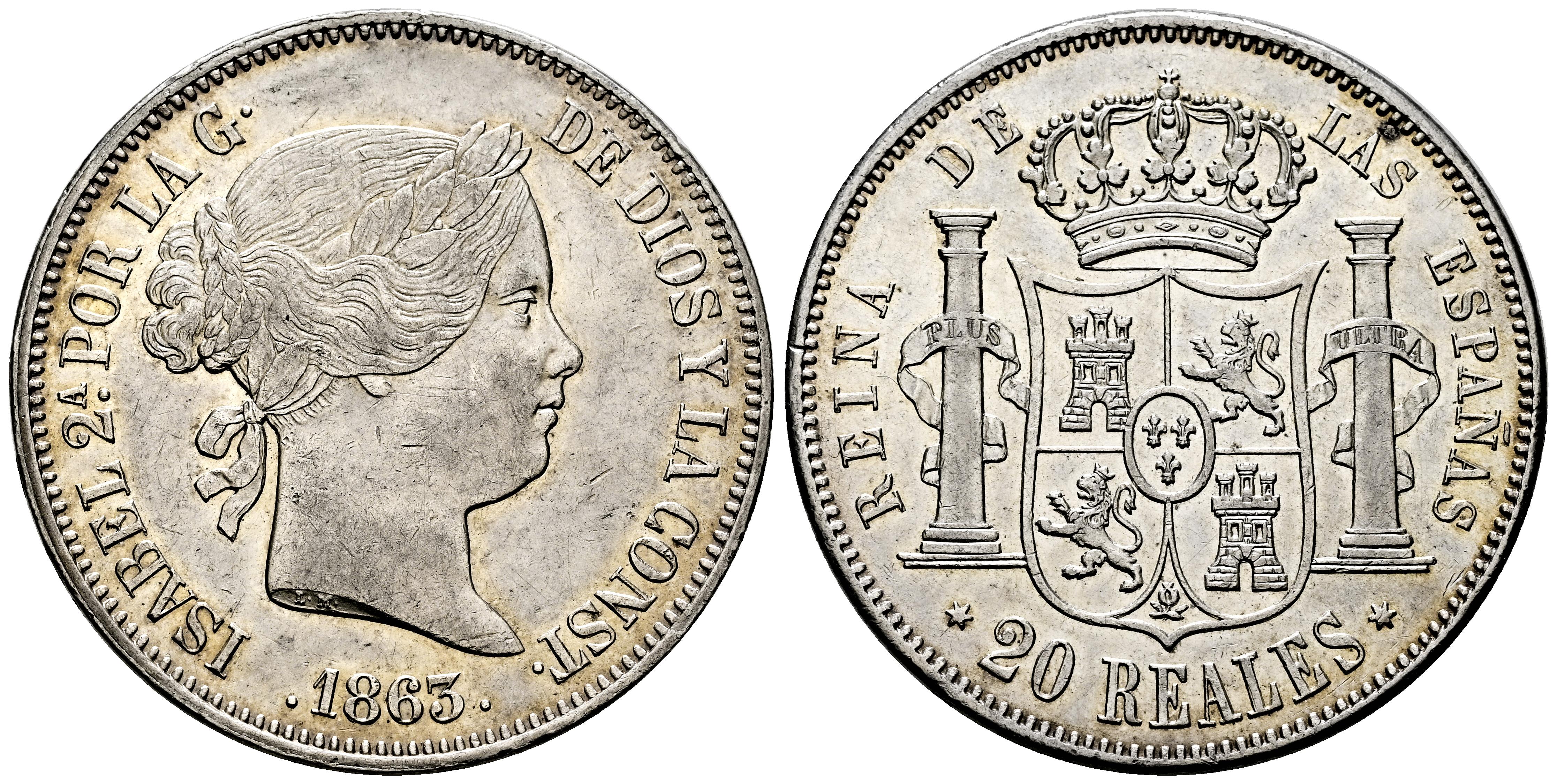 Isabel II (1833-1868). 20 reales. 1863. Madrid. (Cal-621). Ag. 25,89 g. Ligero tono. Leves marquitas. Rara. EBC/EBC+. Est...500,00.