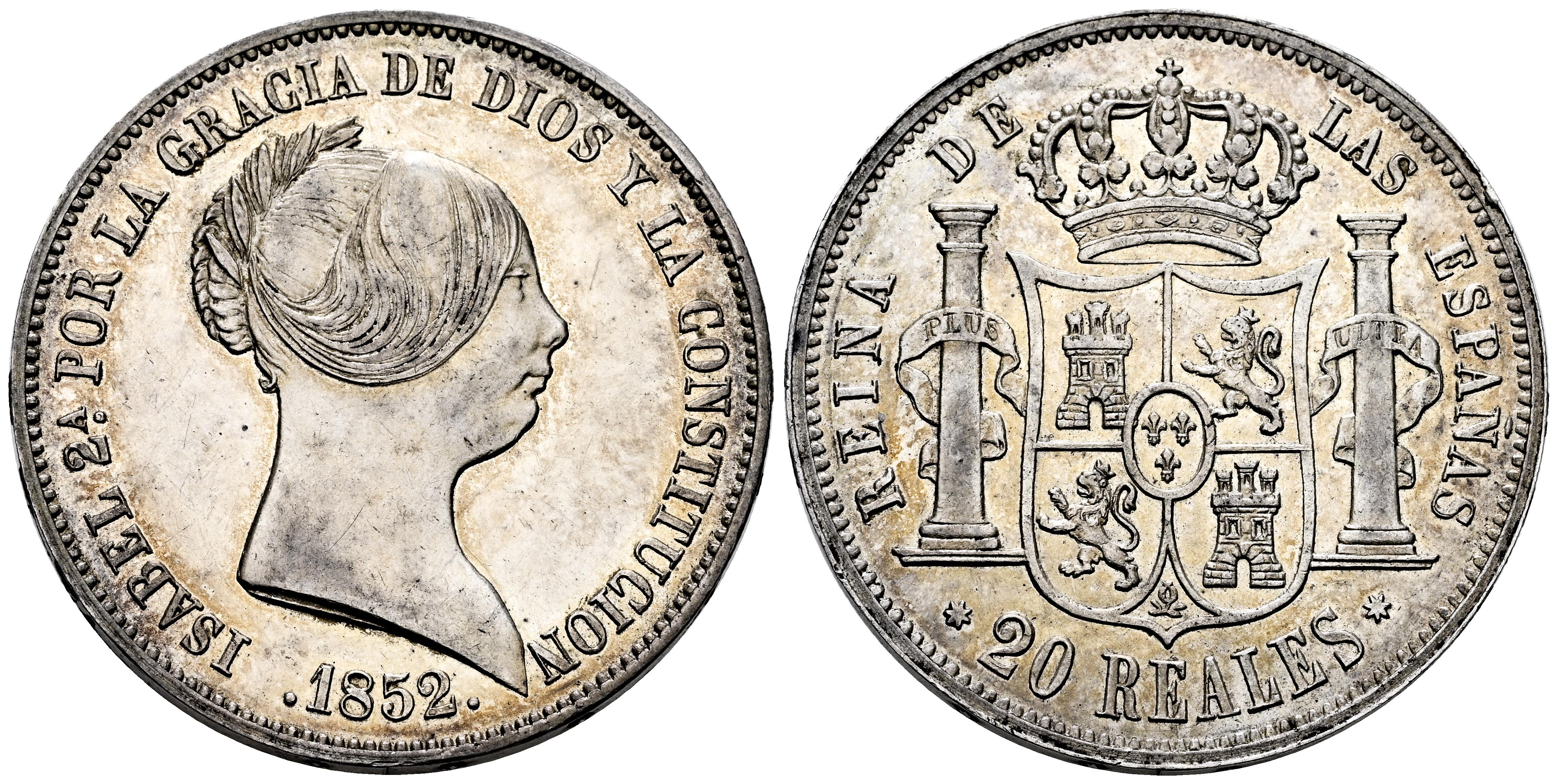 Isabel II (1833-1868). 20 reales. 1852. Sevilla. (Cal-628). Ag. 25,95 g. Precioso ejemplar con pleno brillo original y un ligero tono dorado superficial que acentúa su atractivo visual. Ínfimas y suaves rayitas en anverso. Magnífica y rara en esta conservación. EBC+/SC-. Est...1000,00.