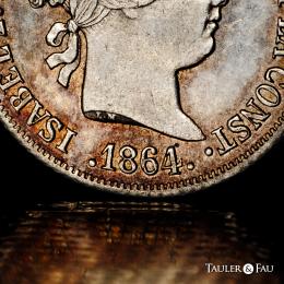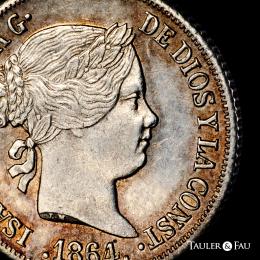 Isabel II (1833-1868). 10 centavos. 1864. Manila. (Cal-649). Ag. 2,59 g. Restos de brillo original. Suave tono de monetario. Golpecito en el canto. Muy rara, más en esta conservación. Encapsulada por NGC como AU 58 (Top Pop), el mejor ejemplar conservado en el censo de NGC. Est...1200,00.