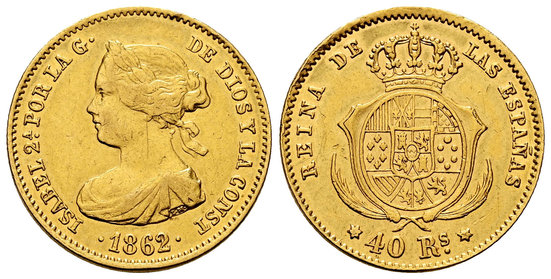 Isabel II (1833-1868). 40 reales. 1862/1. Madrid. (Cal-680). Au. 3,34 g. Sobrefecha. Estuvo en aro. Escasa. MBC/MBC+. Est...200,00.