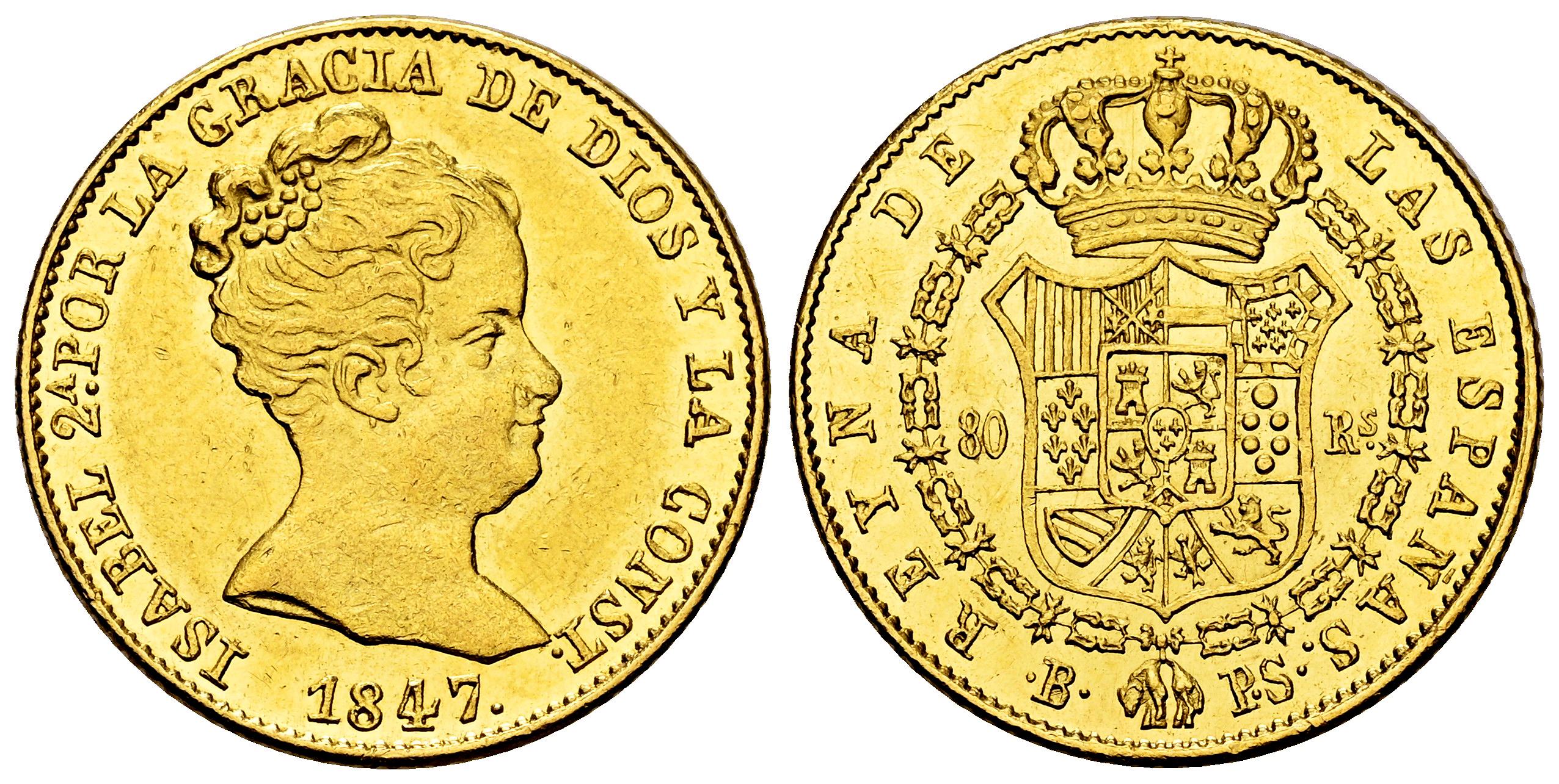Isabel II (1833-1868). 80 reales. 1847. Barcelona. PS. (Cal-716). Au. 6,75 g. Pleno brillo original. Rara en esta conservación. EBC+/SC-. Est...700,00.