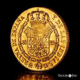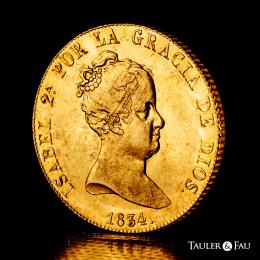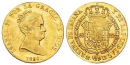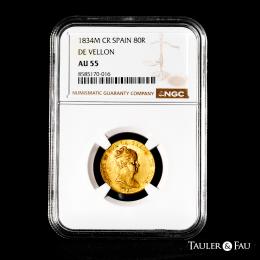 Isabel II (1833-1868). 80 reales. 1834. Madrid. CR. (Cal-719). Au. 6,64 g. Brillo original. Leves rayas de acuñación. Rara en esta conservación. Encapsulada por NGC como AU 55 (Top Pop), el mejor ejemplar conservado en el censo de NGC. Est...900,00.