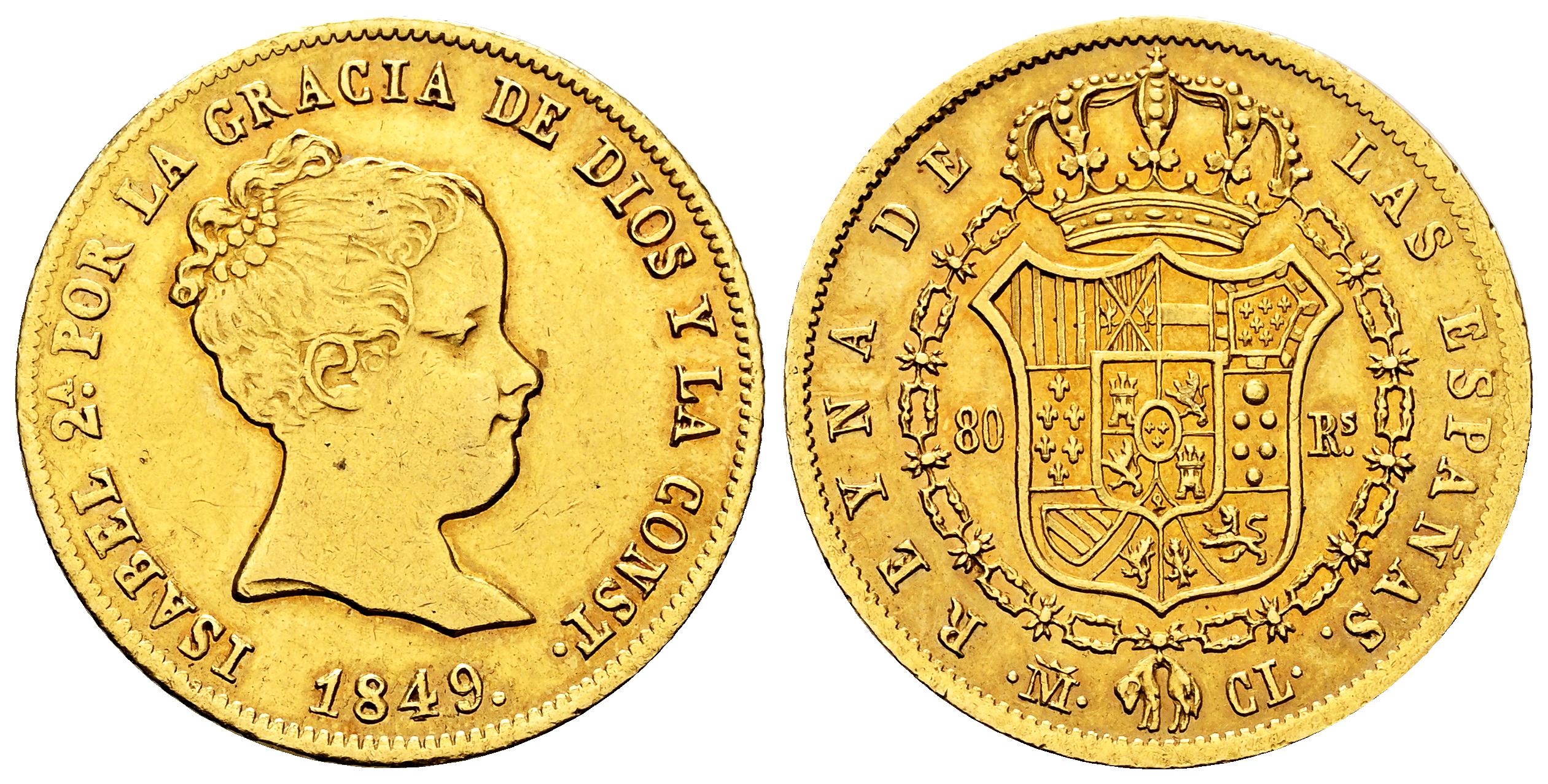Isabel II (1833-1868). 80 reales. 1849. Madrid. CL. (Cal-736). Au. 6,72 g. Bonito color. Golpe en el canto. Rara. EBC/EBC+. Est...750,00.