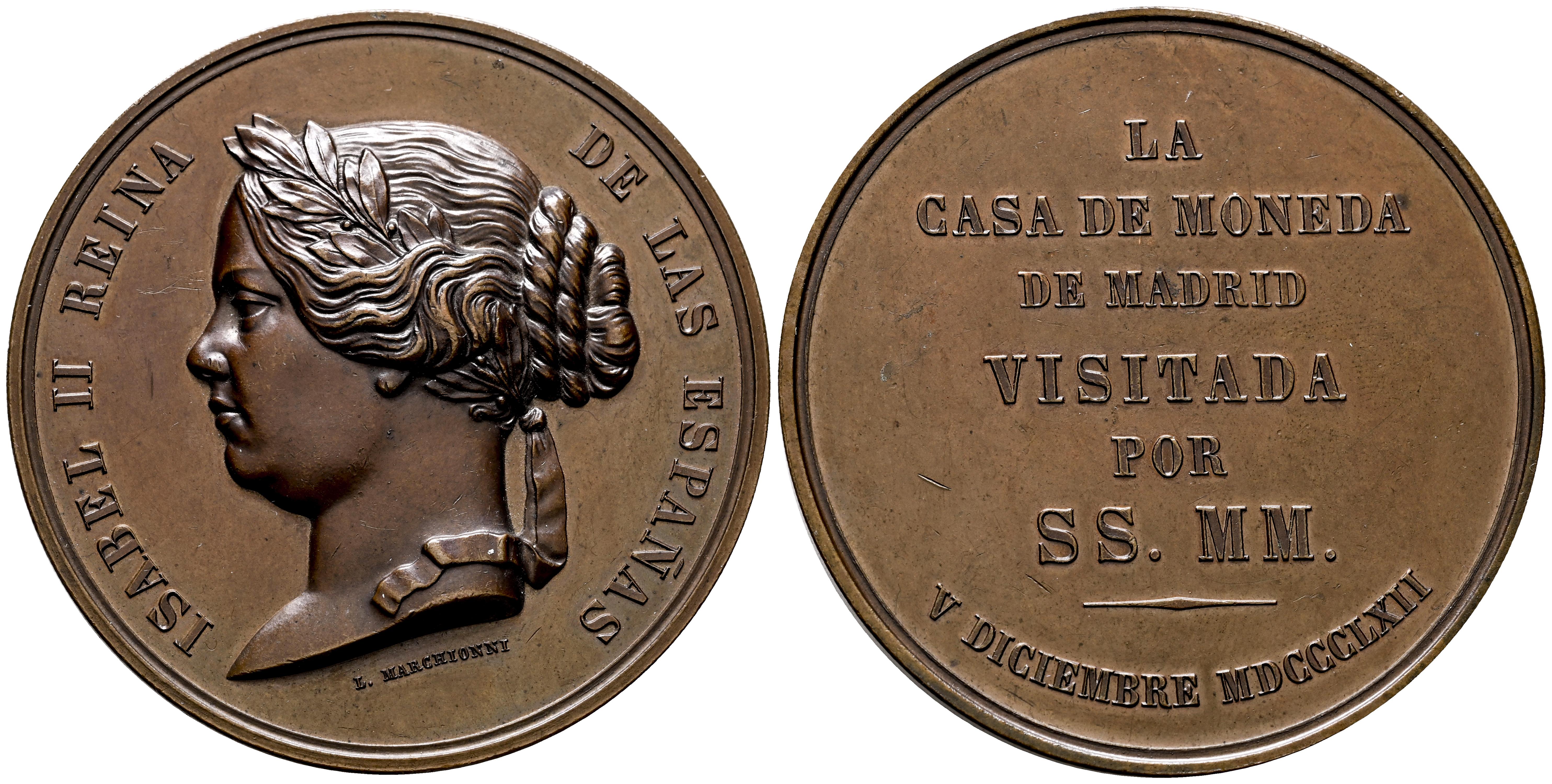 Isabel II (1833-1868). Medalla. 1862. Madrid. (Vives-4439/40 var.). (Vq-14363). (Rah-645). Ae. 53,68 g. Visita a la Casa de Moneda de Madrid. Grabador: L. Marchionni. 50mm. EBC+. Est...120,00.