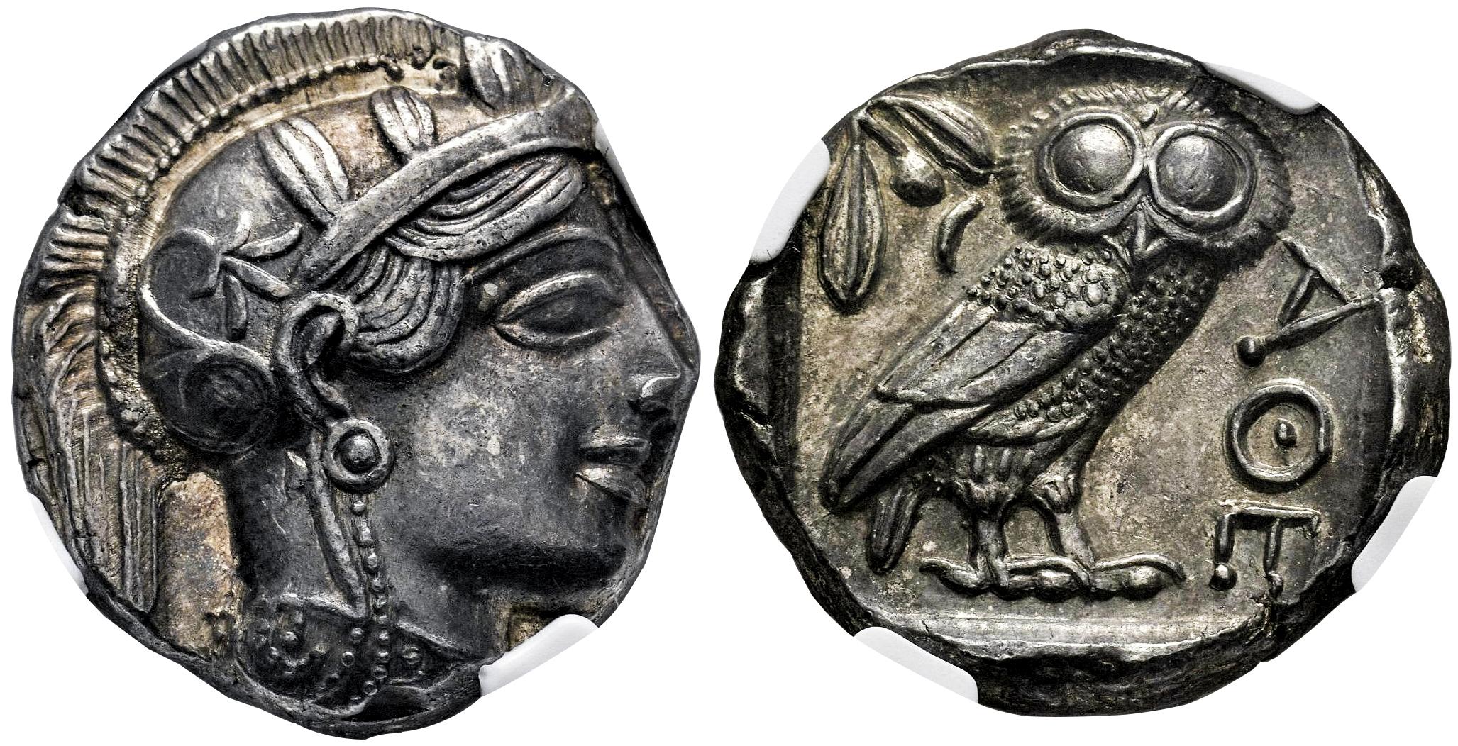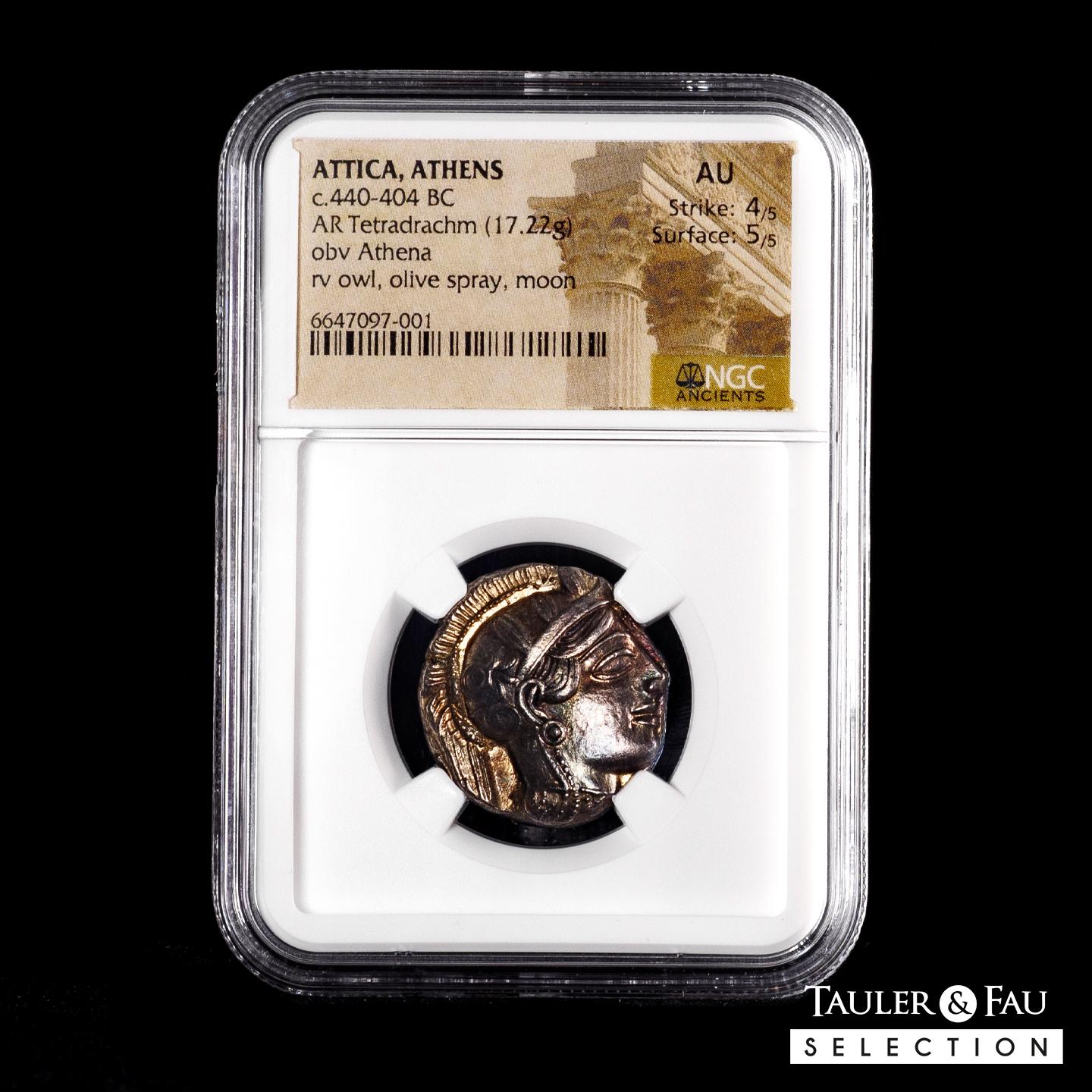 Attica. Atenas. Tetradracma. 454-404 a.C. (Kroll-8). (Hgc-4, 1597). (Sng Cop-31). Anv.: Cabeza de Atenea a la derecha, con casco ático con cresta decorado con tres hojas de olivo sobre la visera y palmeta en espiral sobre cuenco, pendiente redondo con protuberancia central y collar de perlas. Rev.: Búho en pie a la derecha con la cabeza al frente, ramita de olivo y creciente detrás, ΑΘΕ delante; todo dentro de un cuadrado incuso . Ag. 17,22 g. Cresta y collar visibles, casi completos. Bonita pátina. Encapsulada por NGC como AU, strike 4/5, surface 5/5. Est...1000,00.