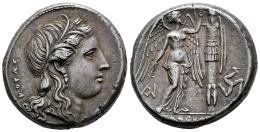 Sicilia. Siracusa. Tetradracma. 310-305 a.C. Tiempos de Agathokles. (Ierardi-103e). (Hgc-2, 1536). (Boston MFA-463 = Warren 406). Anv.: Cabeza de Kore a la derecha, con una corona de espigas y un pendiente único; KOPAΣ detrás. Rev.: Niké en pie a la derecha, erigiendo un trofeo a la derecha; monograma abajo a la izquierda, triskeles a la derecha, AΓAΘOKΛEOΣ en exergo. . 16,68 g. Suave pátina. Muy bien centrada. Rara. Con la usurpación de Agathokles en el 317 a. C., Siracusa volvió a monopolizar el derecho de acuñación de monedas en toda Sicilia, de forma aún más marcada que en la época de Dionysios. Sin embargo, el reinado de Agathokles, como señala Malcolm Bell (Morgantine Studies I, 1981), «marcó un hito tanto para las artes en Sicilia como para la política. El cambio de un estilo clásico tardío conservador a las nuevas modalidades del período helenístico temprano se produjo muy rápidamente, en el plazo de una década, y coincidió con la sustitución del gobierno democrático por la nueva monarquía. Esto es claramente perceptible en las monedas que... documentan la plena aceptación del estilo helenístico temprano».