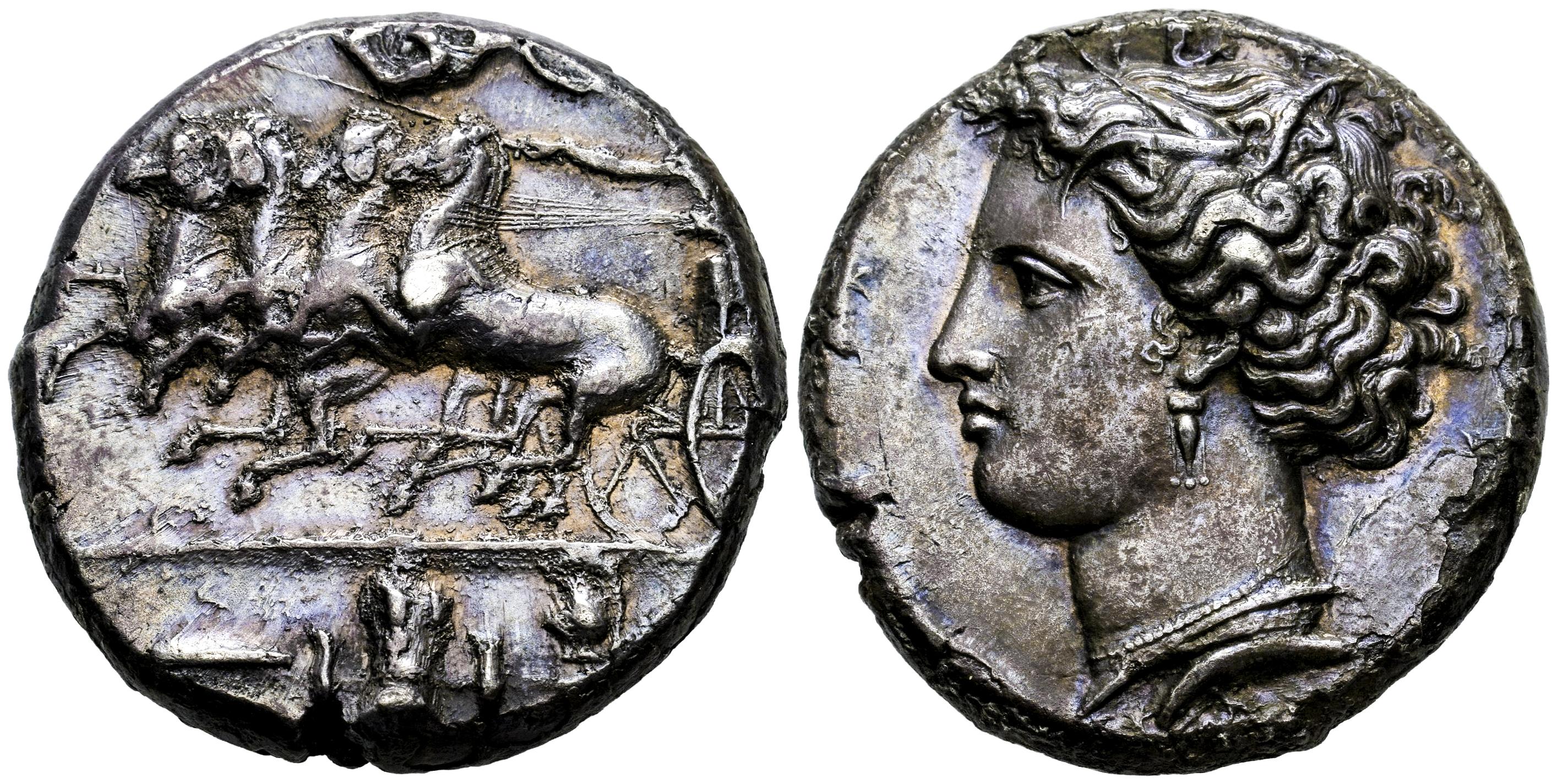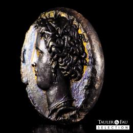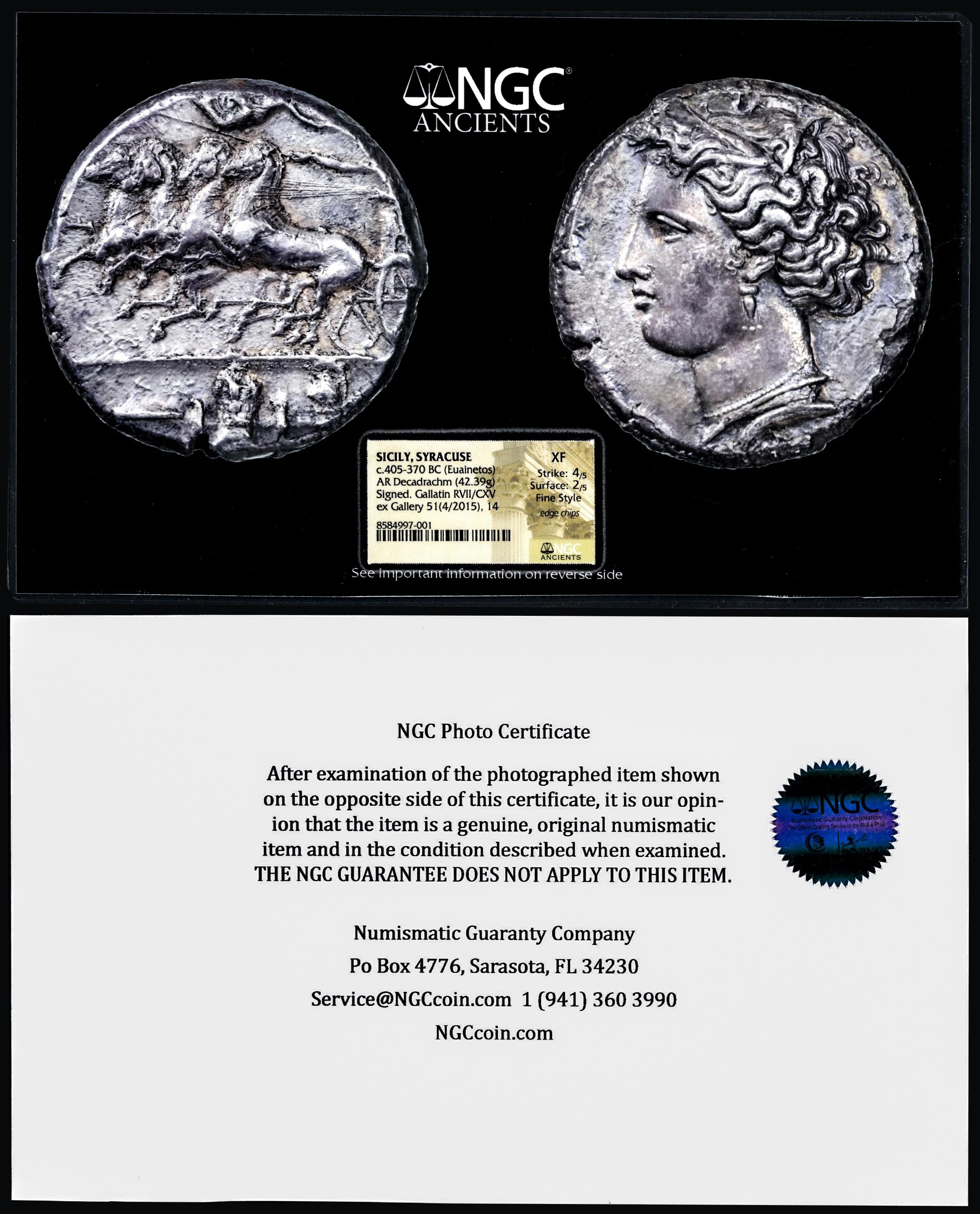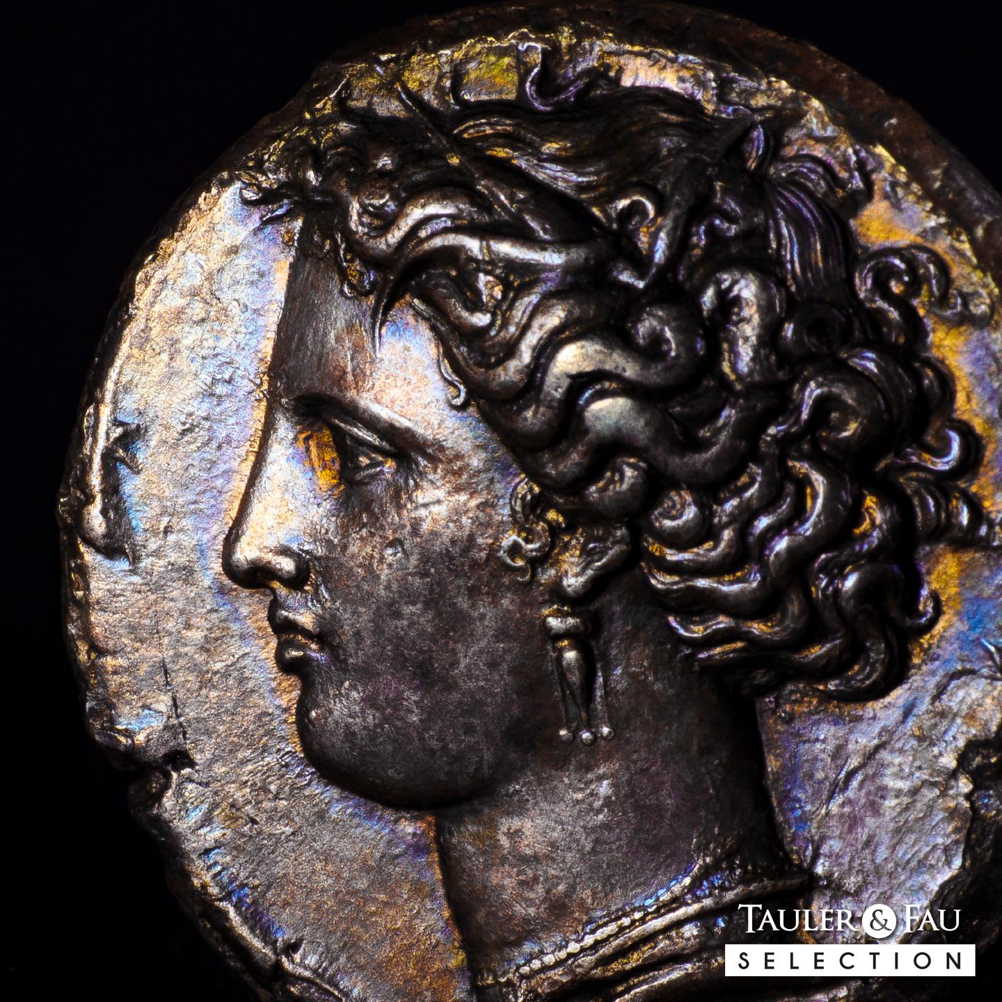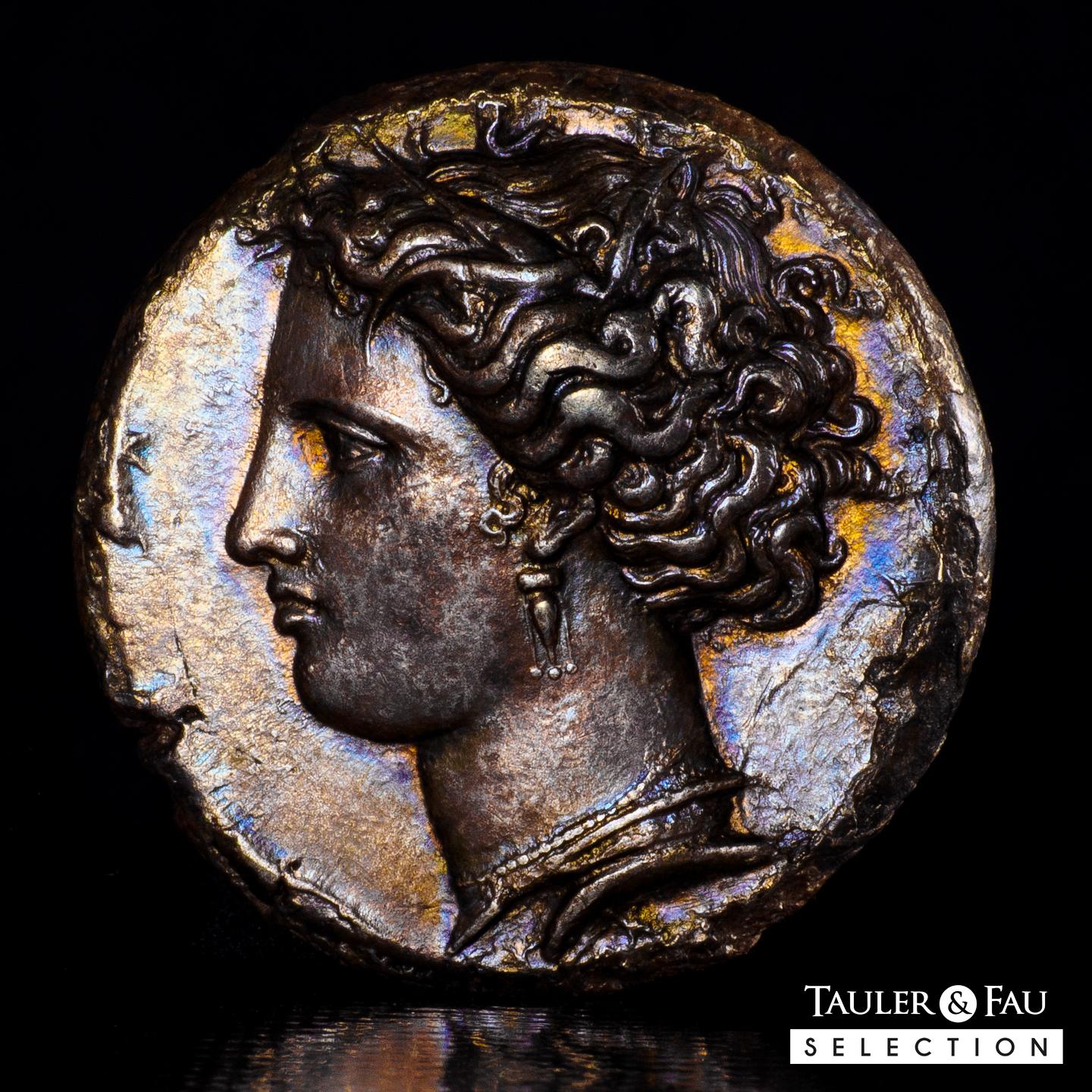 Consideradas por muchos como las monedas más bellas jamás acuñadas, las inmensas decadracmas de plata de Siracusa del último cuarto del siglo V a.C. representan la plena madurez del arte escultórico griego clásico. Siracusa, la principal ciudad griega de Sicilia, ya había producido monedas de extraordinaria belleza durante casi un siglo cuando, hacia el 415 a.C., los grabadores comenzaron a firmar sus cuños.