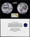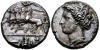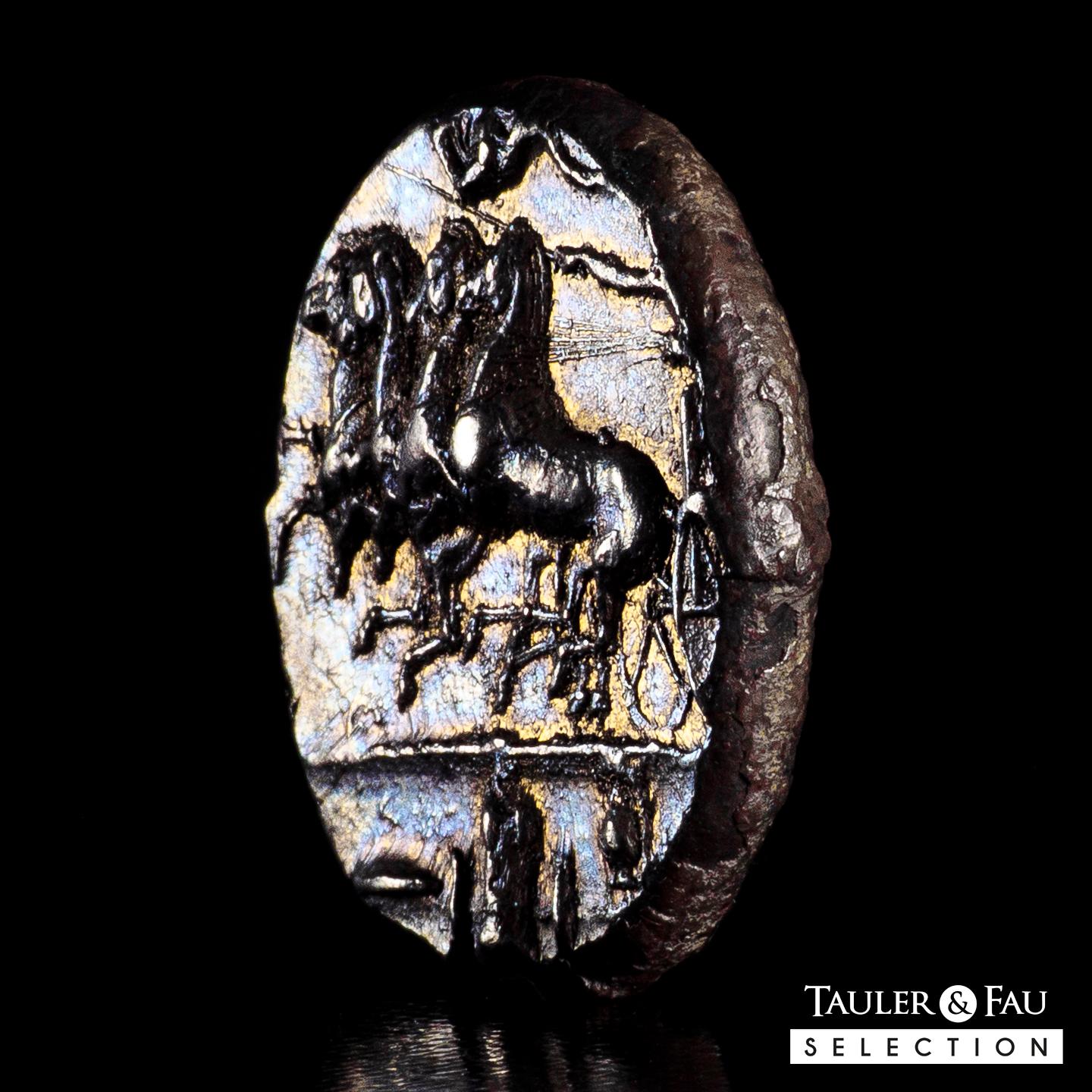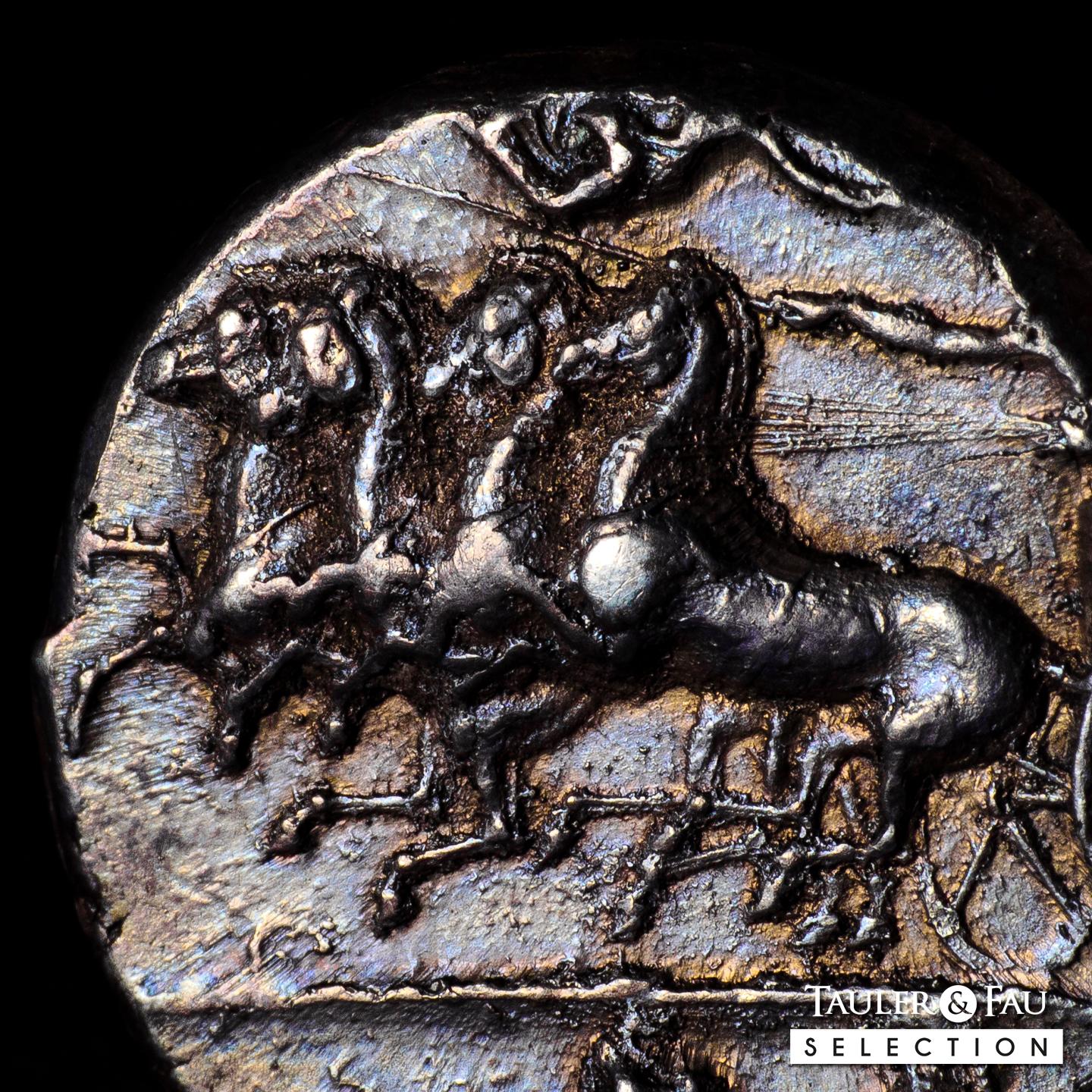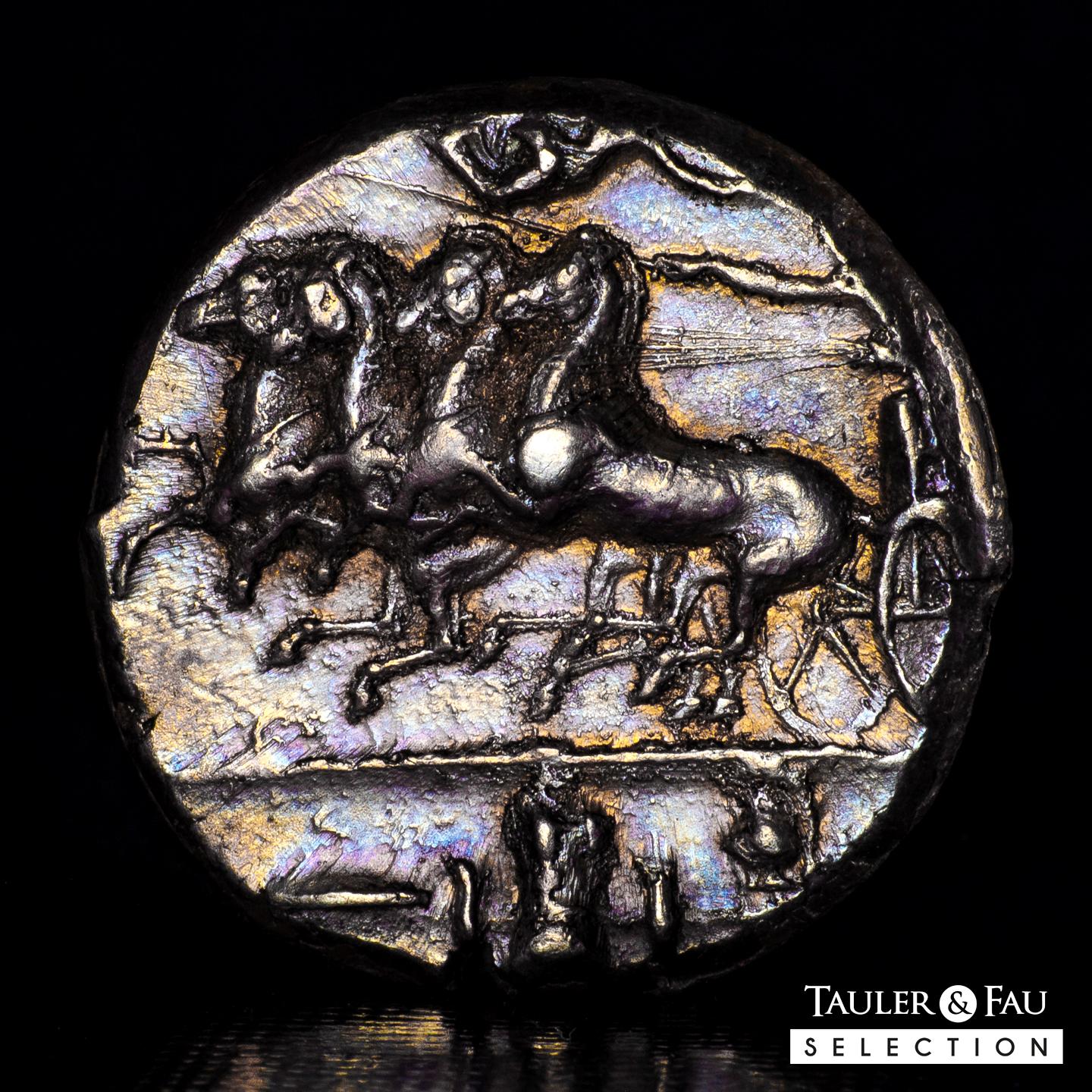 Entre ellos destacaron los maestros Kimon y Euainetos, cuyos grandes decadracmas de plata capturaron el espíritu de la revolución artística e intelectual que recorría el mundo griego. El decadracma de Euainetos se convirtió en un arquetipo ampliamente imitado en la numismática griega, y su retrato de Aretusa sigue siendo hoy un paradigma de la serena belleza clásica. Est...20000,00.