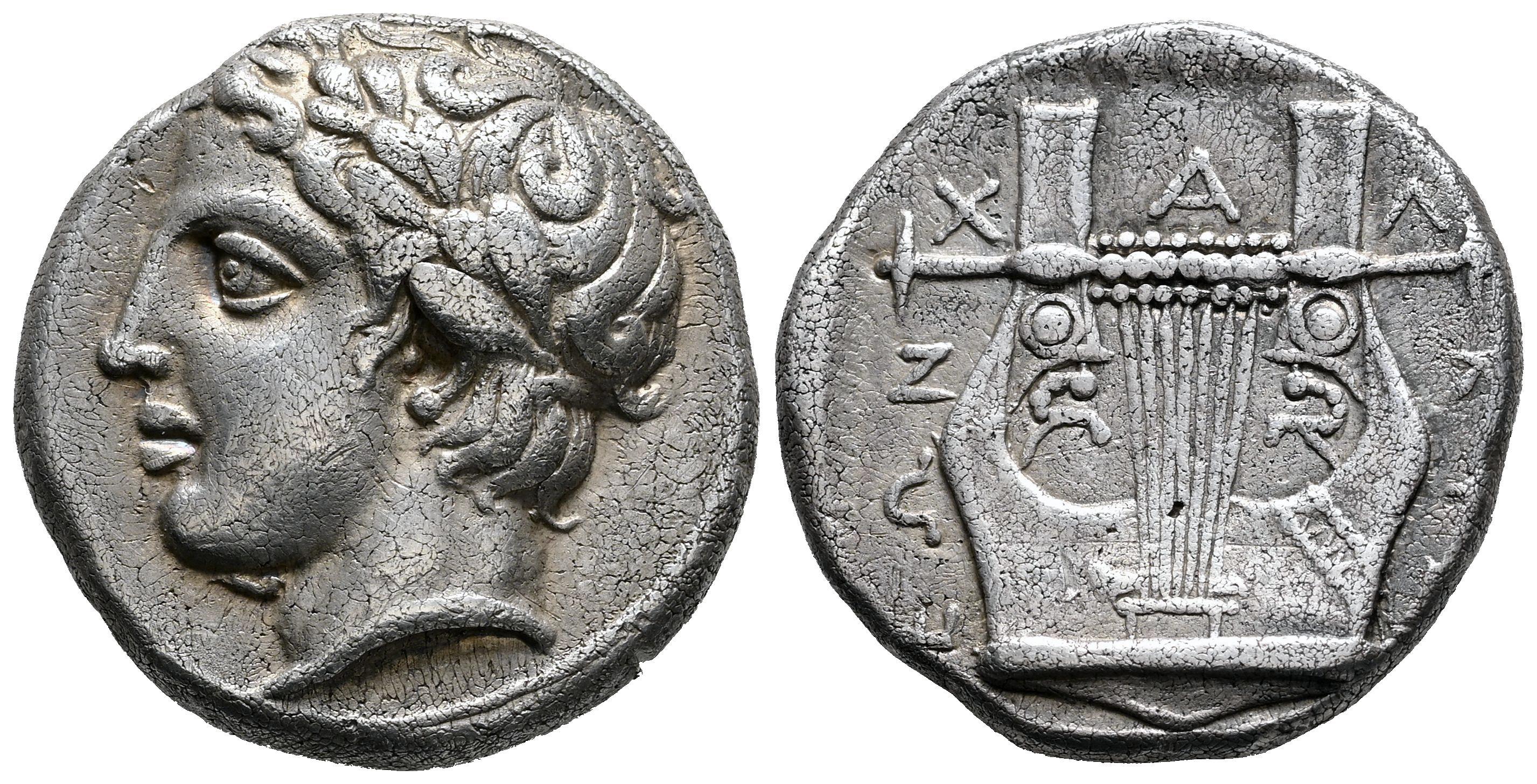 Macedonia. Liga Calcídica. Tetradracma. 417-412 a.C. Olynthos. (Sng Ans-471/3). (Bmc-p 67. 3 (same dies)). Anv.: Cabeza laureada de Apolo izquierda. Rev.: Χ−Α−Λ−ΚΙΔ−ΕΩΝ, kithara. Ag. 14,26 g. Suave tono. Rara. Ex Heritage 3019 (26/04/2012), lote 23062. MBC+. Est...2500,00.