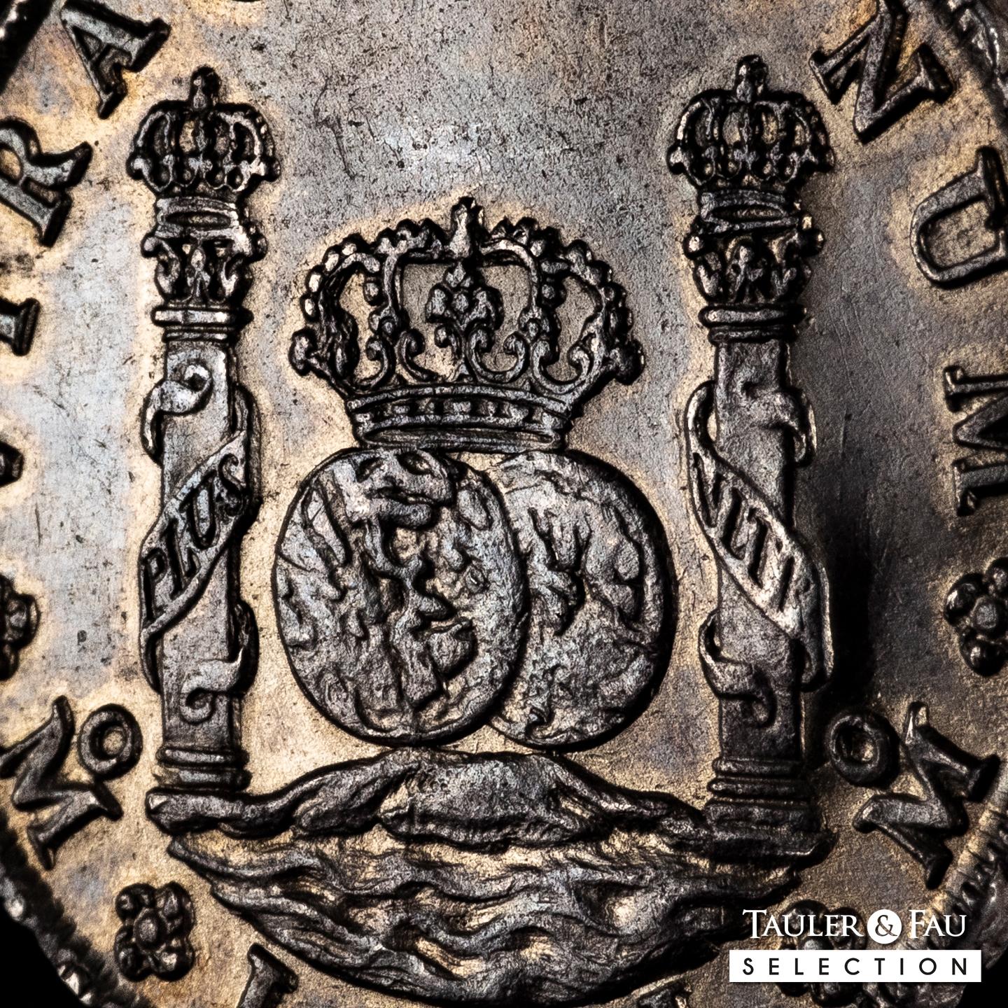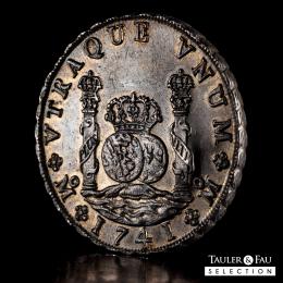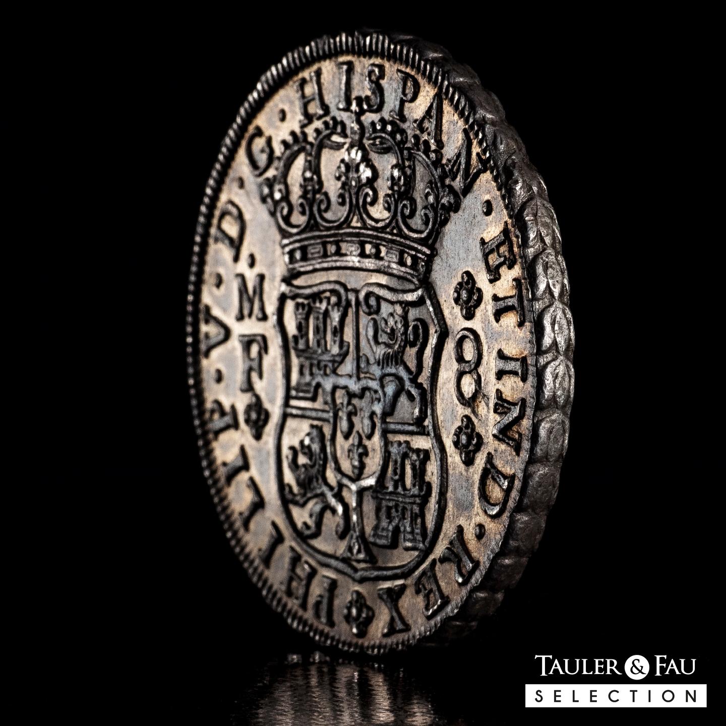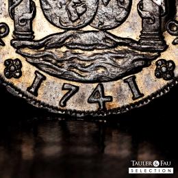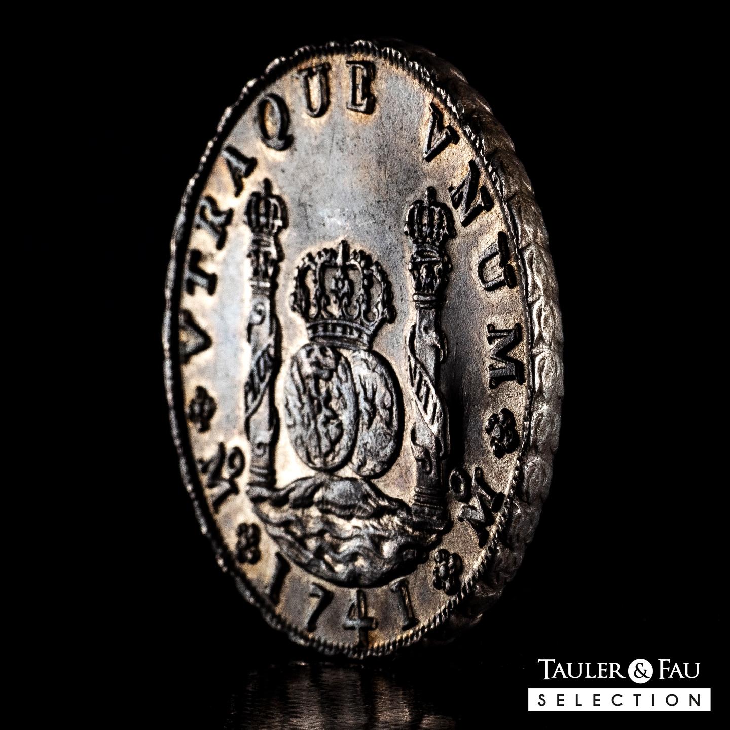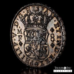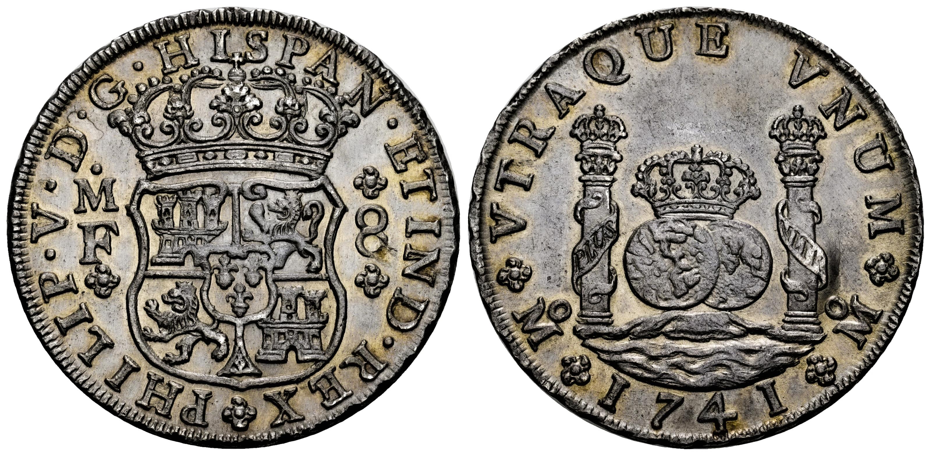 Felipe V (1700-1746). 8 reales. 1741. México. MF. (Cal-1458). Ag. 26,68 g. Mínima hojita en el valor. Ínfimas rayitas superficiales. Suave y atractiva pátina de monetario. Muy escasa en esta conservación. EBC+. Est...1500,00.