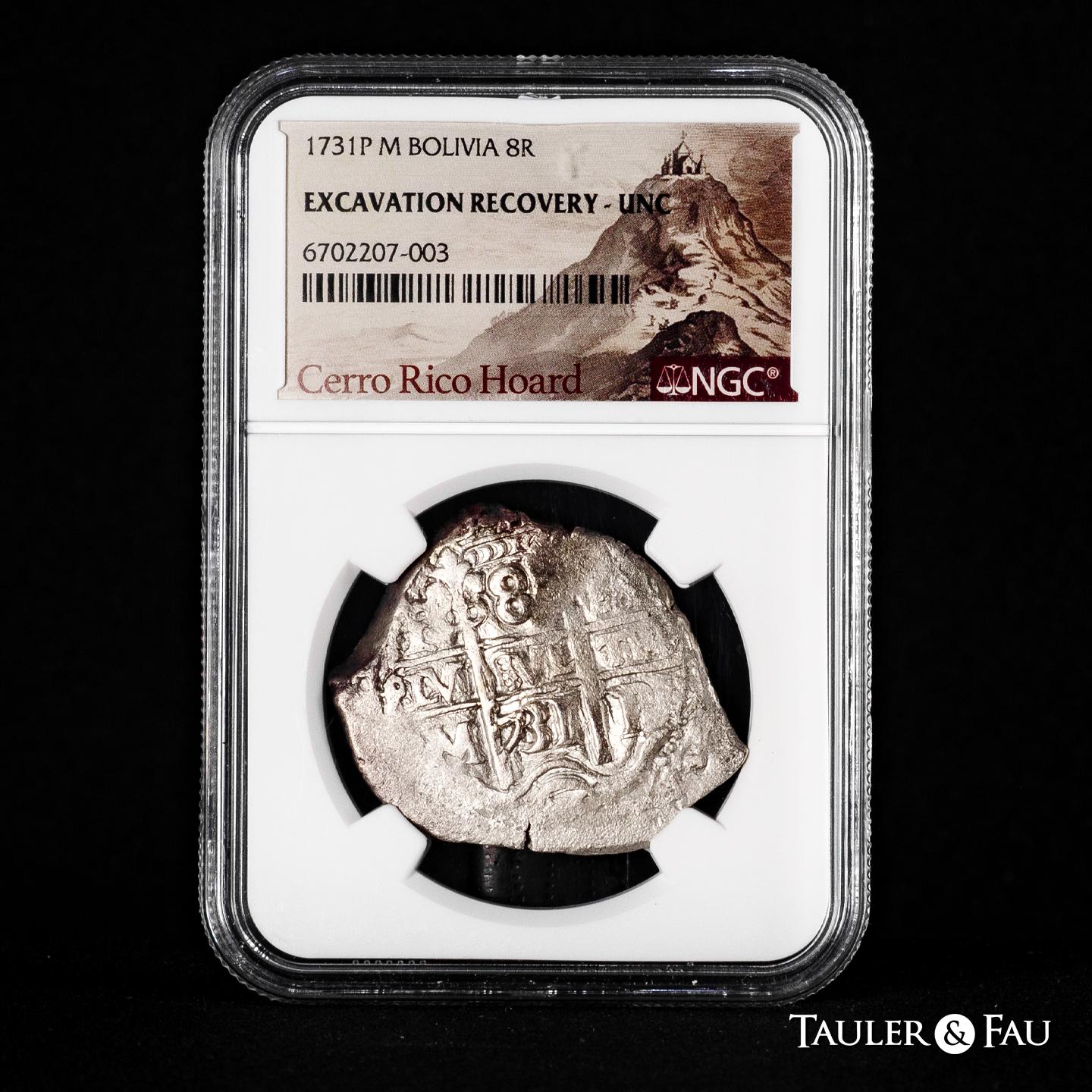 Felipe V (1700-1746). 8 reales. 1731. Potosí. M. (Cal-1564). Ag. Doble fecha, una de ellas parcial. Doble ensayador. Encapsulada por NGC como Excavation Recovery UNC. Etiqueta especial "Cerro Rico Hoard". Est...600,00.