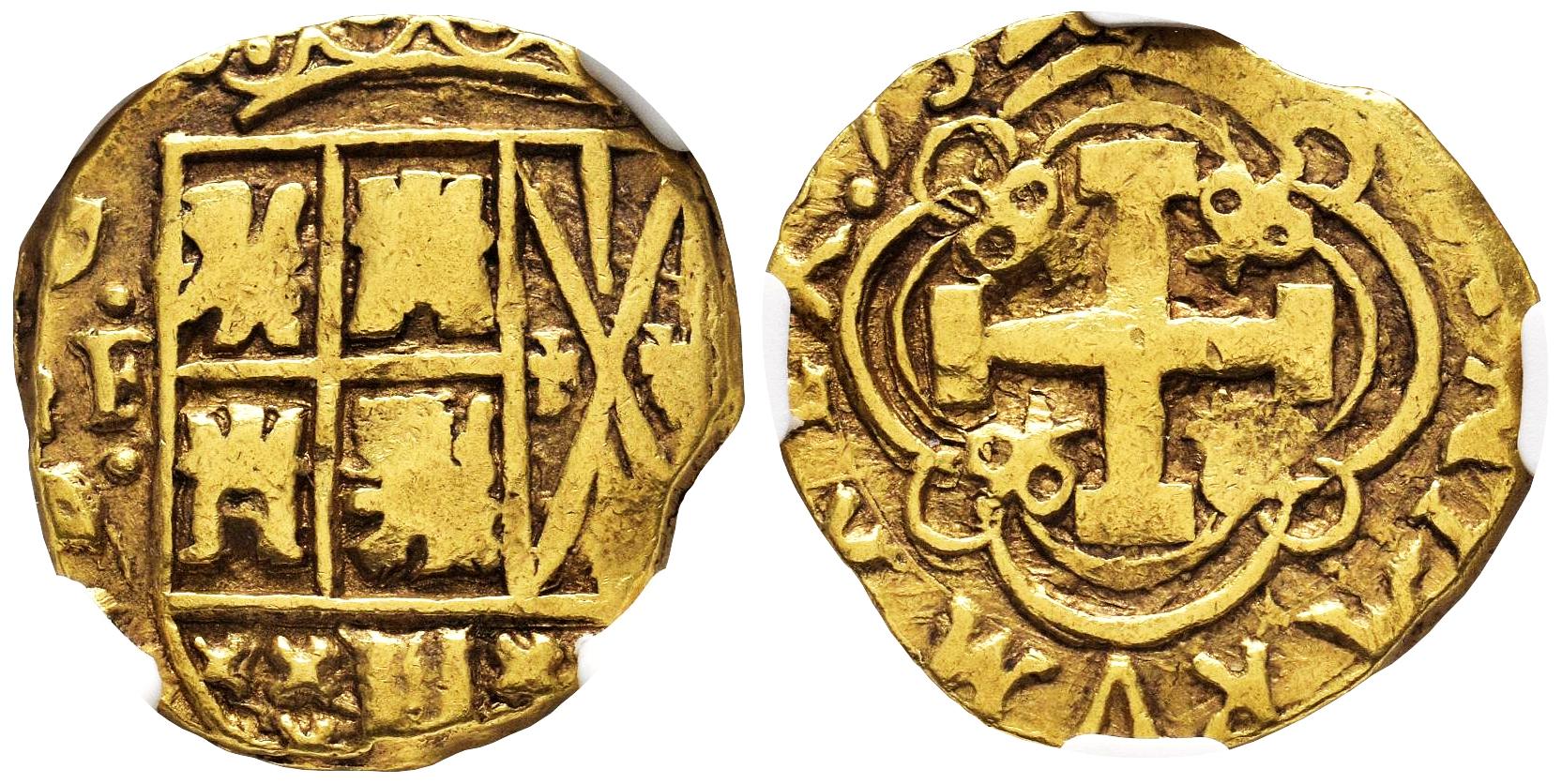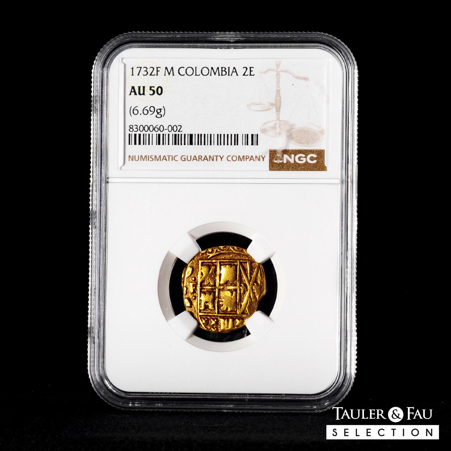 Felipe V (1700-1746). 2 escudos. 1732. Santa Fe de Nuevo Reino. (M). (Cal-1949). (Tauler-294). (Restrepo-M80-12). Au. 6,69 g. No es exagerado afirmar que cualquier macuquina de este periodo con marca de ceca completa, inicial de ensayador que en este caso no es visible y fecha prácticamente íntegra es ya de por sí una rareza. Encapsulada por NGC como AU 50 (Top Pop), el mejor y único ejemplar en el censo de NGC. Est...5000,00.