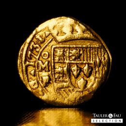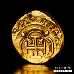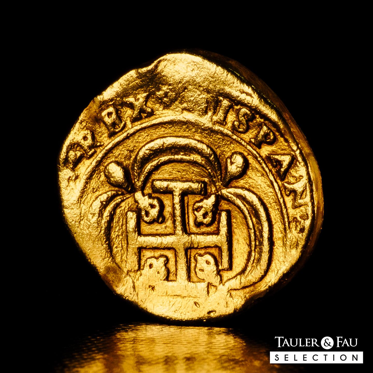 Todo ello resulta aún más difícil de interpretar debido al uso de la moneda como joya, con el canto limado y superficies suavizadas, que dificultan la observación detallada de los relieves. En el reverso, la cruz central se conserva completa, con parte de la leyenda visible.