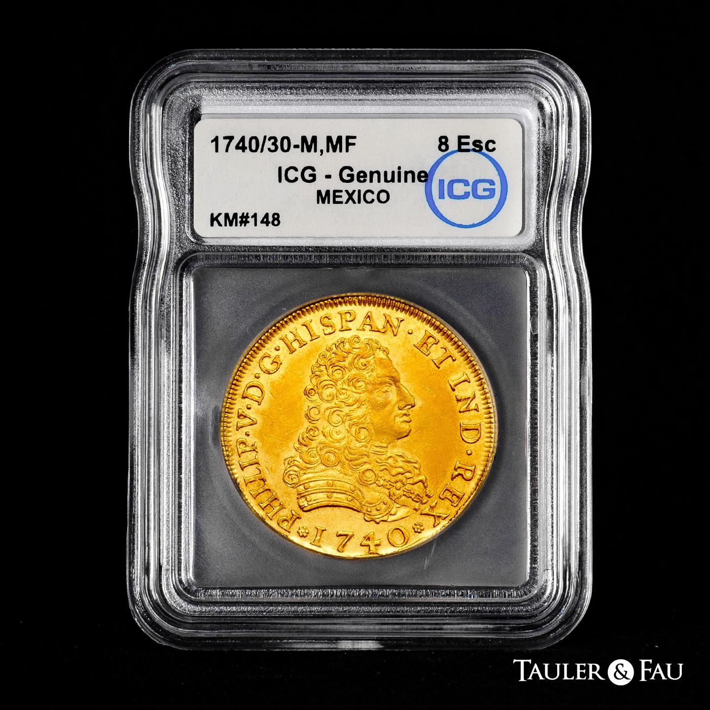 Felipe V (1700-1746). 8 escudos. 1740/30. México. MF. (Cal-2241). (Cal onza-No cita). Au. Sobrefecha. Bonito color. Restos de brillo original. Rara. Encapsulada por ICG como Genuine. EBC. Est...6000,00.