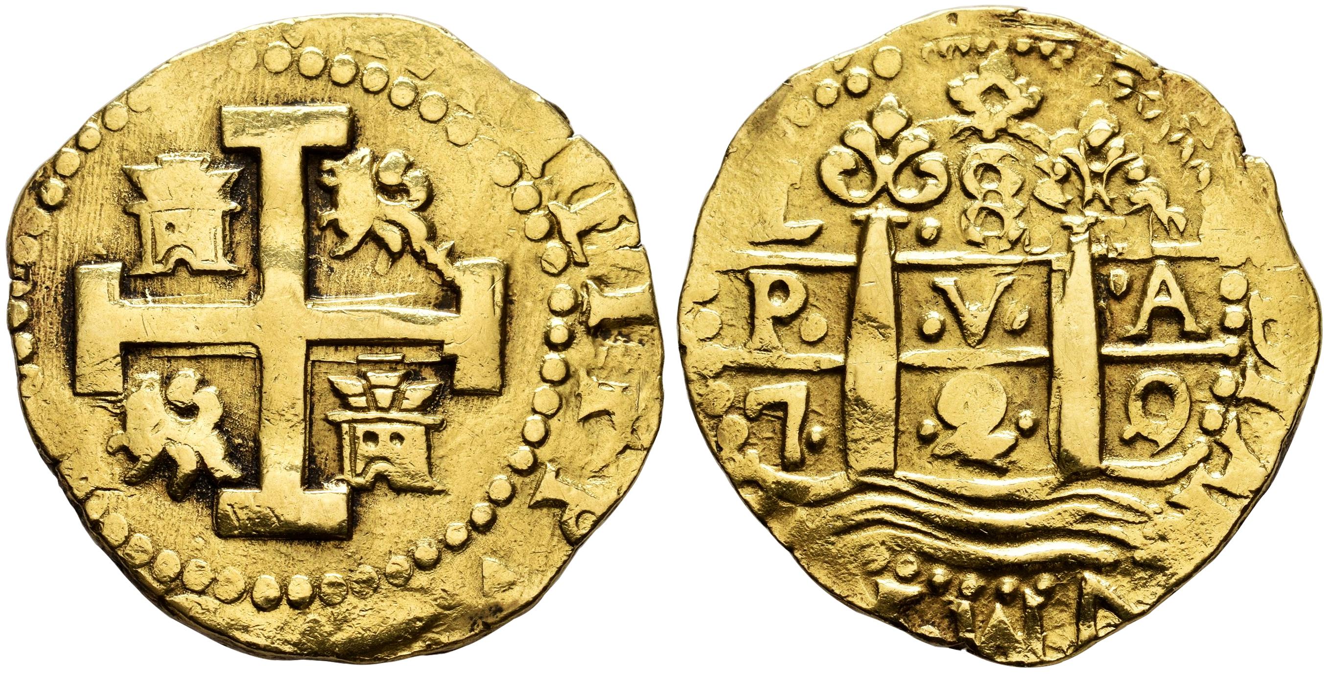 Felipe V (1700-1746). 8 escudos. 1720/19. Lima. (M). (Cal-2131). (Tauler-271). (Cal onza-271). Au. 27,06 g. Clara rectificación del 2/1 y 0/9 en la fecha. Florón sobre el valor. Leves marcas de haber estado engarzada, aun así muy bonita presencia y buena acuñación. Cruz y leones-castillos completos y bien centrados, visible parte del nombre del rey: ...HILIPPV... Ensayador no visible por una ligera doble acuñación y los pilares, olas y fecha completos. Rara. EBC-. Est...7000,00.