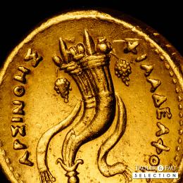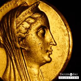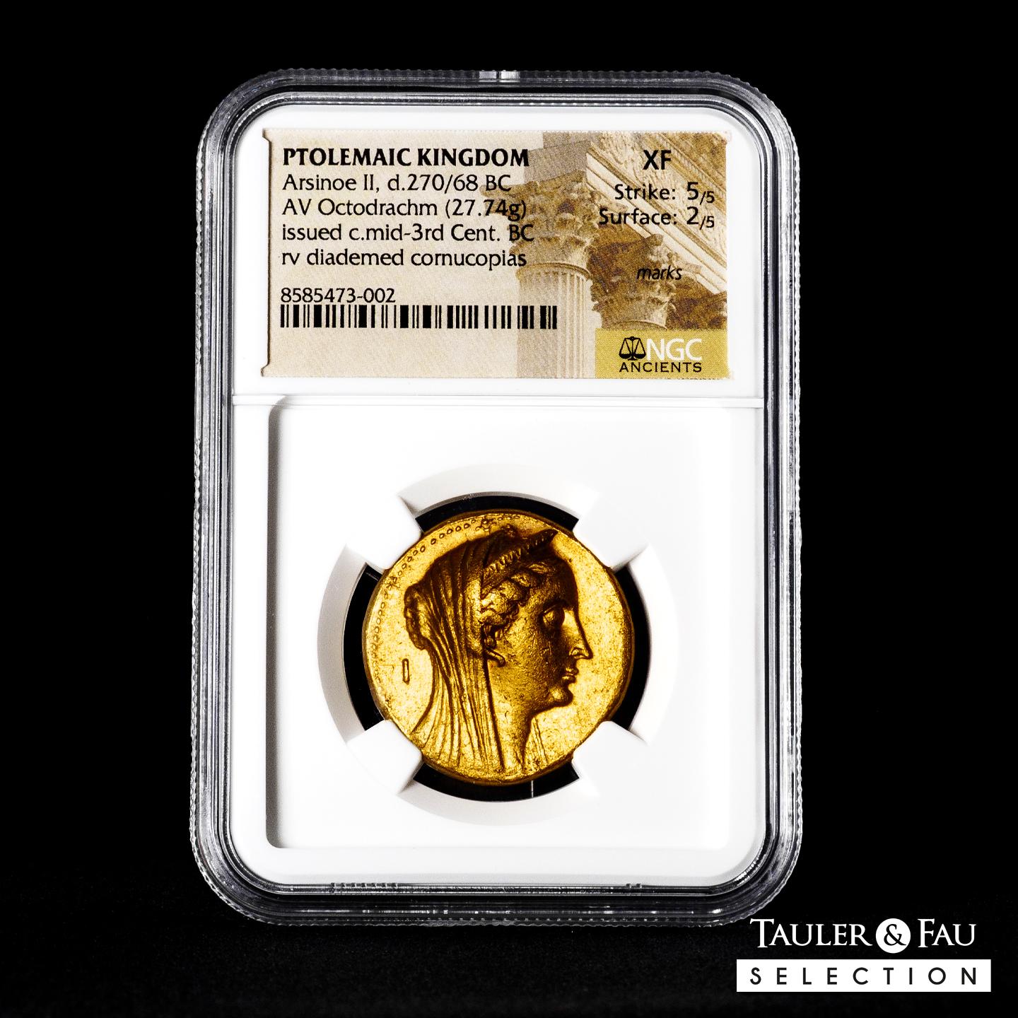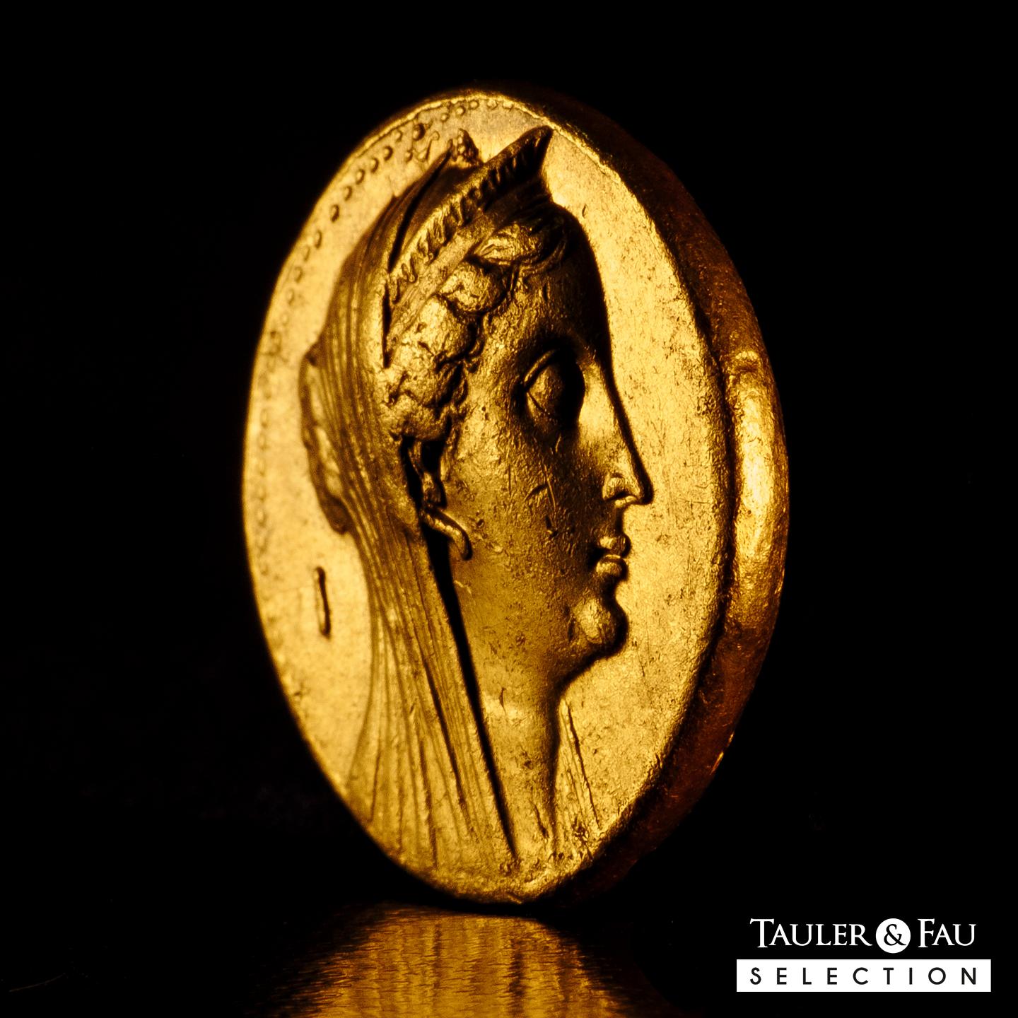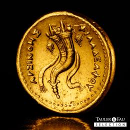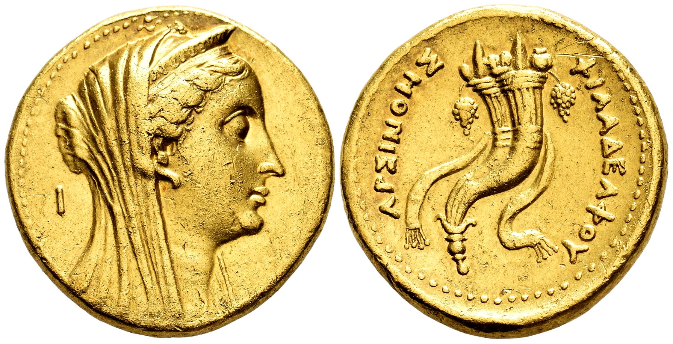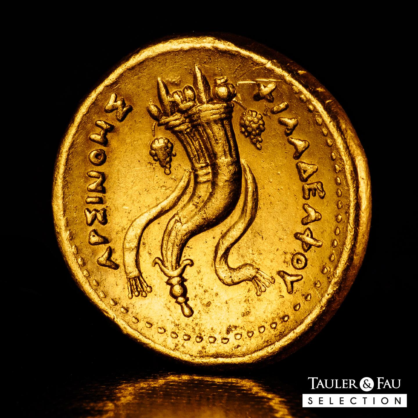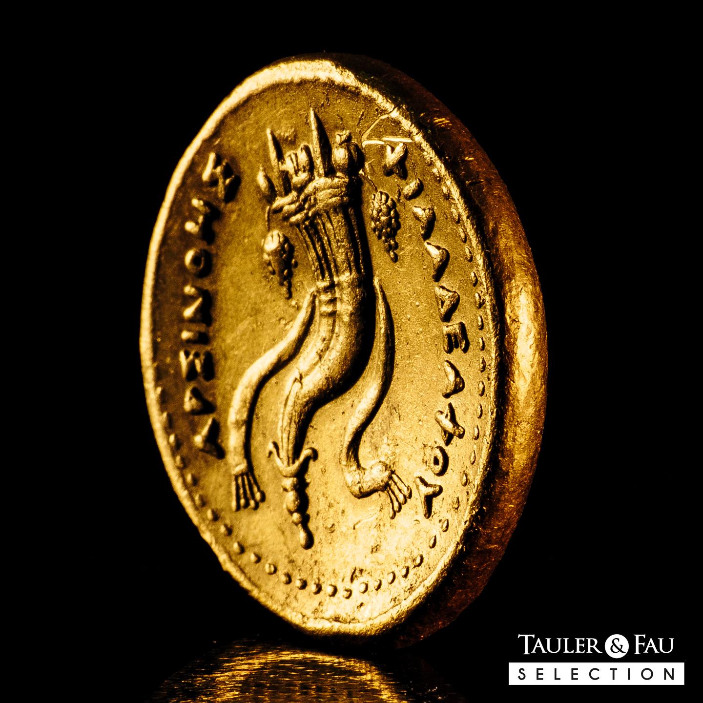 Egipto Ptolemaico. Arsinoe II Philadelphos. Octodracma de oro. 270/68 a.C. Alejandría. Acuñada bajo Ptolomeo II. (Svoronos-471). Anv.: Cabeza con diadema y velo de la deificada Arsinoe II a la derecha; en el campo a la izquierda, I. Rev.: ΑΡΣΙΝΟΗΣ - ΦΙΛΑΔΕΛΦΟΥ. Doble cornucopia repleta de frutos y atada con cintas. Au. 27,74 g.