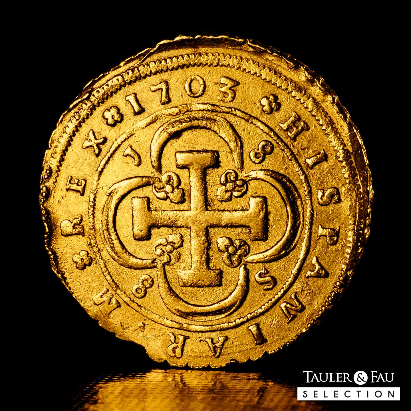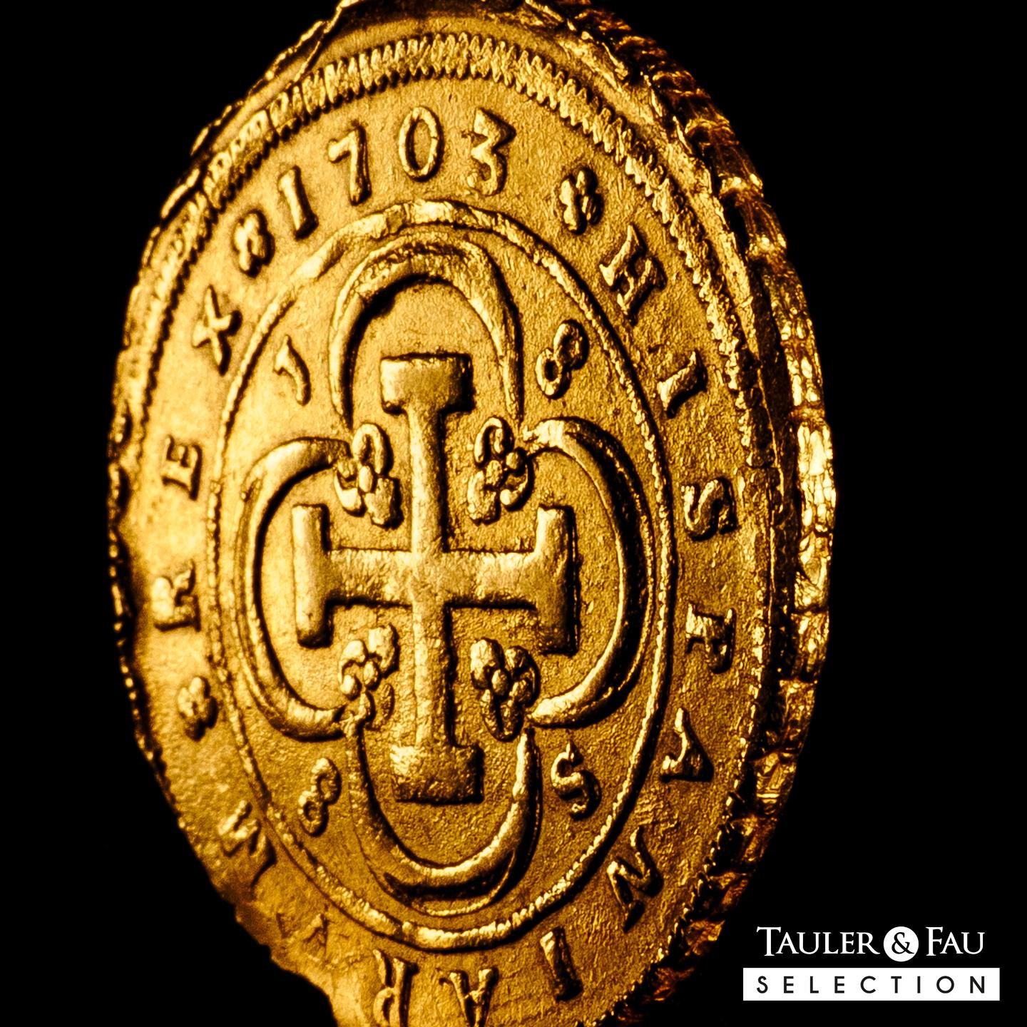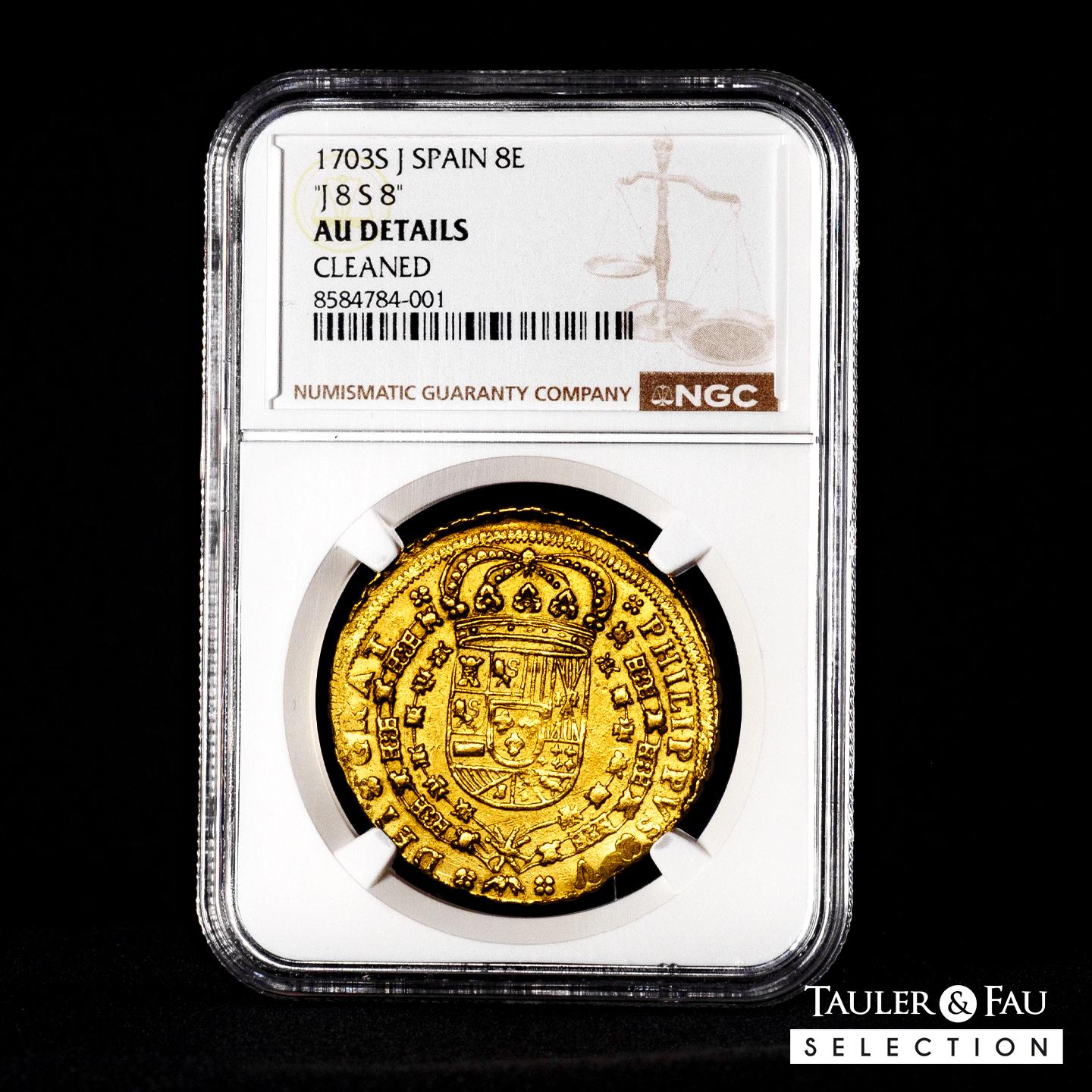 Felipe V (1700-1746). 8 escudos. 1703. Sevilla. J-8 / 8-S. (Cal-2270). (Cal onza-472). Au. 26,87 g. Tipo "Cruz". Ceca, valor 8 y ensayador en reverso. Golpes en el canto. Rara. Encapsulada por NGC como AU Details, Cleaned. Est...7500,00.