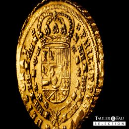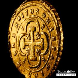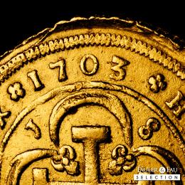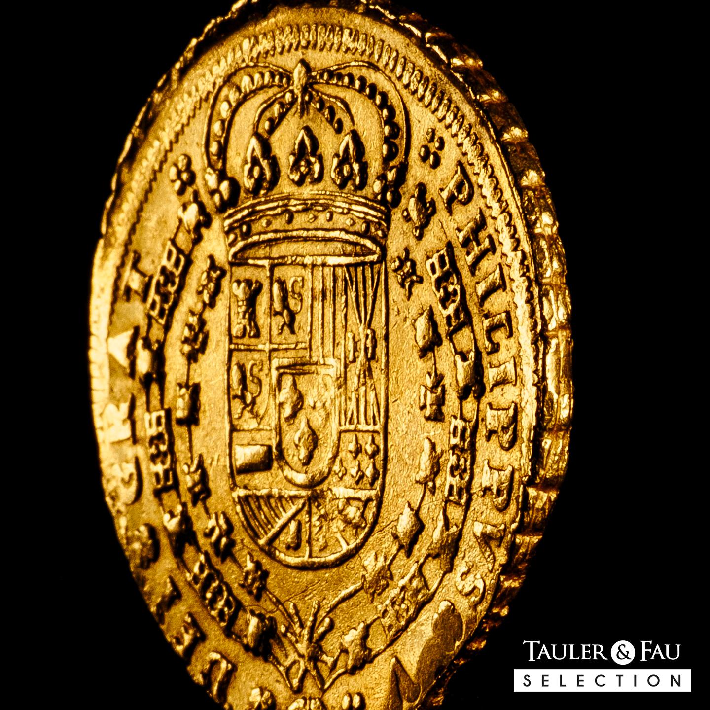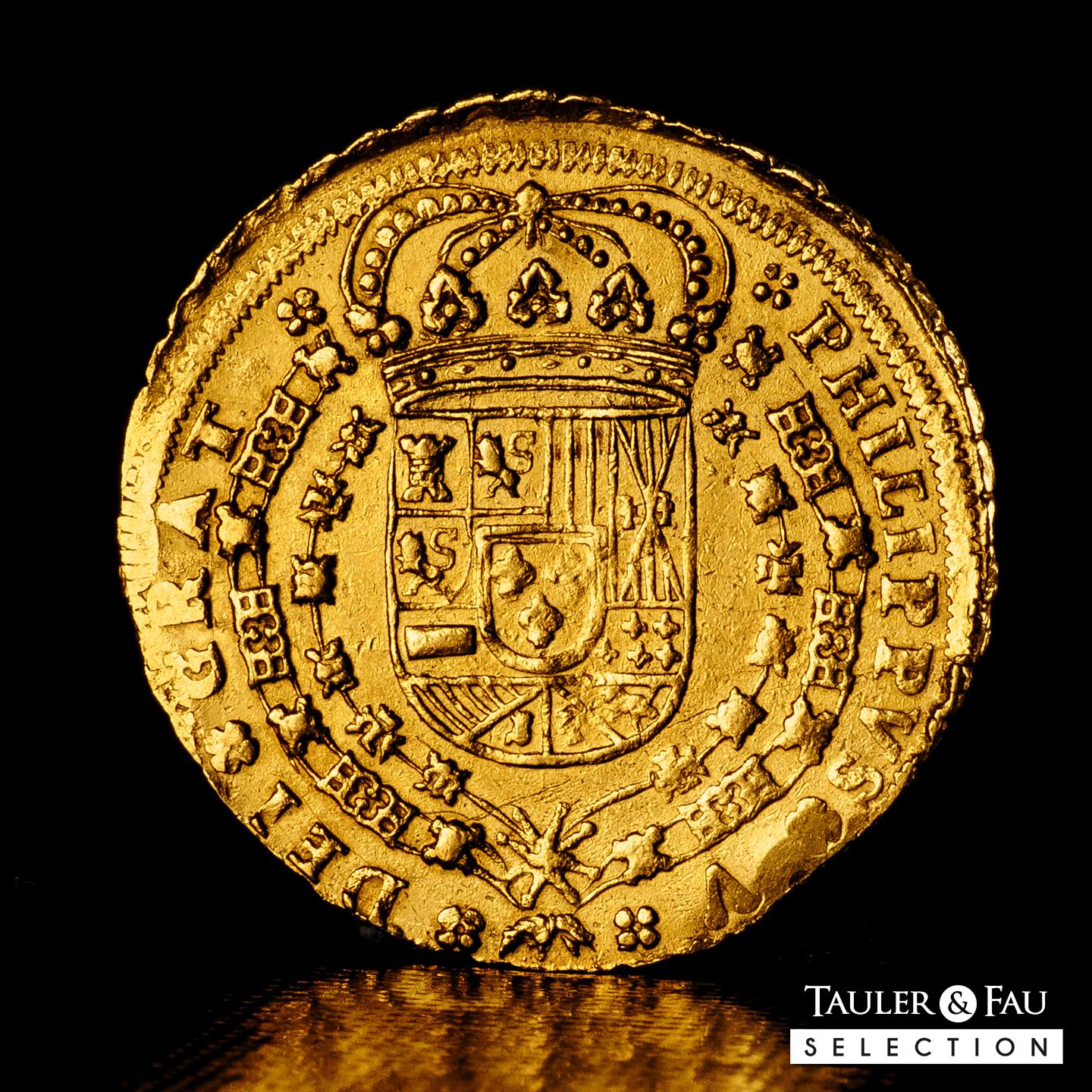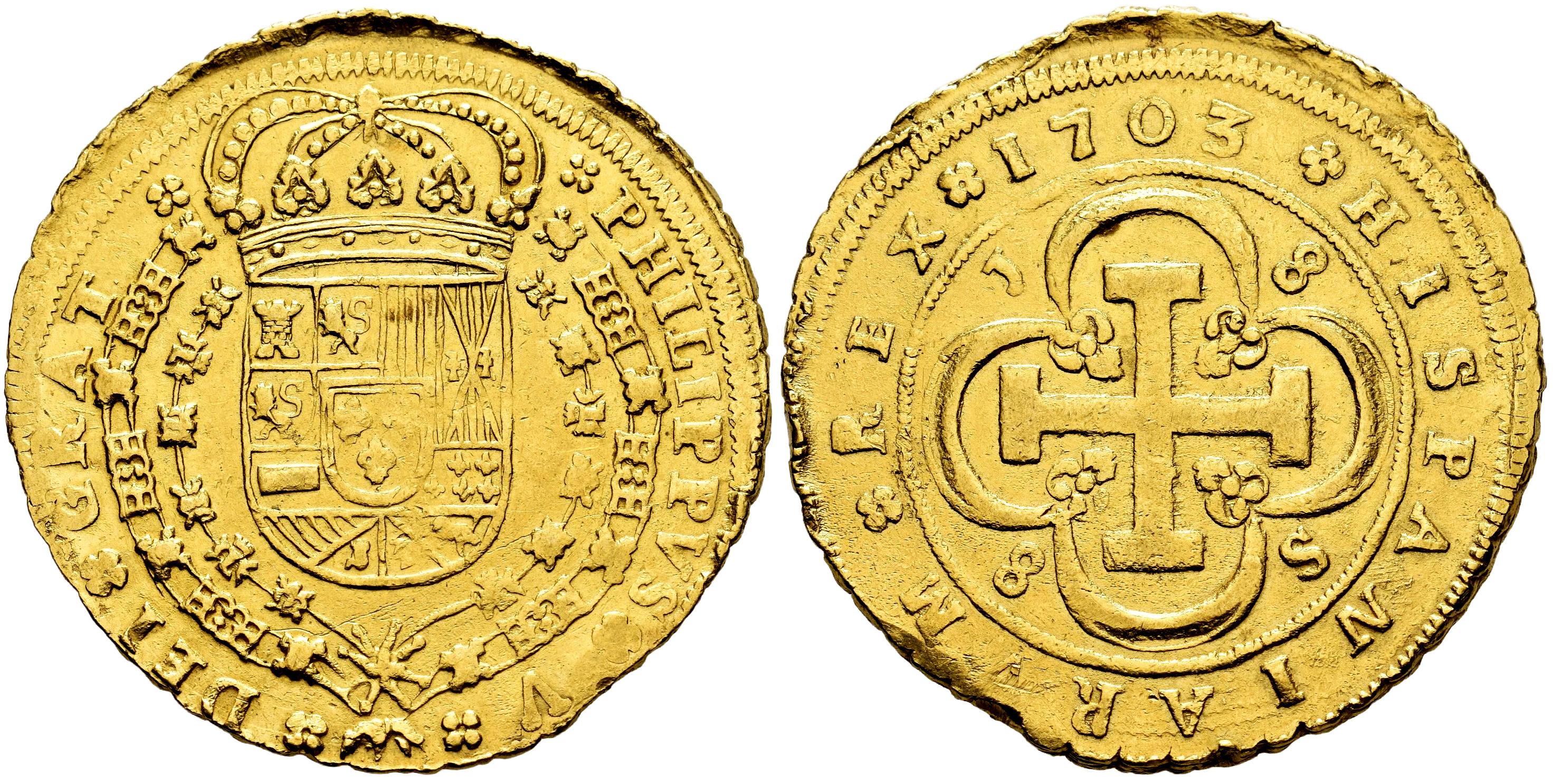 Felipe V (1700-1746). 8 escudos. 1703. Sevilla. J-8 / 8-S. (Cal-2270). (Cal onza-472). Au. 26,87 g. Tipo "Cruz". Ceca, valor 8 y ensayador en reverso. Golpes en el canto. Rara. Encapsulada por NGC como AU Details, Cleaned. Est...7500,00.