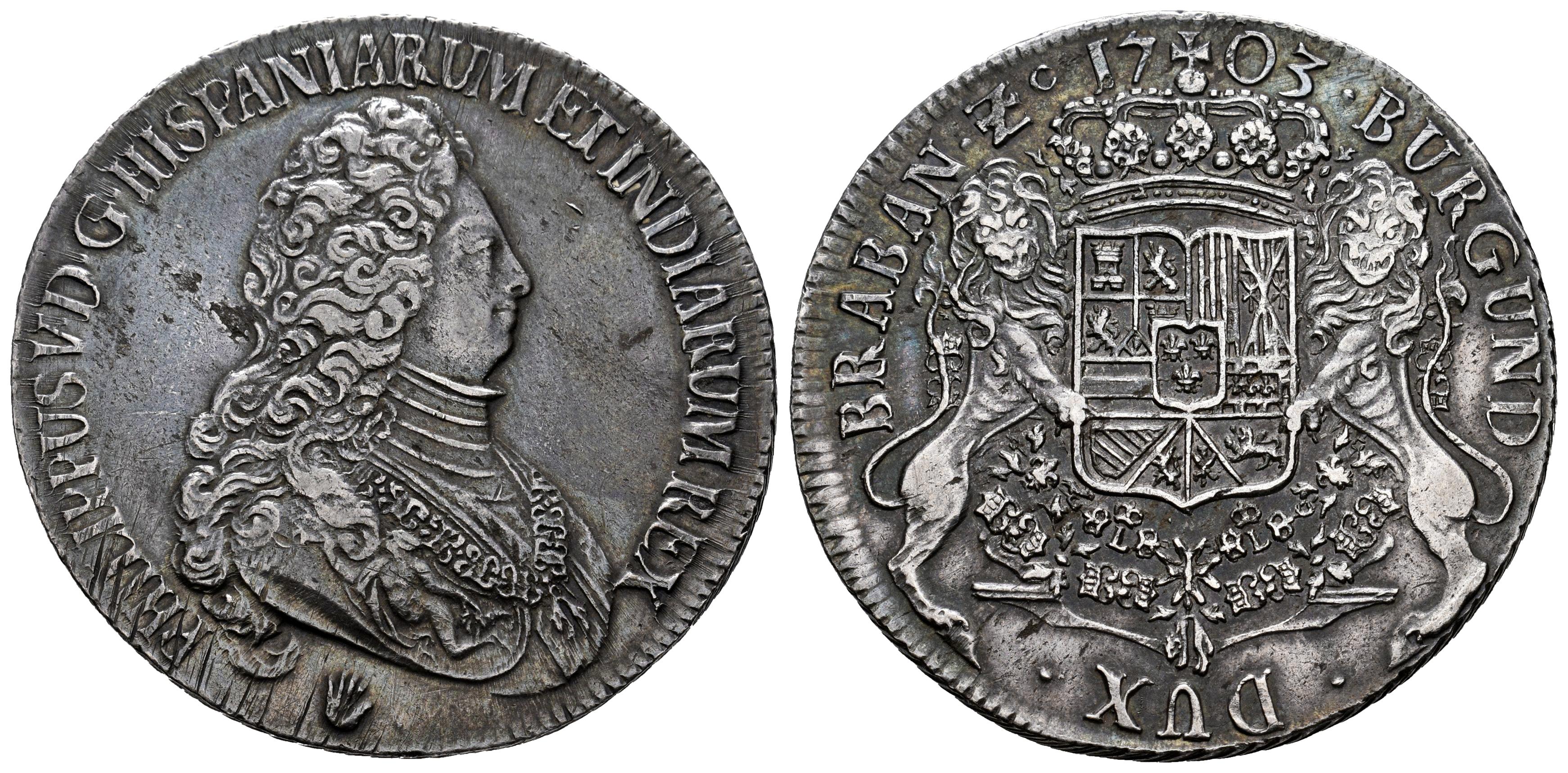 Felipe V (1700-1746). 1 ducatón. 1703. Amberes. (Tauler-3562). (Vti-85). (Vanhoudt-737.AN). Ag. 32,68 g. Preciosa pátina de monetario. Leve hojita en anverso e ínfimas rayitas. Muy atractiva. Rara. EBC. Est...1000,00.
