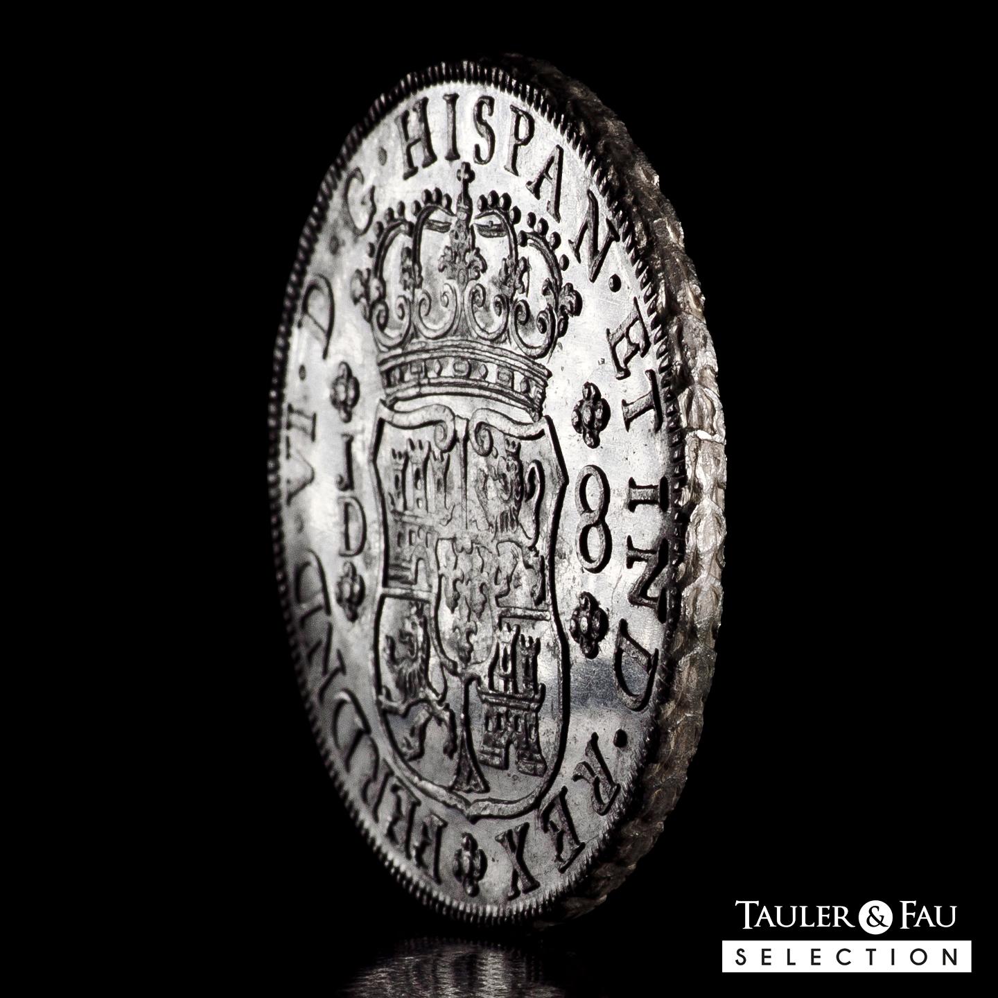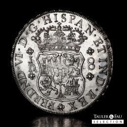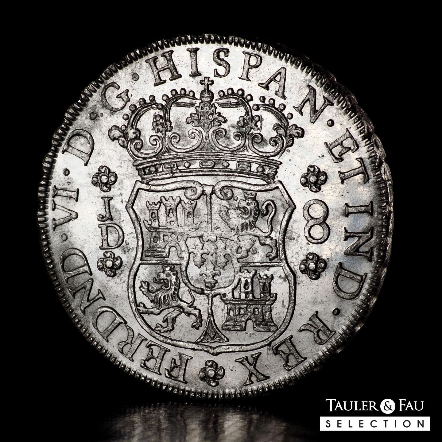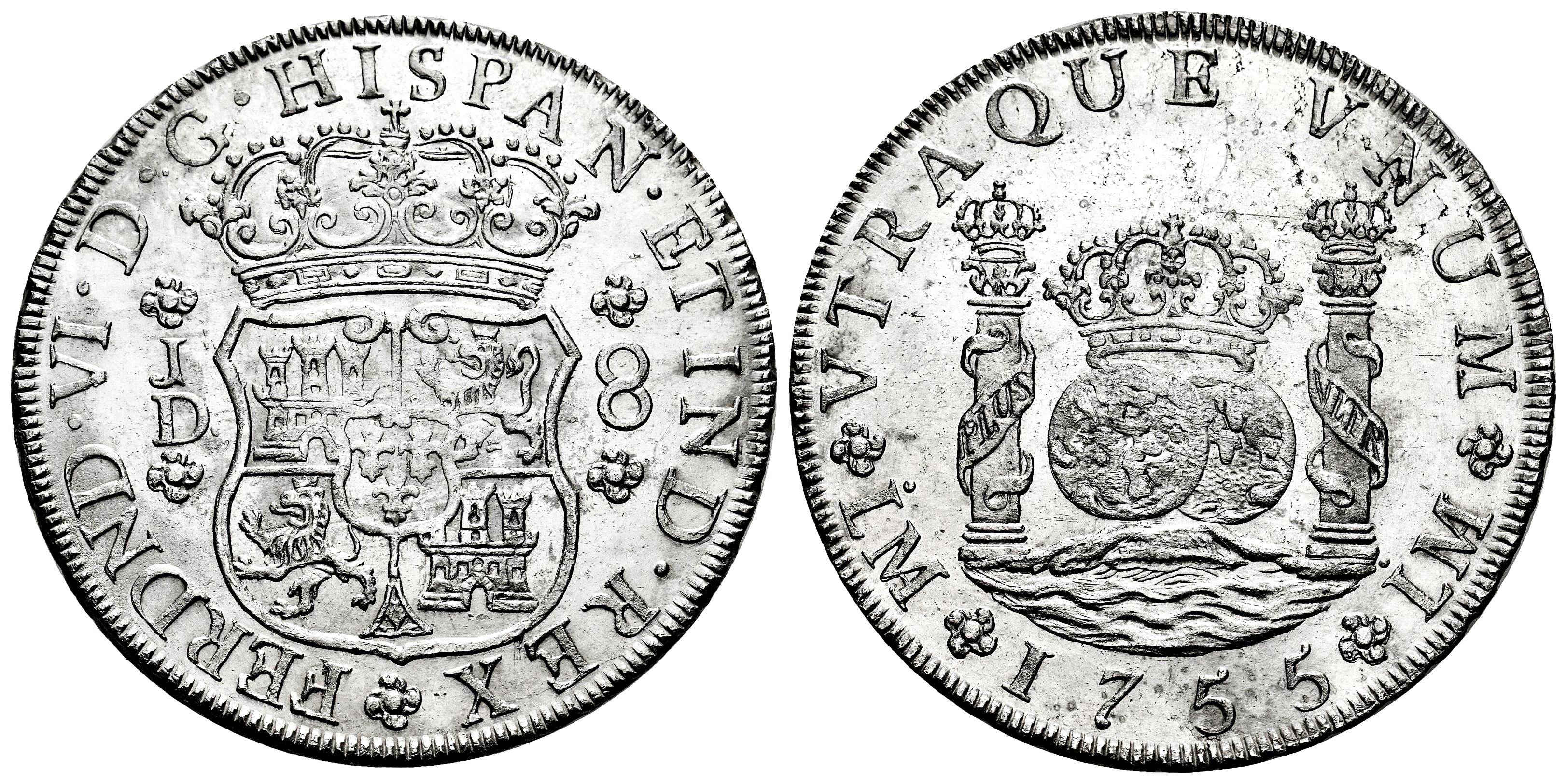 Fernando VI (1746-1759). 8 reales. 1755. Lima. JD. (Cal-459). Ag. 26,75 g. Excelente acuñación con pleno brillo original y relieves mate. Ínfimas marquitas, sin signos de desgaste o circulación. Muy rara en esta conservación. Acuñación de apariencia prooflike. Est...5000,00.