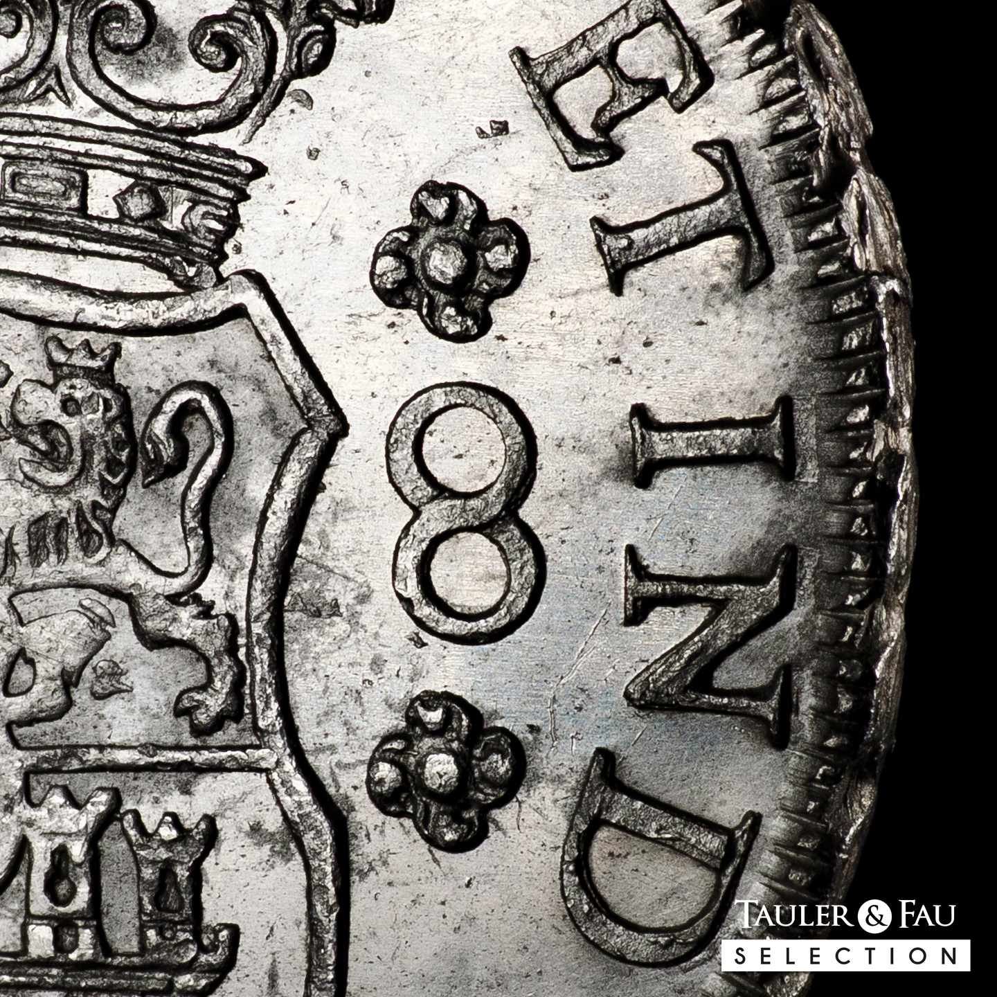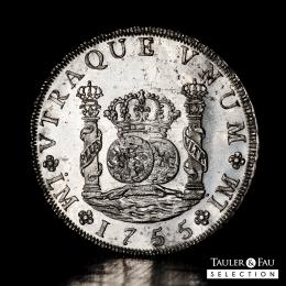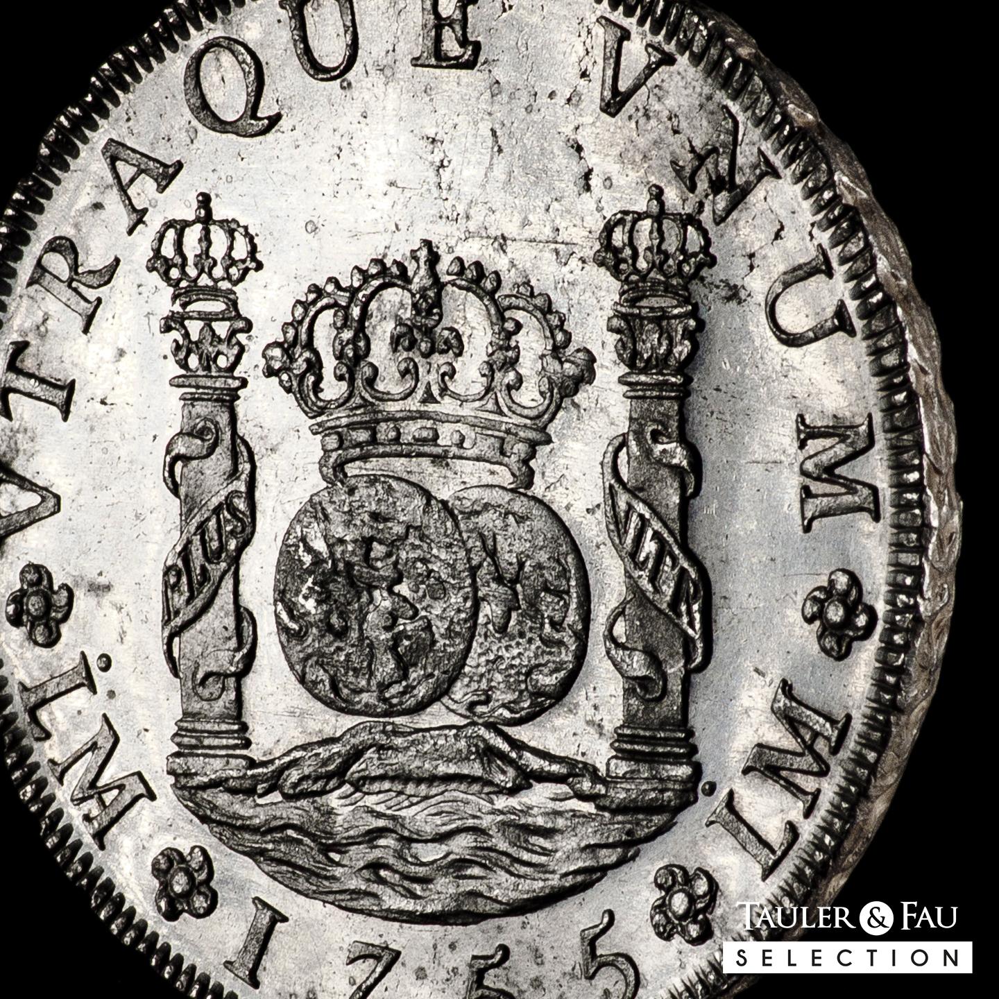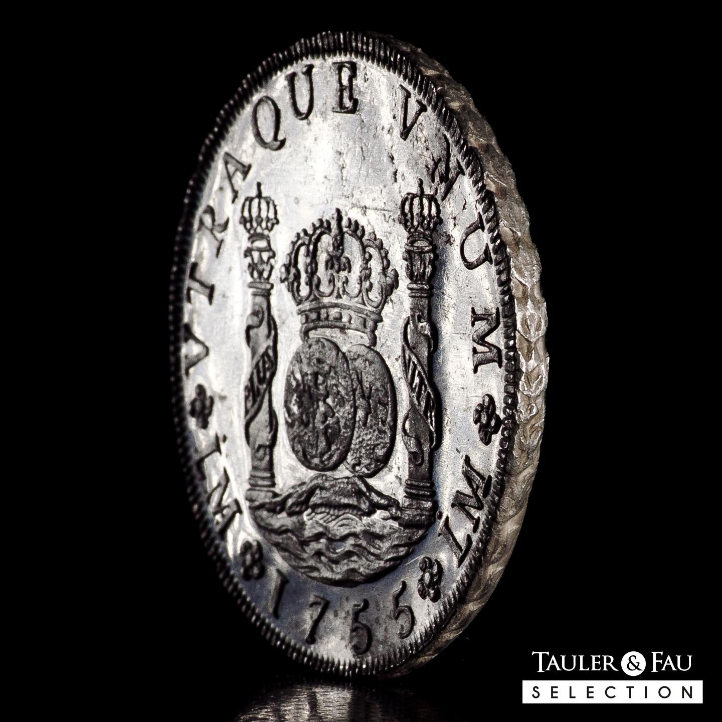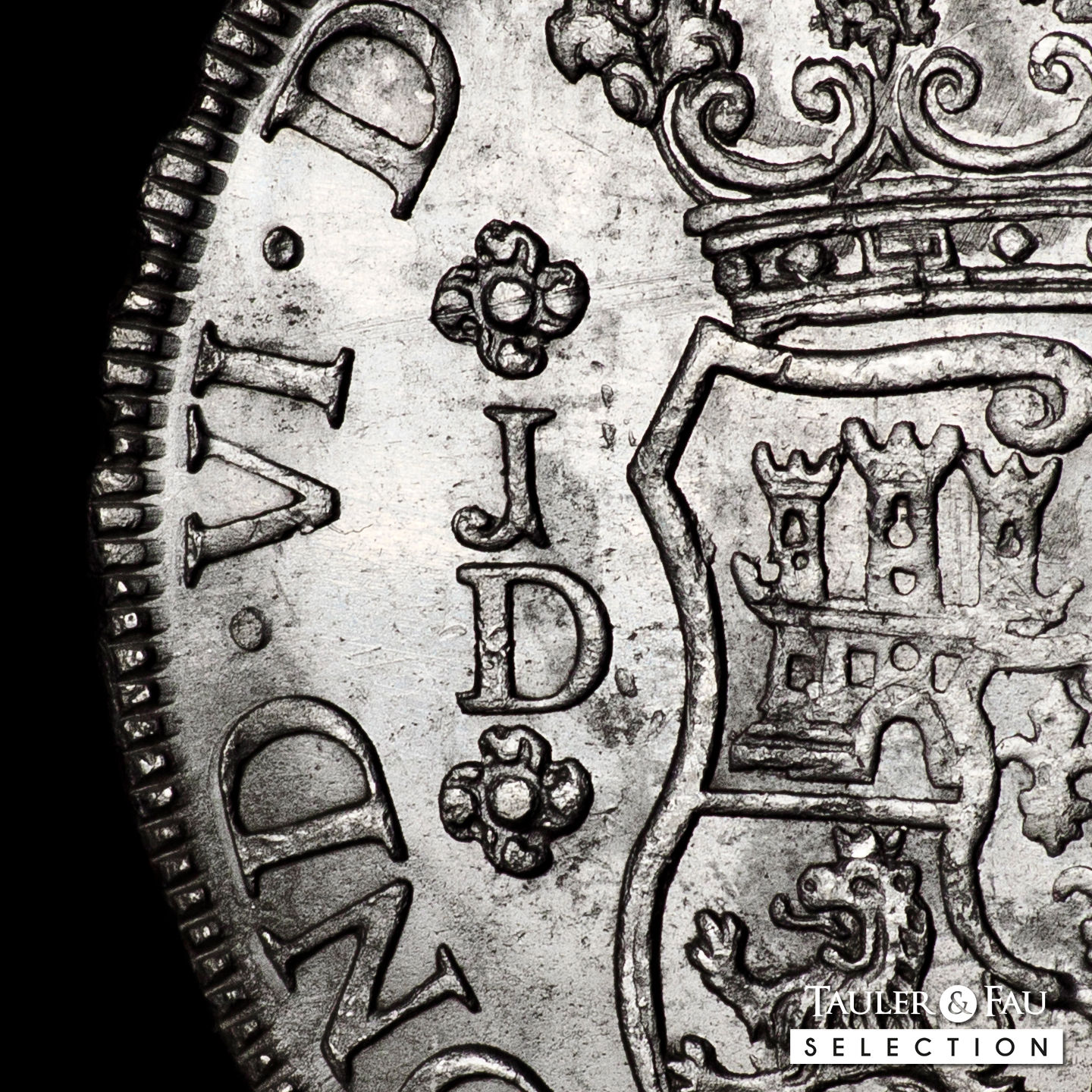 Fernando VI (1746-1759). 8 reales. 1755. Lima. JD. (Cal-459). Ag. 26,75 g. Excelente acuñación con pleno brillo original y relieves mate. Ínfimas marquitas, sin signos de desgaste o circulación. Muy rara en esta conservación. Acuñación de apariencia prooflike. Est...5000,00.