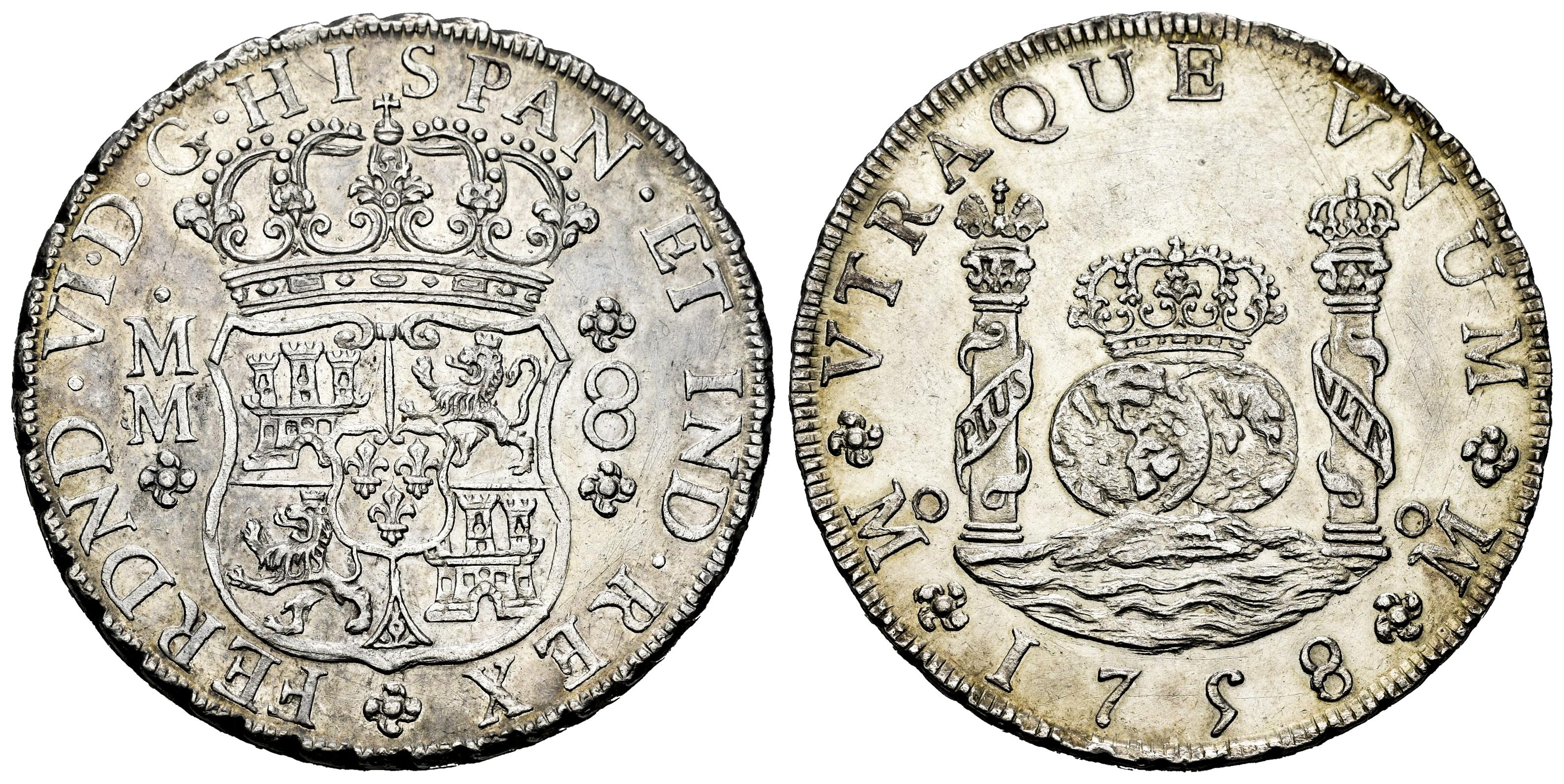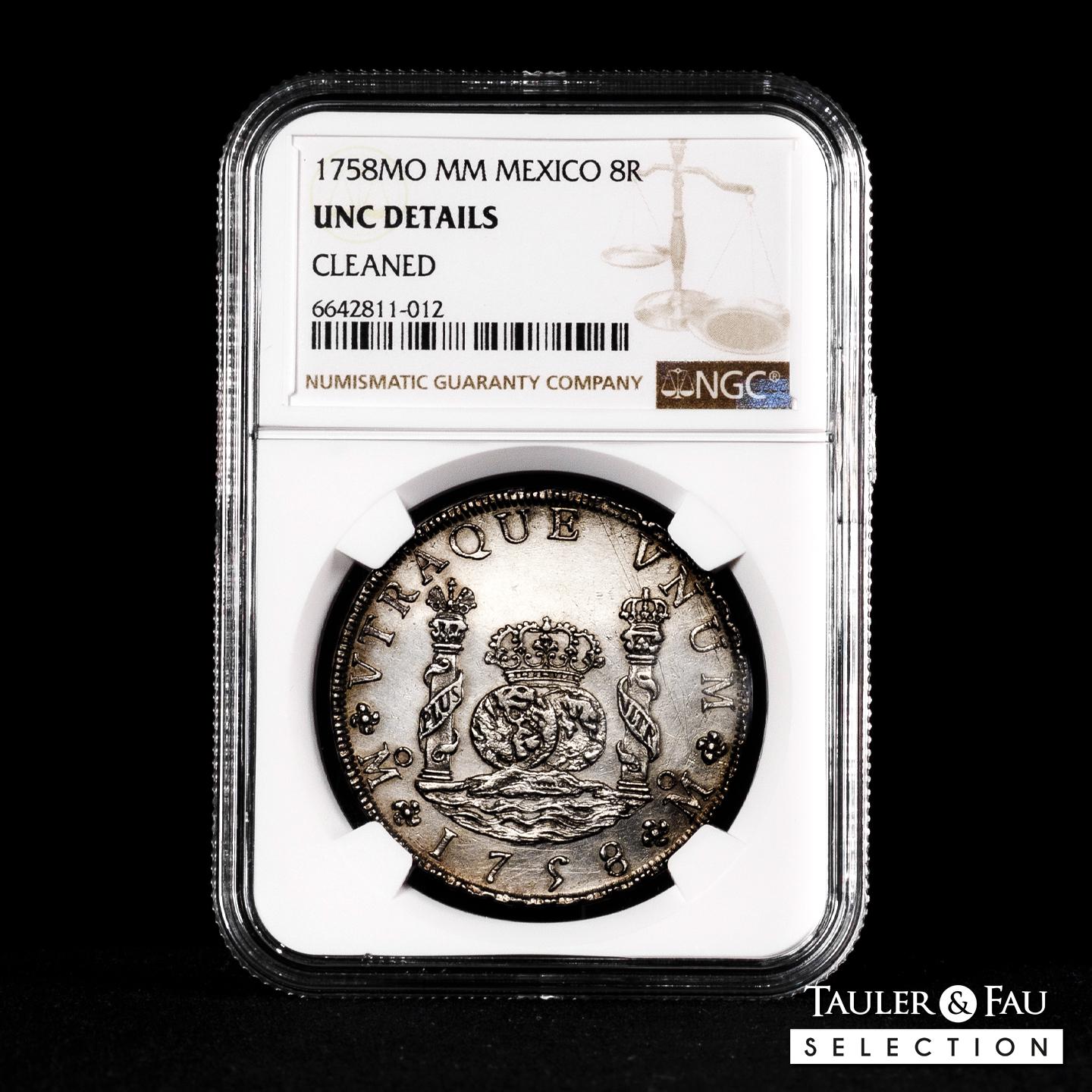 Fernando VI (1746-1759). 8 reales. 1758. México. MM. (Cal-494). Ag. Limpiada pero acuñación muy bien marcada y definida. Encapsulada por NGC como UNC Details, Cleaned. Est...800,00.