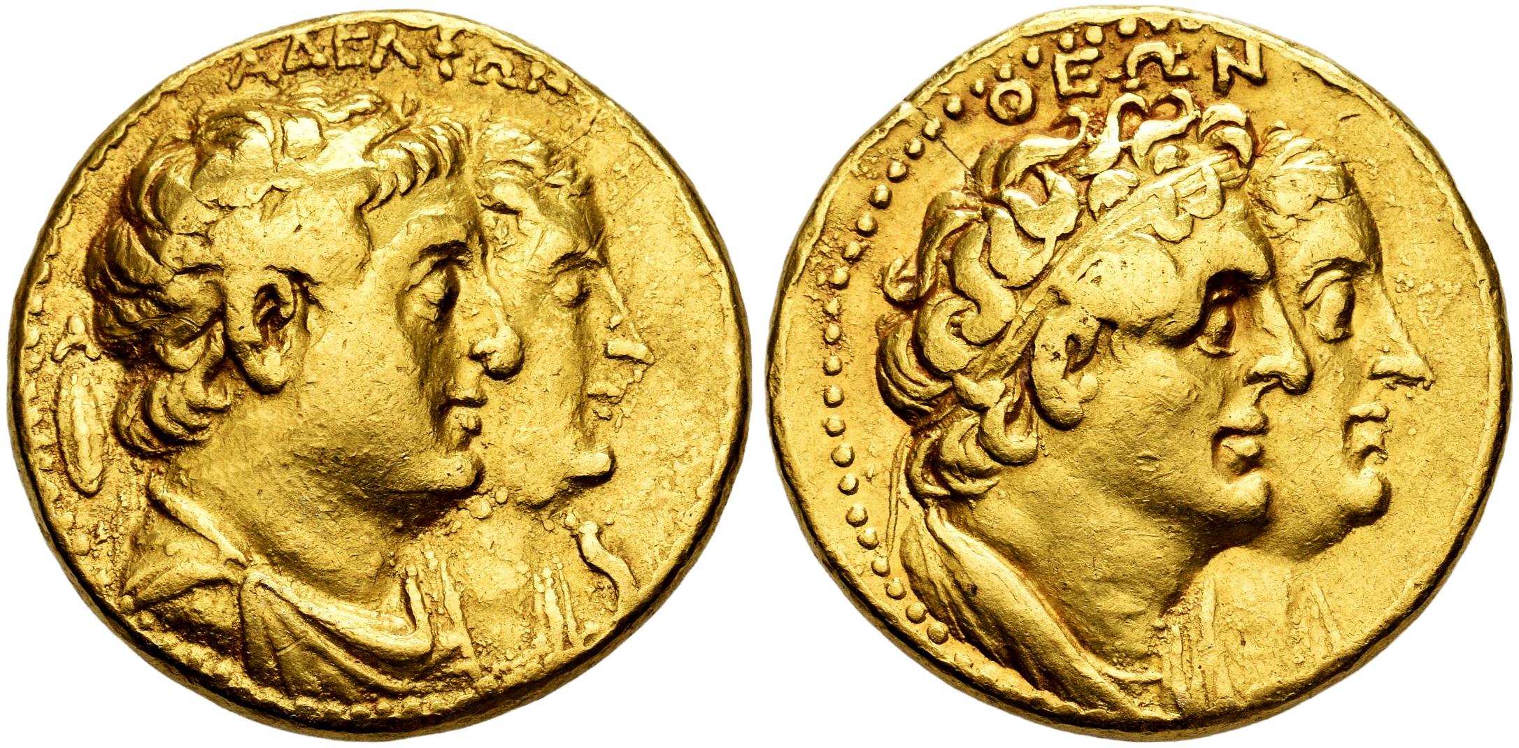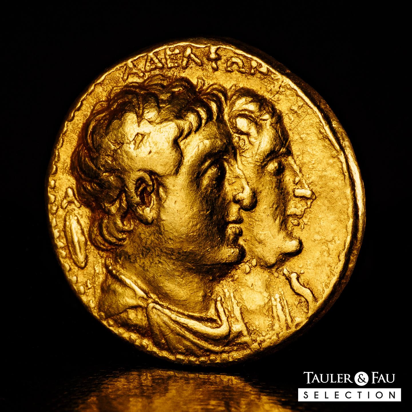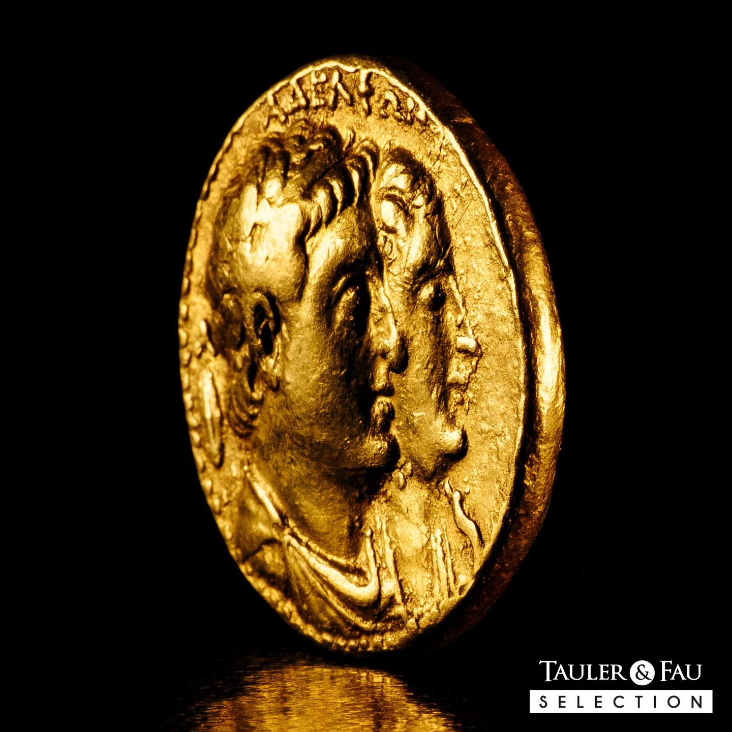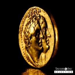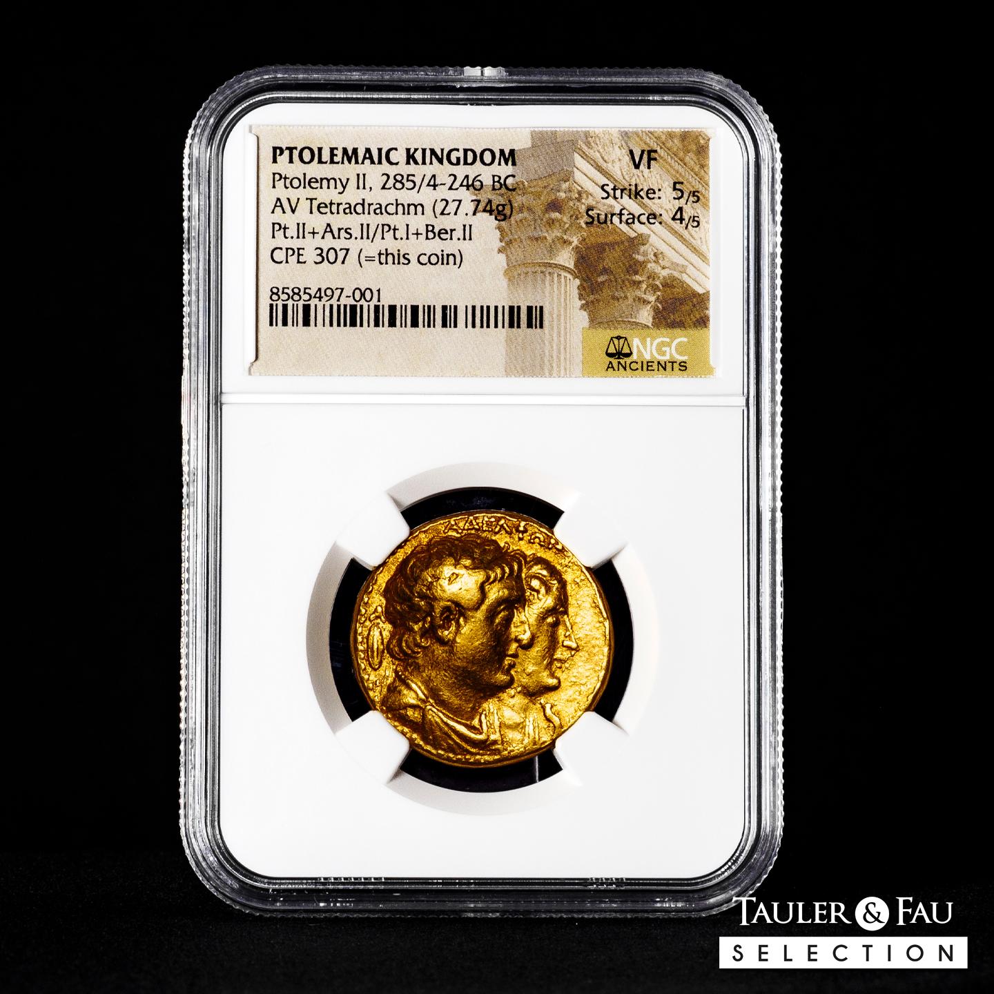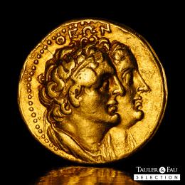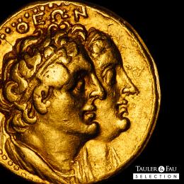 Egipto Ptolemaico. Ptolomeo II Philadelphos. Mnaieion u Oktadracma. 272-261/0 a.C. Alejandría. (Sng Cop-132). (Svoronos-603). (CPE-307, mismo ejemplar). Anv.: AΔEΛΦΩN. Bustos conjuntos de Ptolomeo II, diademado y drapeado, junto a Arsinoe II, diademado y velado a la derecha; detrás escudo de Galacia. Rev.: ΘEΩN. Bustos conjuntos de Ptolomeo I, diademado y drapeado, junto a Berenike, diademada y velada a la derecha. Au. 27,74 g.