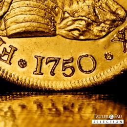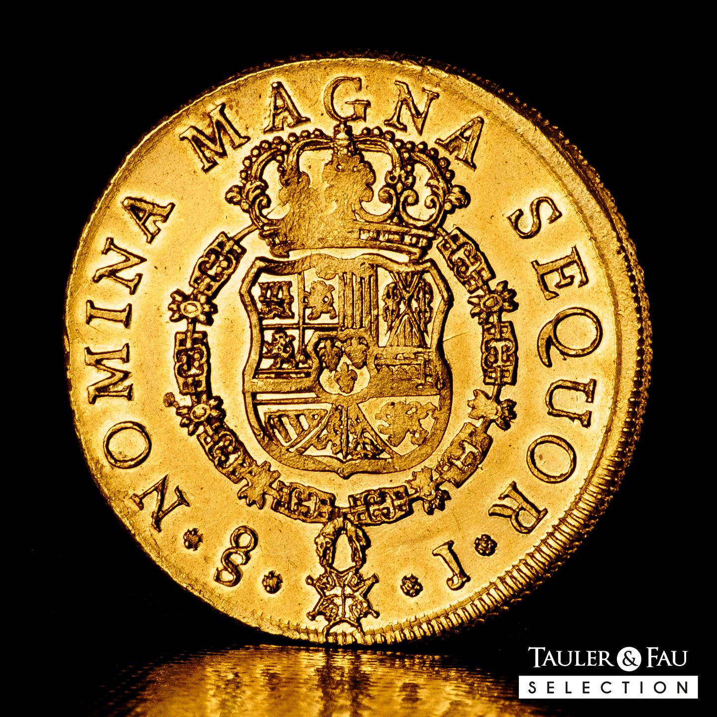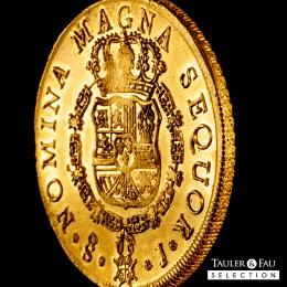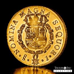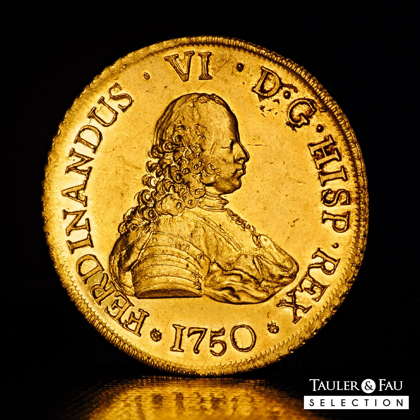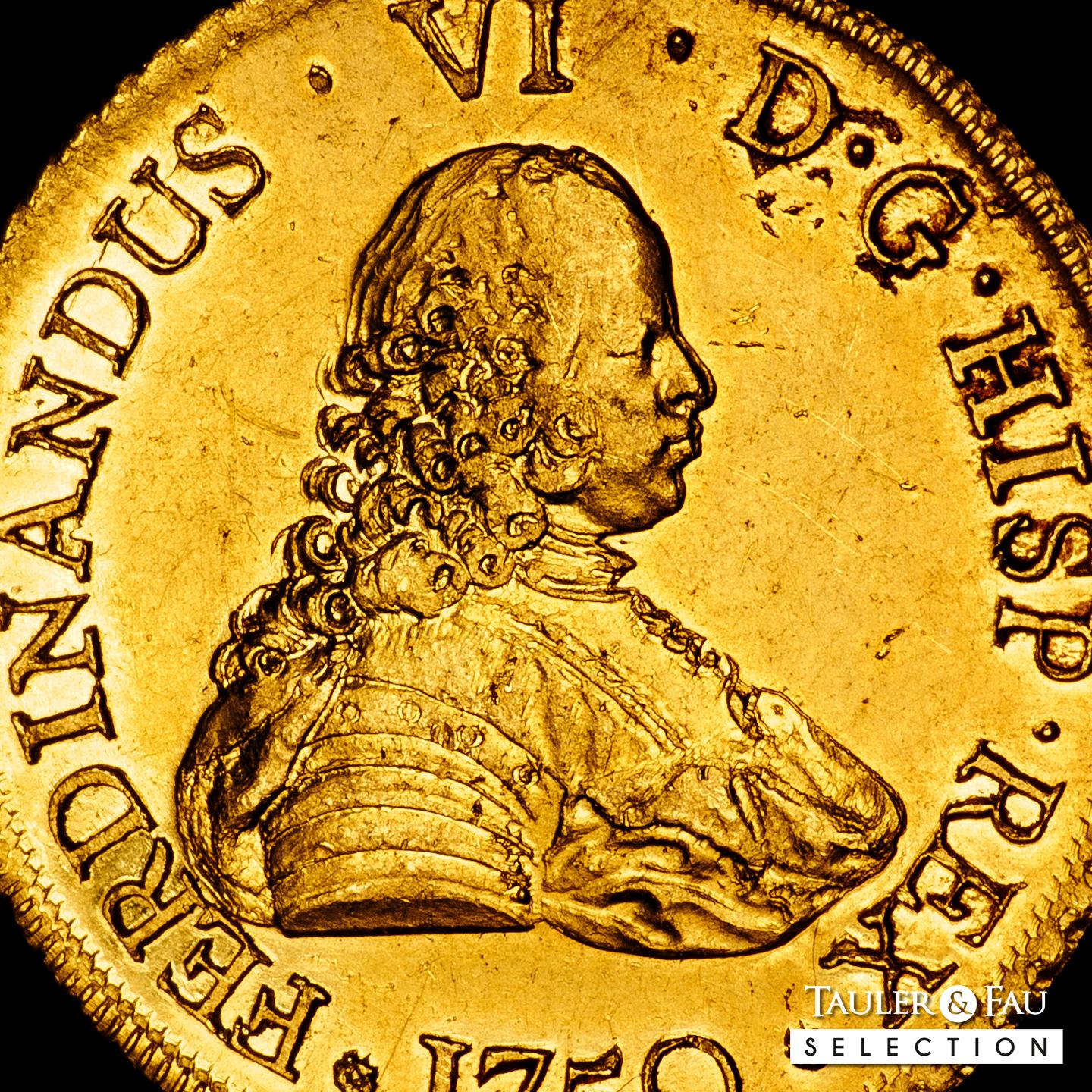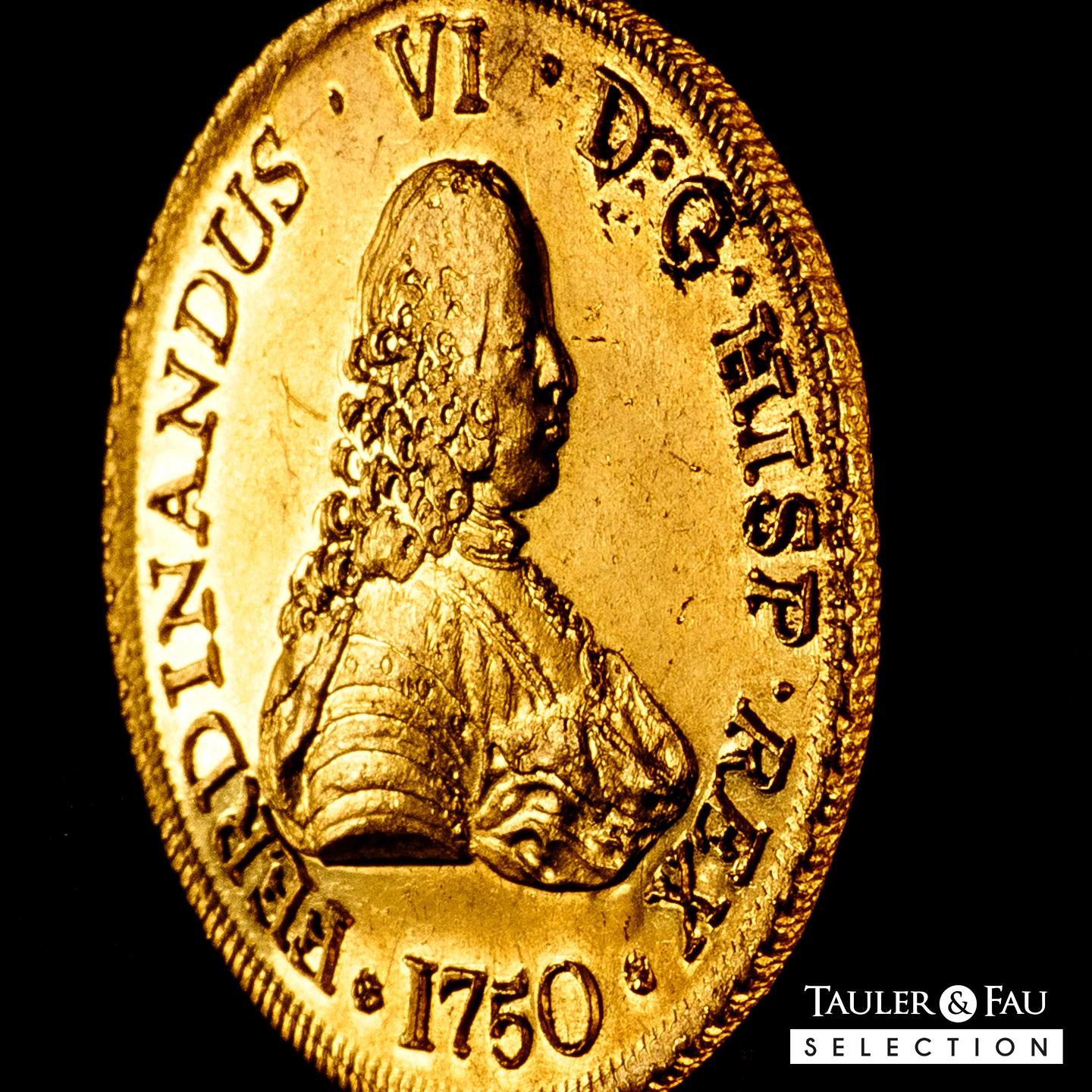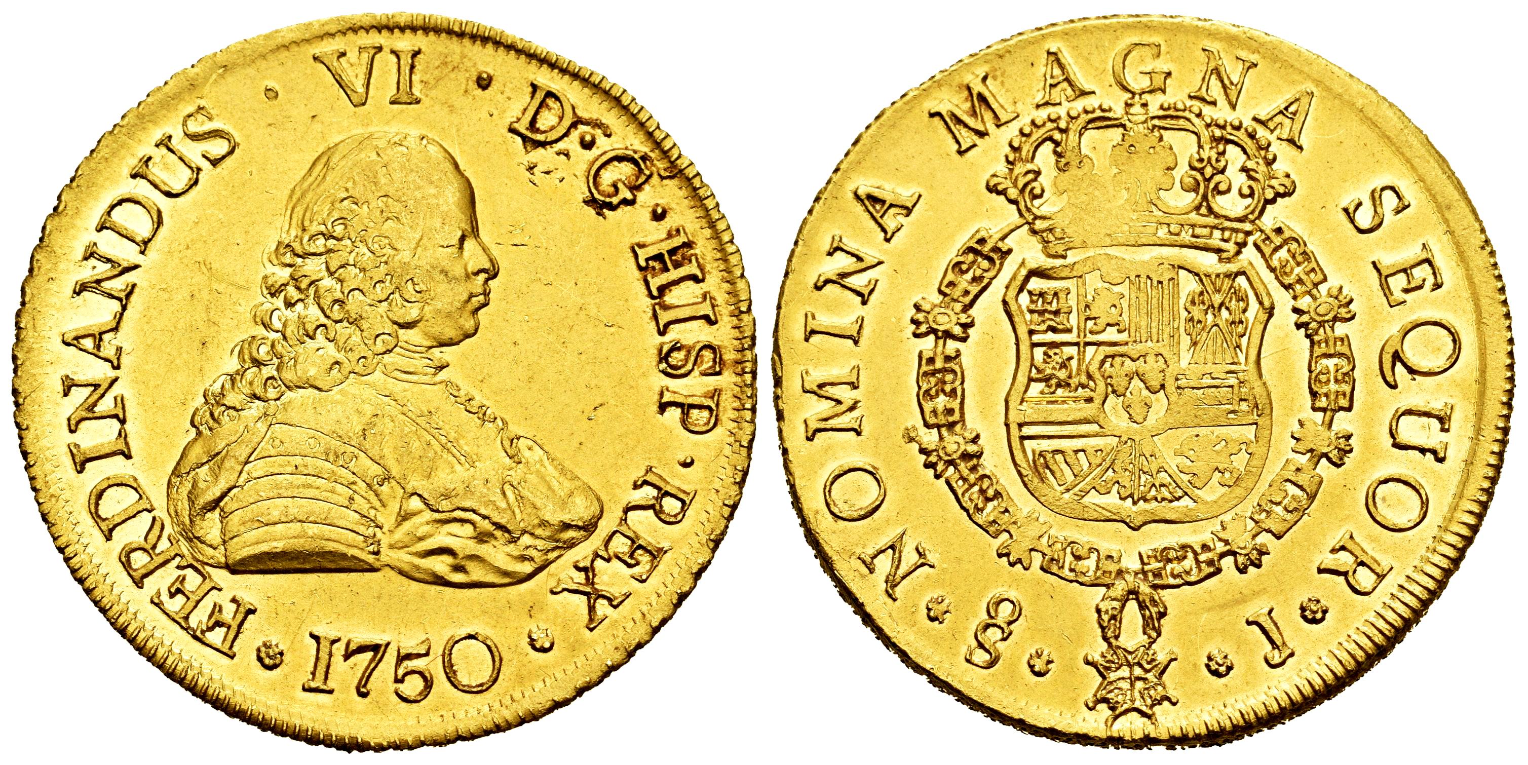 Fernando VI (1746-1759). 8 escudos. 1750. Santiago. J. (Cal-822). (Cal onza-642). Au. 27,04 g. Sin indicación de valor. Suave tono y Brillo original. Tan solo unas leves marquitas. Ligeros vanos de acuñación y leves excesos de metal en la leyenda de anverso. Muy atractiva y rara, más en esta conservación. SC. Est...6000,00.