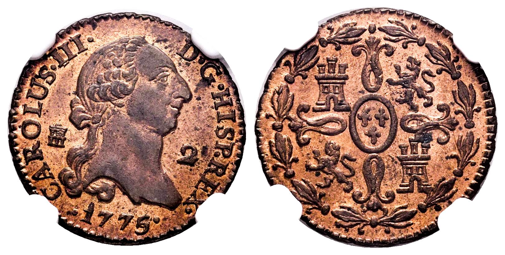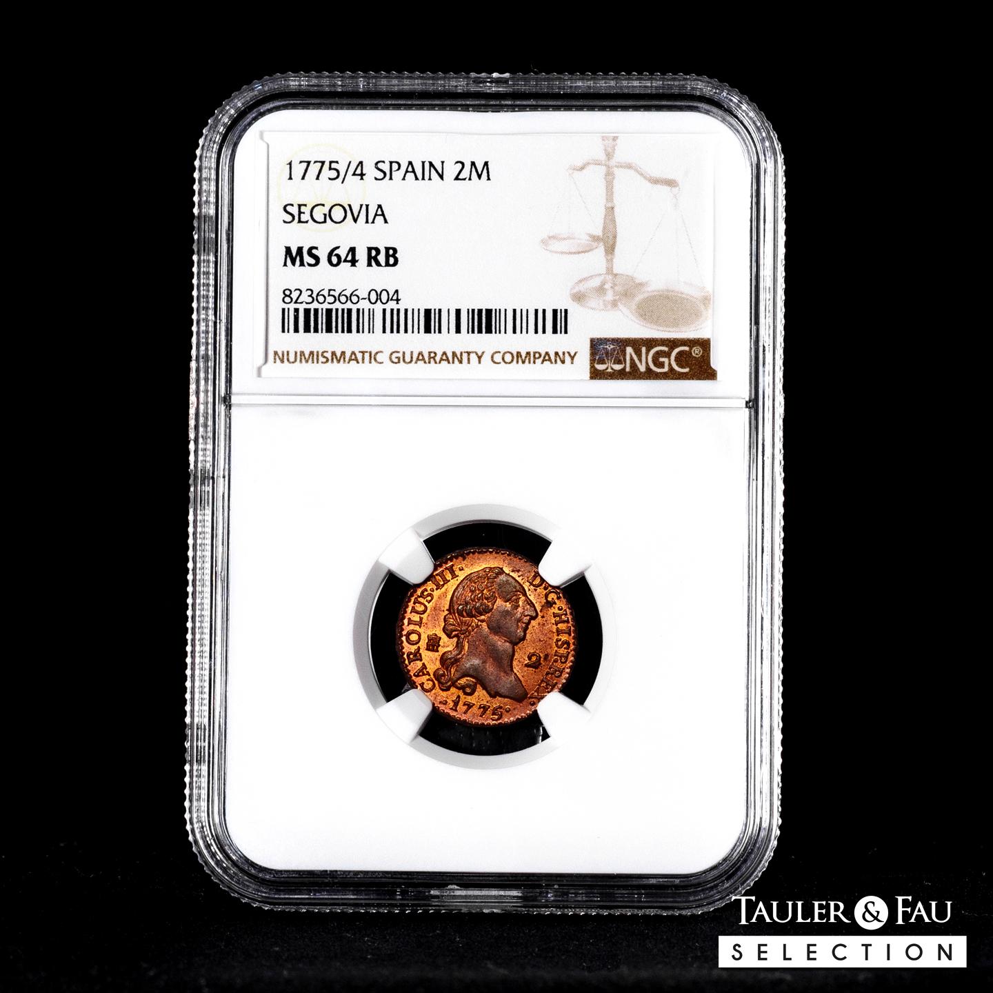 Carlos III (1759-1788). 2 maravedís. 1775/4. Segovia. (Cal-37). Ae. Precioso color y pleno brillo original con un excelente atractivo visual. Muy rara en esta conservación. Encapsulada por NGC como MS 64 RB. Solamente 1 ejemplar mejor conservado según los censos de NGC y PCGS. Est...400,00.