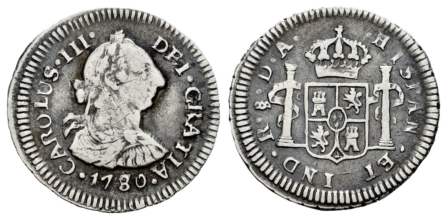 Carlos III (1759-1788). 1/2 real. 1780/79. Santiago. DA. (Cal-288). Ag. 1,55 g. Clara sobrefecha. Ligero tono. Rarísima, muy pocos ejemplares conocidos. Ex Áureo&Calicó (29/10/2008), lote 1329; Ex Colección Medina. MBC/MBC+. Est...400,00.