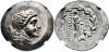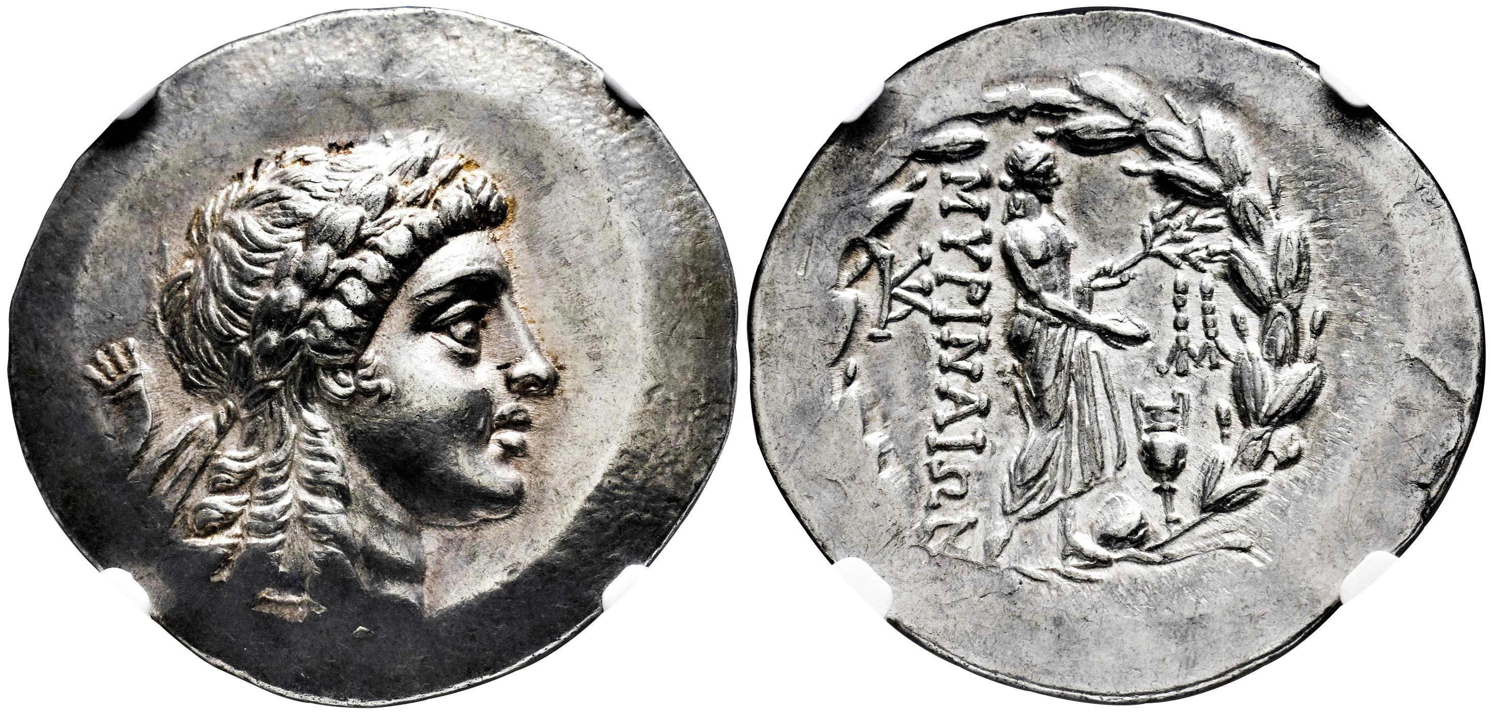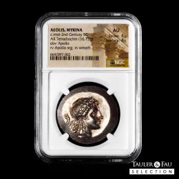 Aiolis. Myrina. Tetradracma. 155-145 a.C. Tipo estefanofórico. (Sacks-19). (Bmc-12). Anv.: Cabeza laureada de Apolo a la derecha. Rev.: Apolo Grynios en pie a la derecha, sosteniendo una phiale y una rama de laurel con cintas; monograma y MYPINAIΩN a la izquierda, ónfalo y ánfora a los pies; todo ello dentro de una corona de laurel. Ag. 16,73 g. Encapsulada por NGC como AU, strike 4/5, surface 4/5. Est...1500,00.