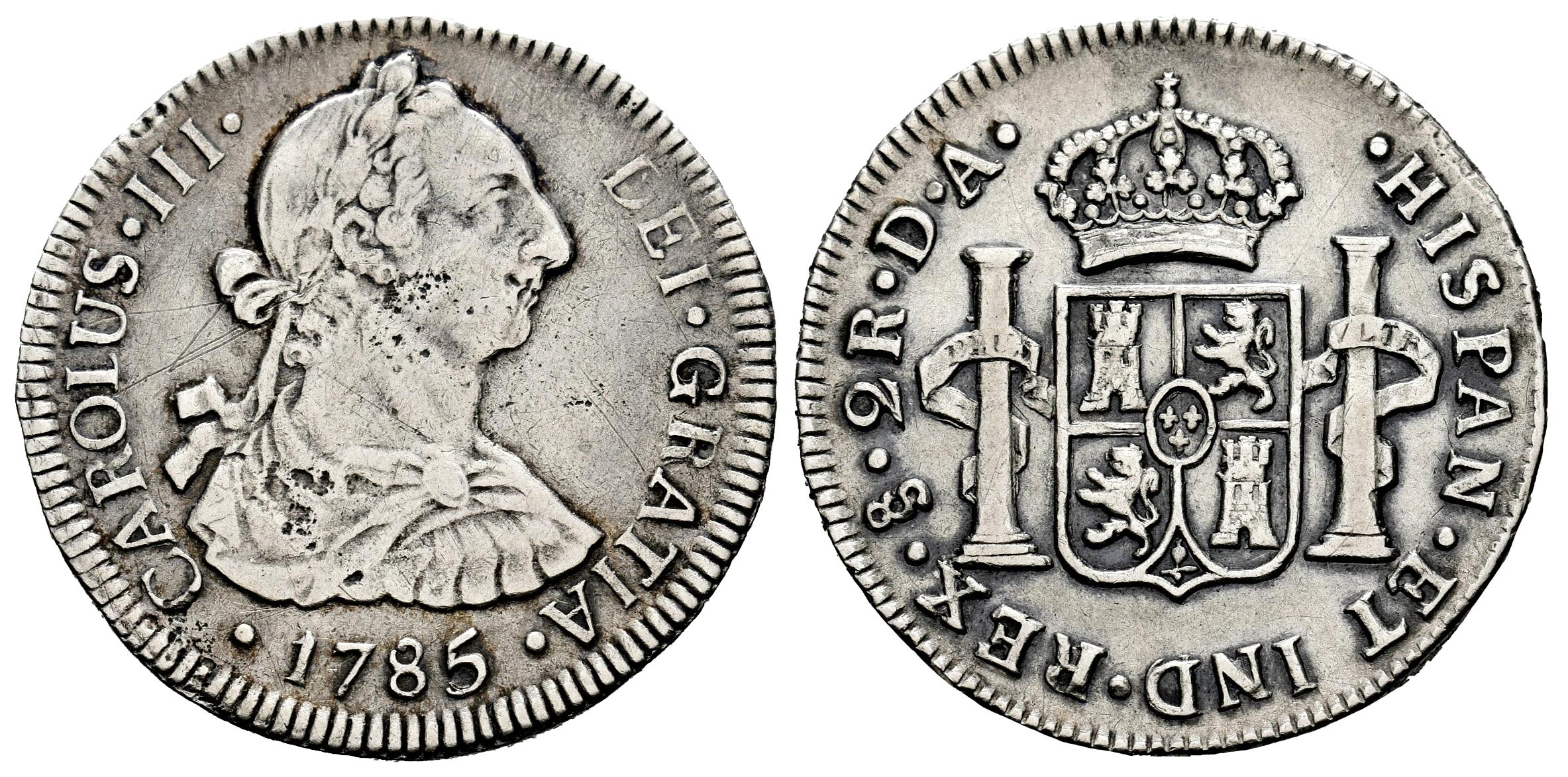 Carlos III (1759-1788). 2 reales. 1785. Santiago. DA. (Cal-766). Ag. 6,58 g. Leves rayitas y mínimas oxidaciones en anverso. Muy rara. Ex Áureo&Calicó (19/11/2020), lote 1425. BC+/MBC-. Est...600,00.