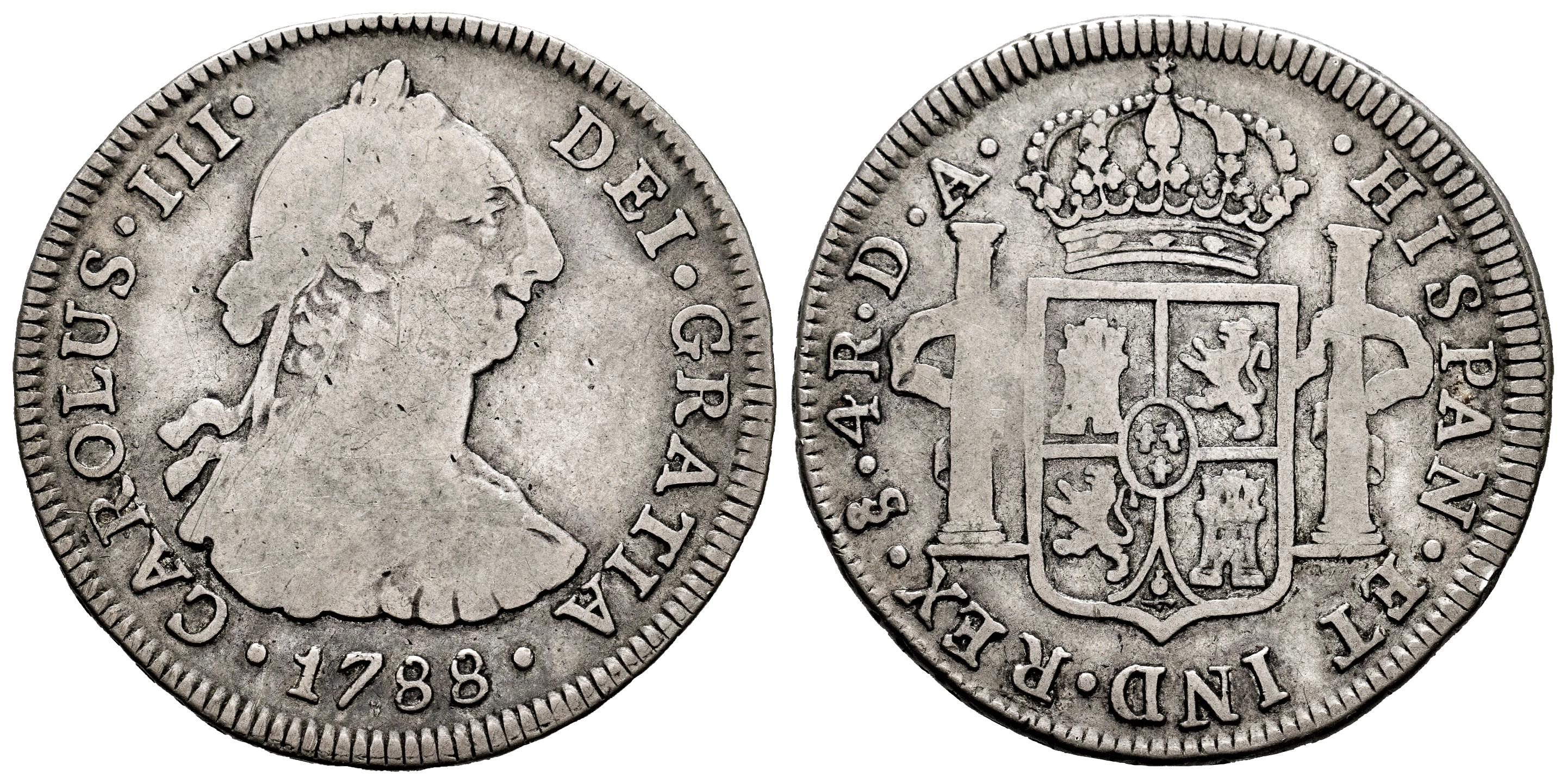 Carlos III (1759-1788). 4 reales. 1788. Santiago. DA. (Cal-974). Ag. 12,97 g. Pátina de monetario. Rara. Ex Colección Almanzar, 11/12/1975. Conserva la etiqueta del coleccionista. BC+. Est...600,00.