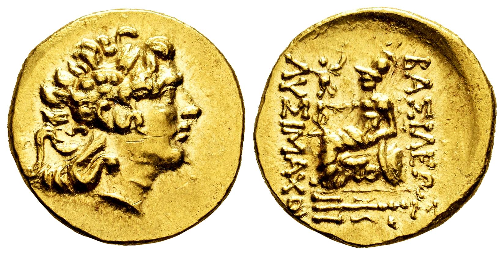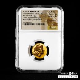 Reyes de Pontos. Mithradates VI Eupator. Estátera. 88-86 a.C. Tomis. Acuñada en nombre y tipos de Lysimachos de Tracia. (Callataÿ-p. 142 (D7/R1)). (Sng Cop-1091). (Hgc-3.2, 1931). Anv.: Cabeza con diadema de Alejandro deificado a la derecha, con cuerno de Amón. Rev.: Atenea Nikephoros sedente a la izquierda; ΒΑΣΙΛΕΩΣ a la derecha, ΛΥΣΙMΑXOY a la izquierda; monograma ΦΔ en el interior izquierdo, TO debajo del trono, tridente ornamentado en el exergo. Au. 8,24 g.