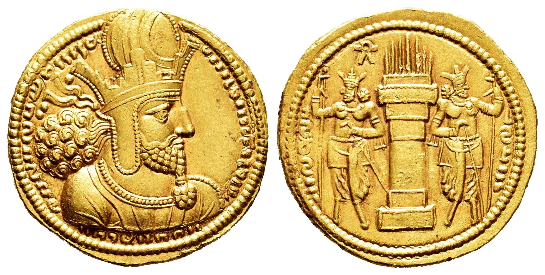 Imperio Sasánida. Shapur I. Dinar. 260-272 d.C. Ceca I ("Ctesiphon"). Fase 2. (Göbl-tipo I/1). (SNS-tipo IIc/1b, estilo P, grupo d/1, 143). (Sunrise-740). Anv.: Busto drapeado a la derecha, con diadema y corona mural rematada con korimbos; un punto encima y dos debajo de los extremos de la diadema. Rev.: Altar en llamas flanqueado por dos asistentes, cada uno con corona mural con cintas y korimbos, y báculo; frawahr a la izquierda de las llamas. Au. 7,42 g.