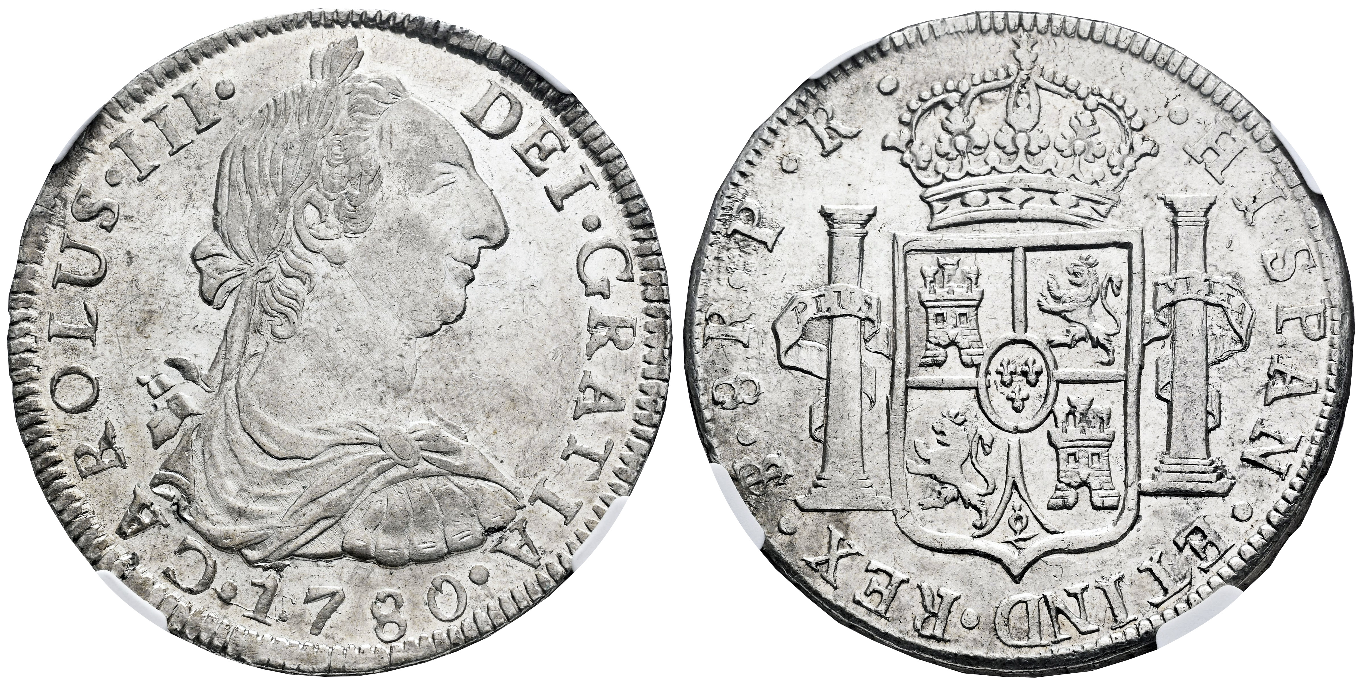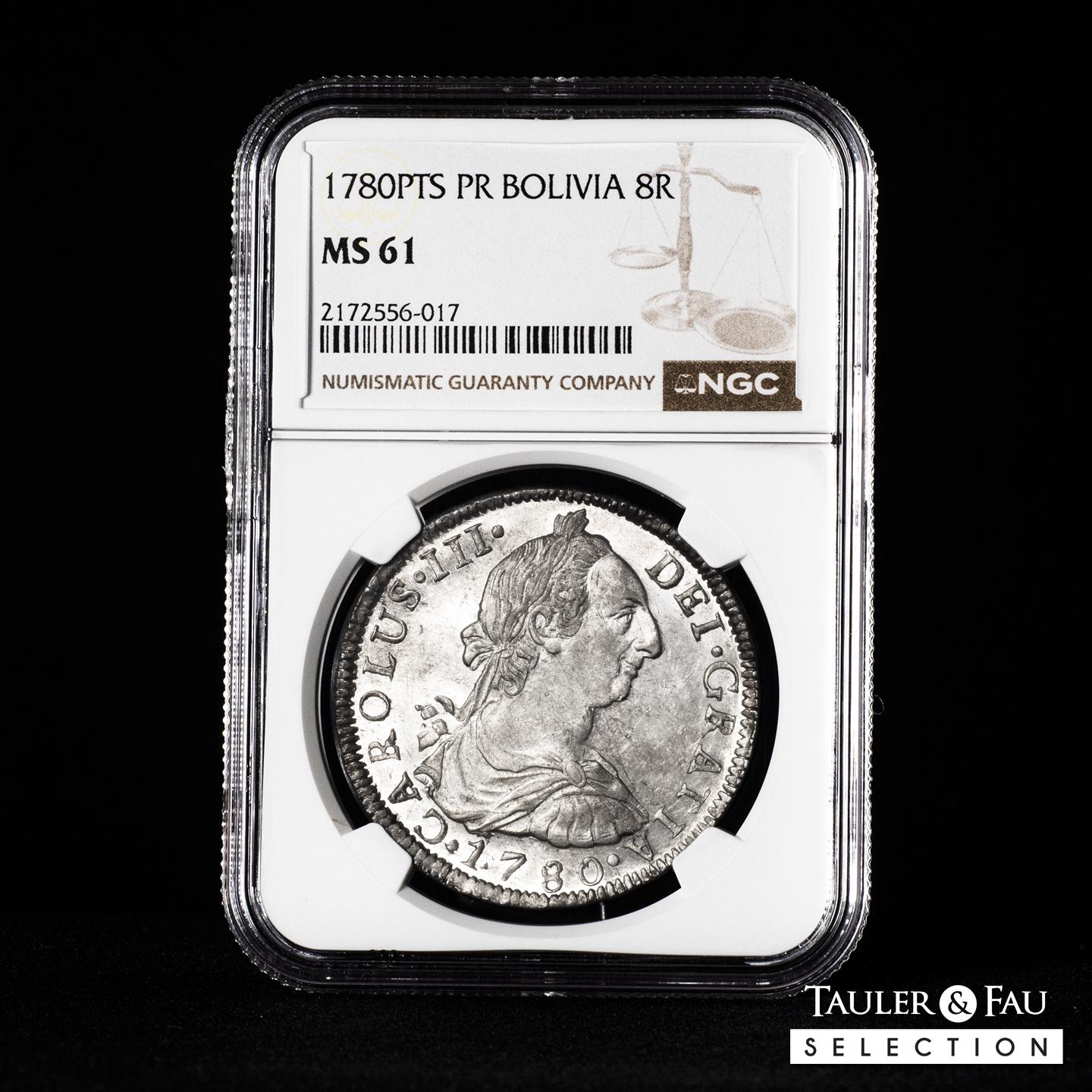 Carlos III (1759-1788). 8 reales. 1780. Potosí. PR. (Cal-1178). Ag. 27,06 g. Muy bien acuñada y con pleno brillo original. Precioso ejemplar. Rara en esta conservación. Encapsulada por NGC como MS 61. Solamente 5 ejemplares mejor conservados según los censos de NGC y PCGS. Est...1200,00.