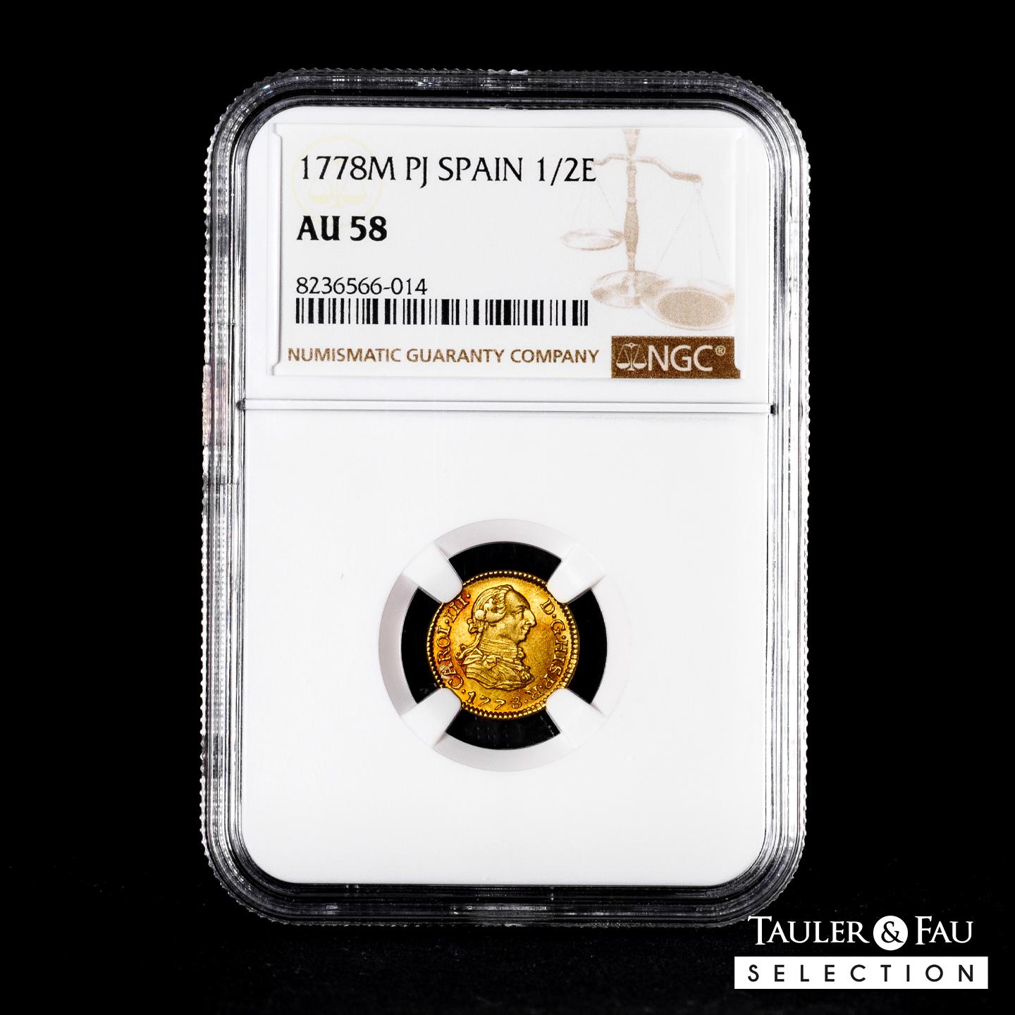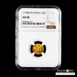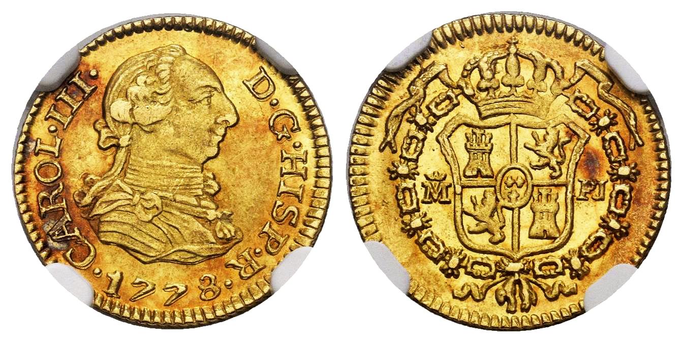 Carlos III (1759-1788). 1/2 escudo. 1778. Madrid. PJ. (Cal-1267). Au. Brillo original con un ligero tono anaranjado que acentúa su atractivo visual. Rara en esta conservación. Encapsulada por NGC como AU 58. Est...500,00.