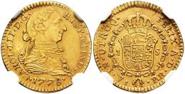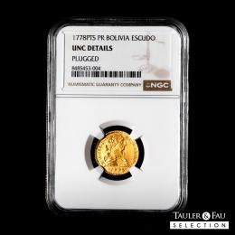 Carlos III (1759-1788). 1 escudo. 1778. Potosí. PR. (Cal-1436). Au. Primer año de acuñación. Agujero tapado con extrema destreza a las 12h. Solamente hemos encontrado otros 2 ejemplares subastados en los últimos 20 años y este es el mejor conservado a pesar del agujero. Rarísima. Encapsulada por NGC como UNC Details, Plugged. Est...3000,00.