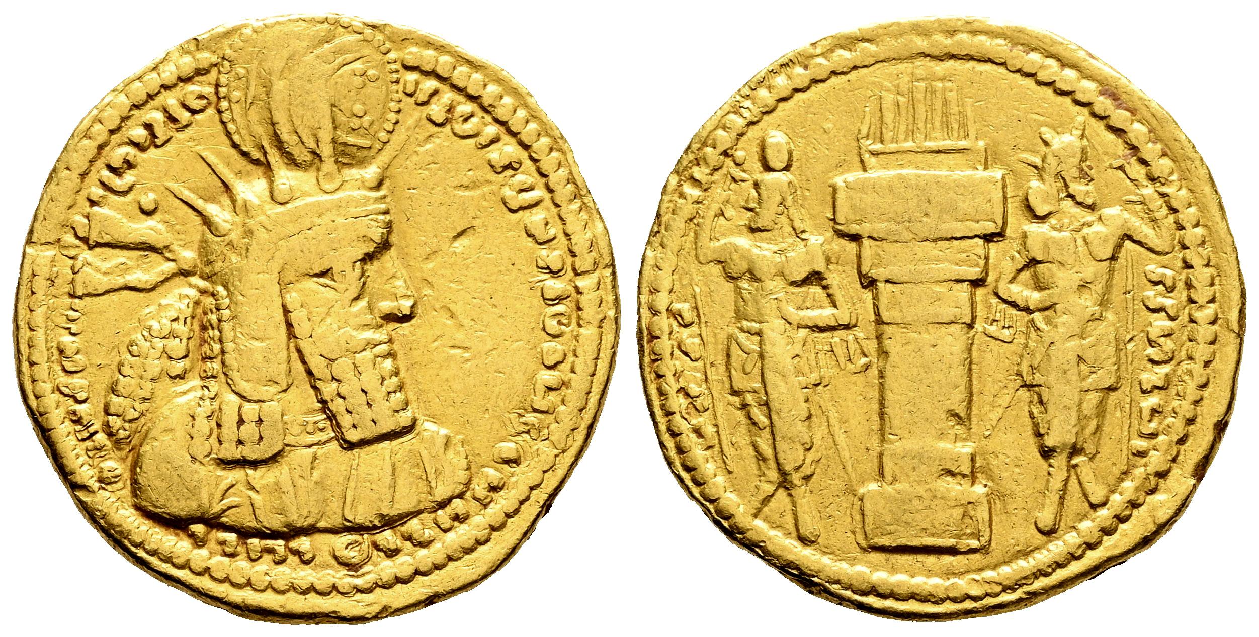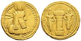 Imperio Sasánida. Bahram I. Dinar. 273-276 d.C. Ctesiphon. Estilo A/c. (Göbl-Tipo I/1). (SNS-Tipo I(1)/1ab(1a)). (Sunrise-754). Anv.: "mzdysn bgy wrhr'n MRK'n MRK' 'yr'n MNW ctry MN yzd'n" en pahlavi, busto a la derecha, con diadema y corona radiada con korymbos; punto sobre las cintas de la diadema. Rev.: "nwr' zy" en pahlavi a la izquierda, "wrhr'n" en pahlavi a la derecha, altar de fuego; flanqueado por dos asistentes, uno a la izquierda con corona con korymbos, el otro con corona mural. Au. 7,40 g. Leves marquitas en anverso. Muy escasa. MBC/MBC+. Est...7000,00.