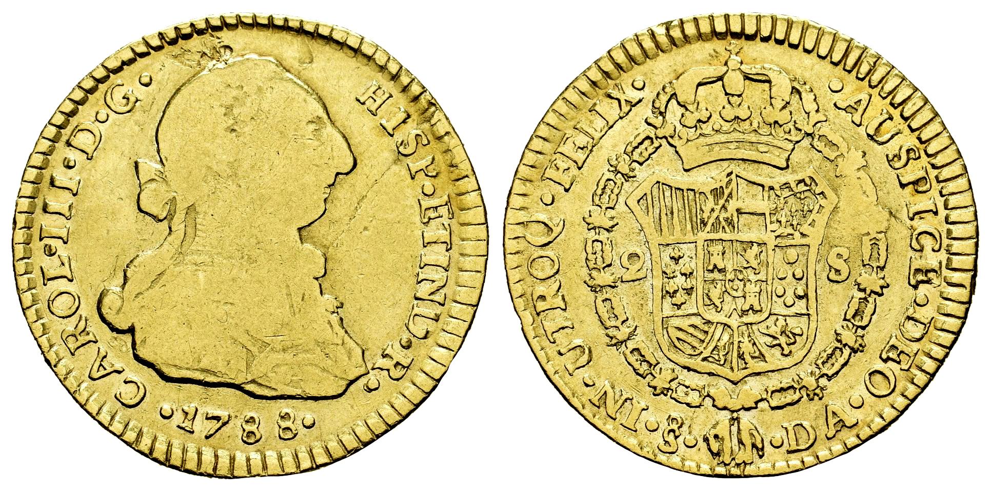 Carlos III (1759-1788). 2 escudos. 1788. Santiago. DA. (Cal-No cita). (Km-No cita). (Cy-12568). Au. 6,58 g. Extremadamente rara, no hemos encontrado ningún otro ejemplar subastado de esta fecha en los últimos 30 años. Acuñación muy débil y leves golpecitos. Una moneda imprescindible para cualquier colección avanzada de la serie, que representa una oportunidad única de incorporar una auténtica rareza al monetario y que difícilmente volveremos a encontrar en el mercado.