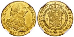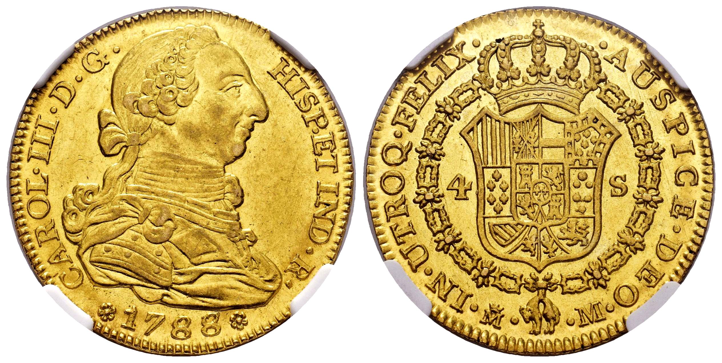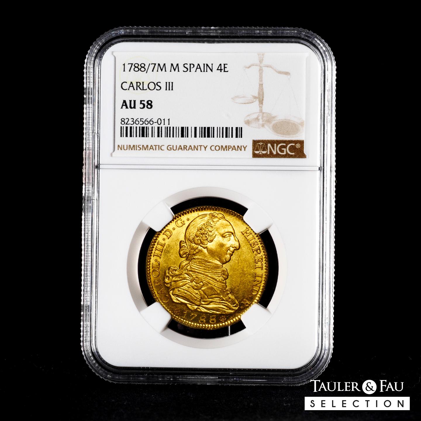 Carlos III (1759-1788). 4 escudos. 1788/7. Madrid. M. (Cal-1794). Au. Sobrefecha. Bonito color y brillo original. Rara en esta conservación. Encapsulada por NGC como AU 58. Est...1800,00.