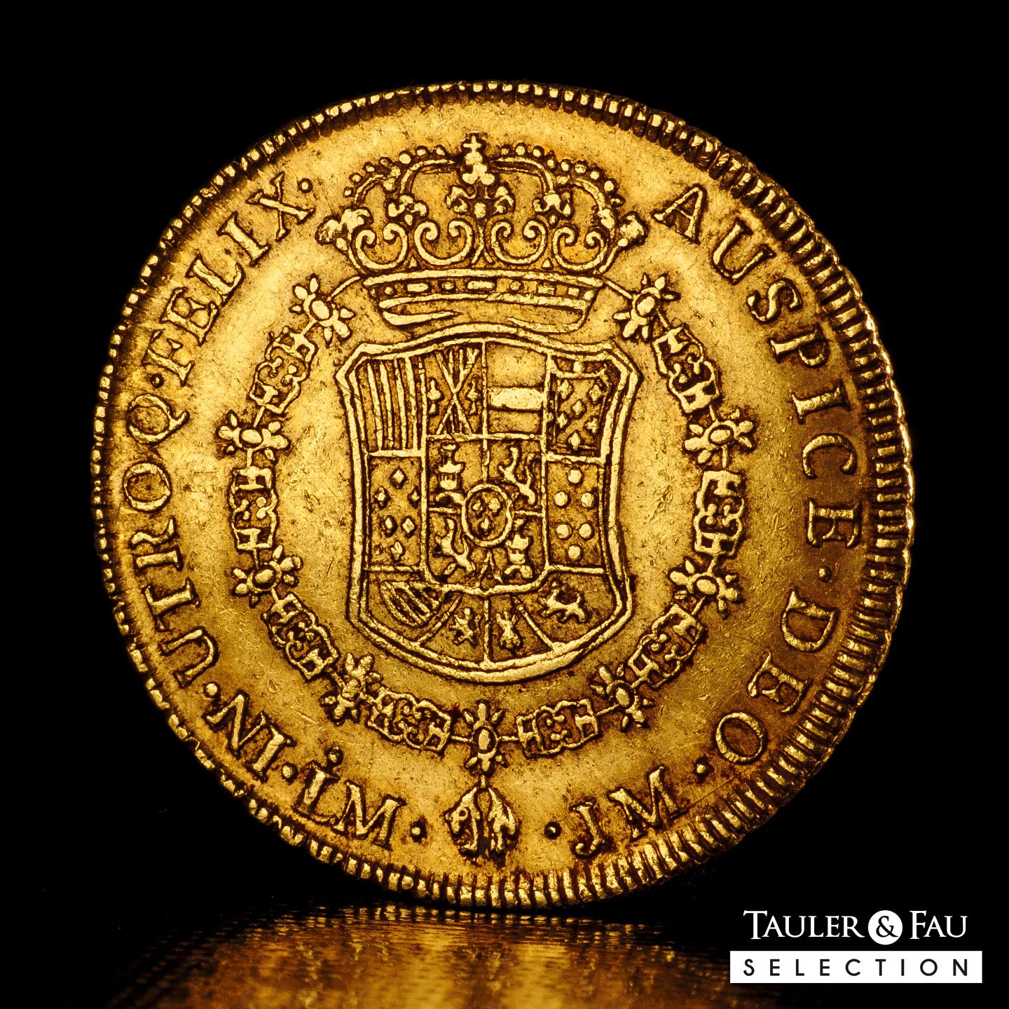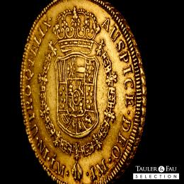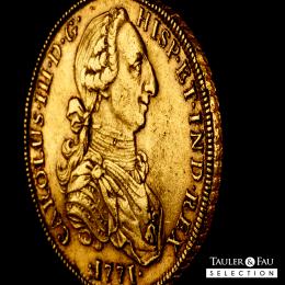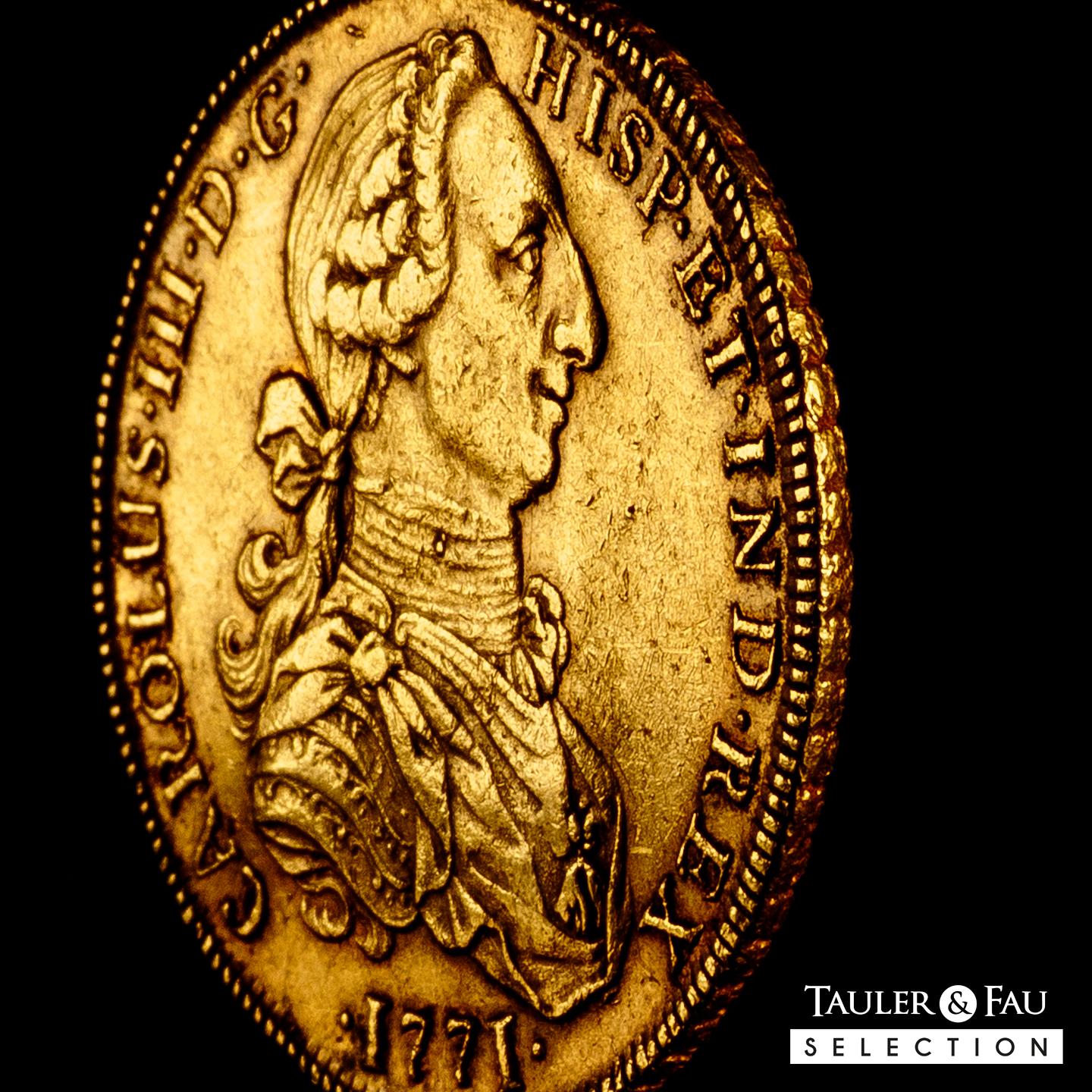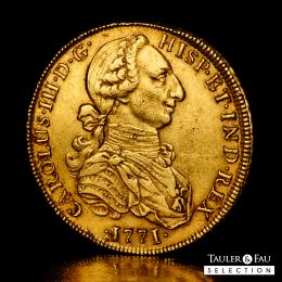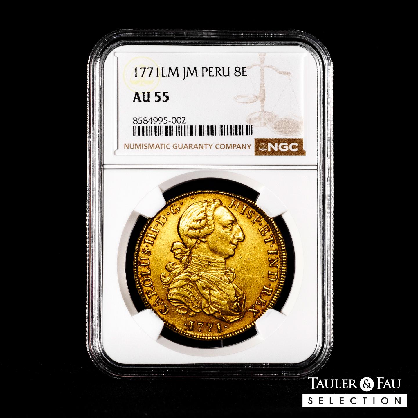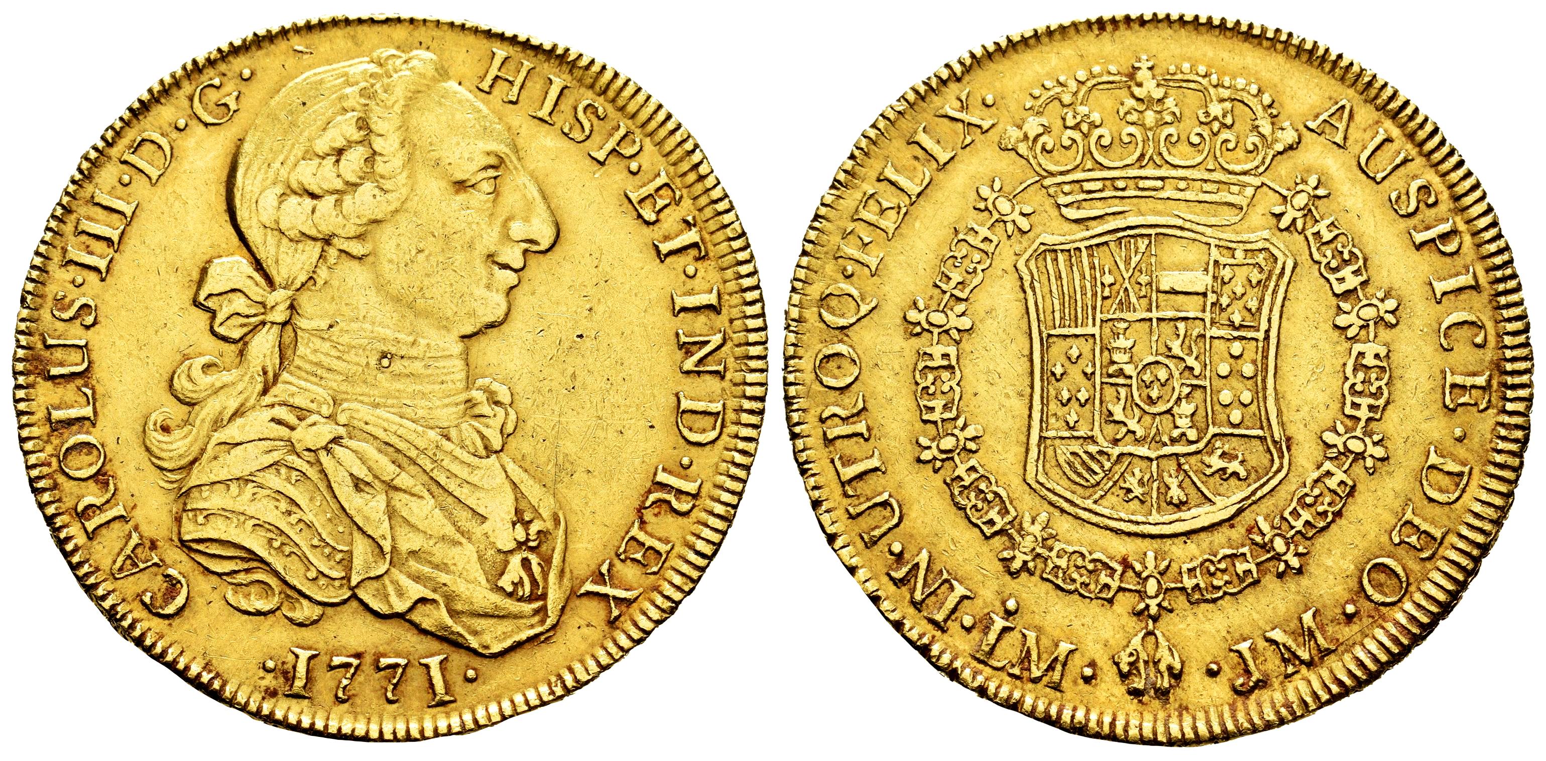 Carlos III (1759-1788). 8 escudos. 1771. Lima. JM. (Cal-1926). (Cal onza-689). Au. 26,91 g. Segundo tipo "cara de rata". Rara, más en esta conservación. Encapsulada por NGC como AU 55. Solamente 3 ejemplares mejor conservados según el censo de NGC. Est...7000,00.