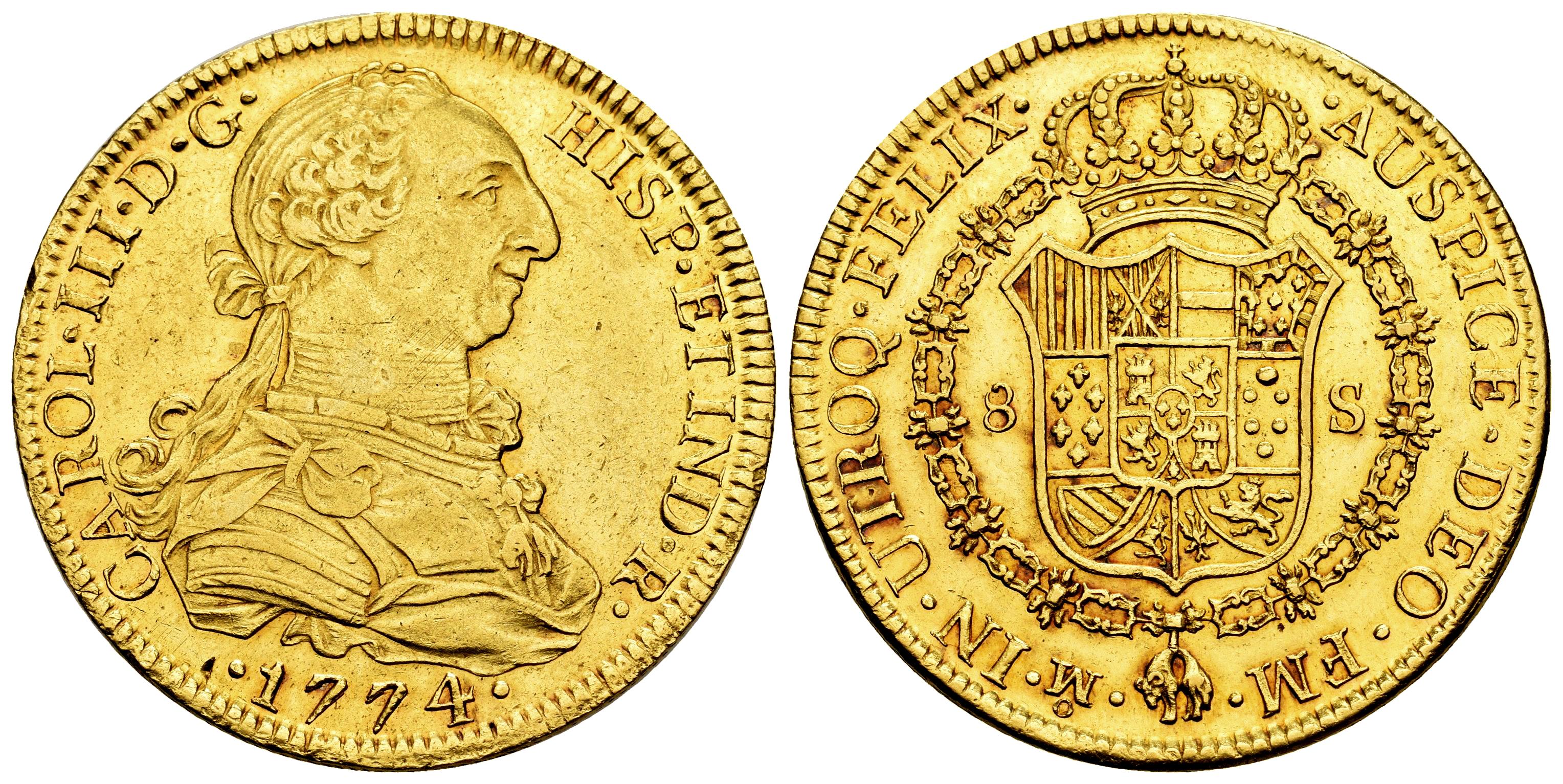 Carlos III (1759-1788). 8 escudos. 1774. México. FM. (Cal-2002). (Cal onza-763). Au. 27,06 g. Ceca y ensayadores invertidos. Golpecito en el canto y alguna rayita. Brillo original, sobre todo en reverso. Escasa así. EBC/EBC+. Est...3000,00.
