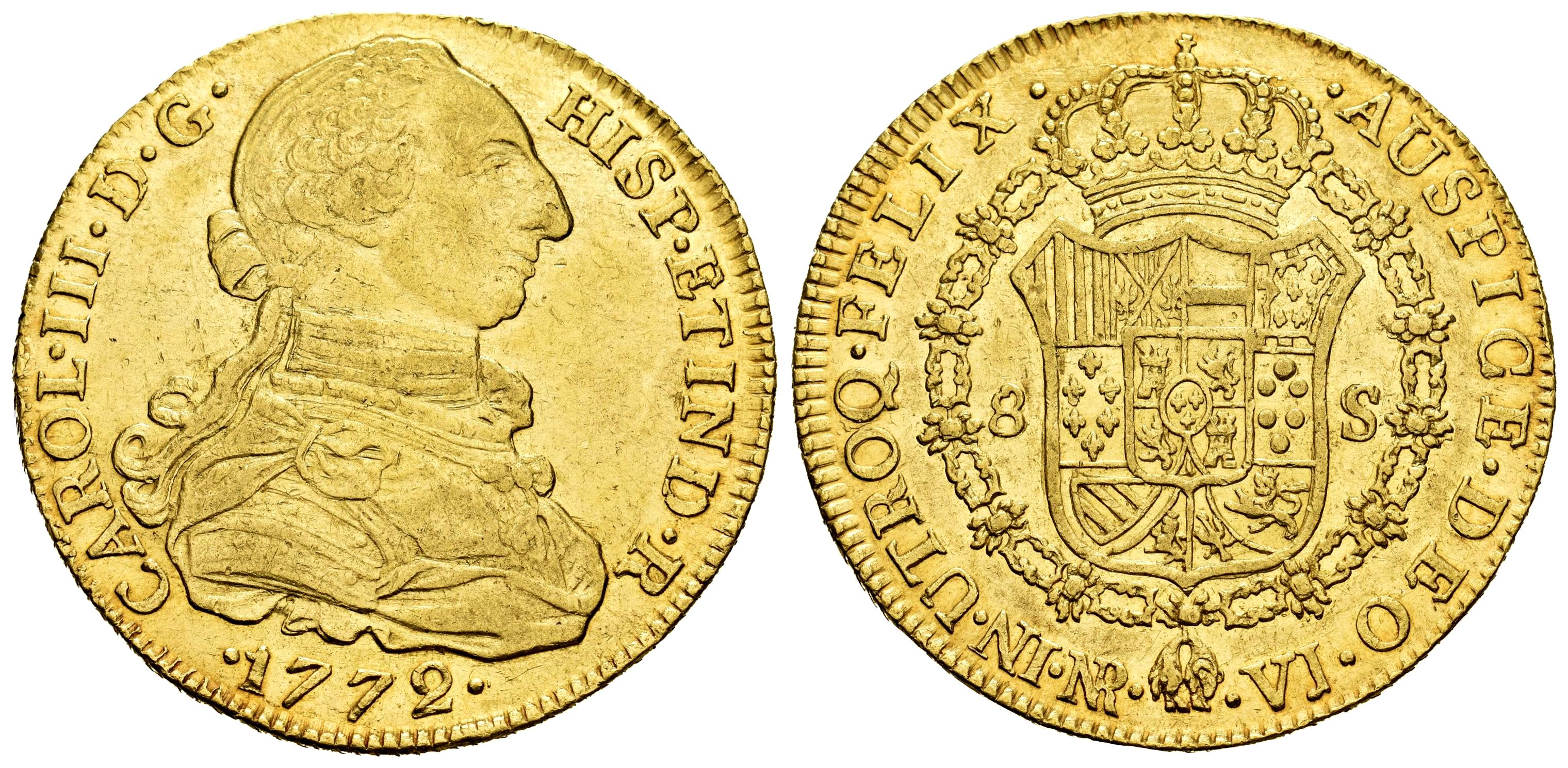 Carlos III (1759-1788). 8 escudos. 1772. Santa Fe de Nuevo Reino. VJ. (Cal-2096). (Cal onza-866). (Restrepo-71/2a). Au. 2702,00 g. Sin punto después de la R. Ínfimas rayitas. Brillo original. Escasa en esta conservación. Ex Áureo & Calicó (12/14/2016), lote 1526. EBC-/EBC. Est...4000,00.