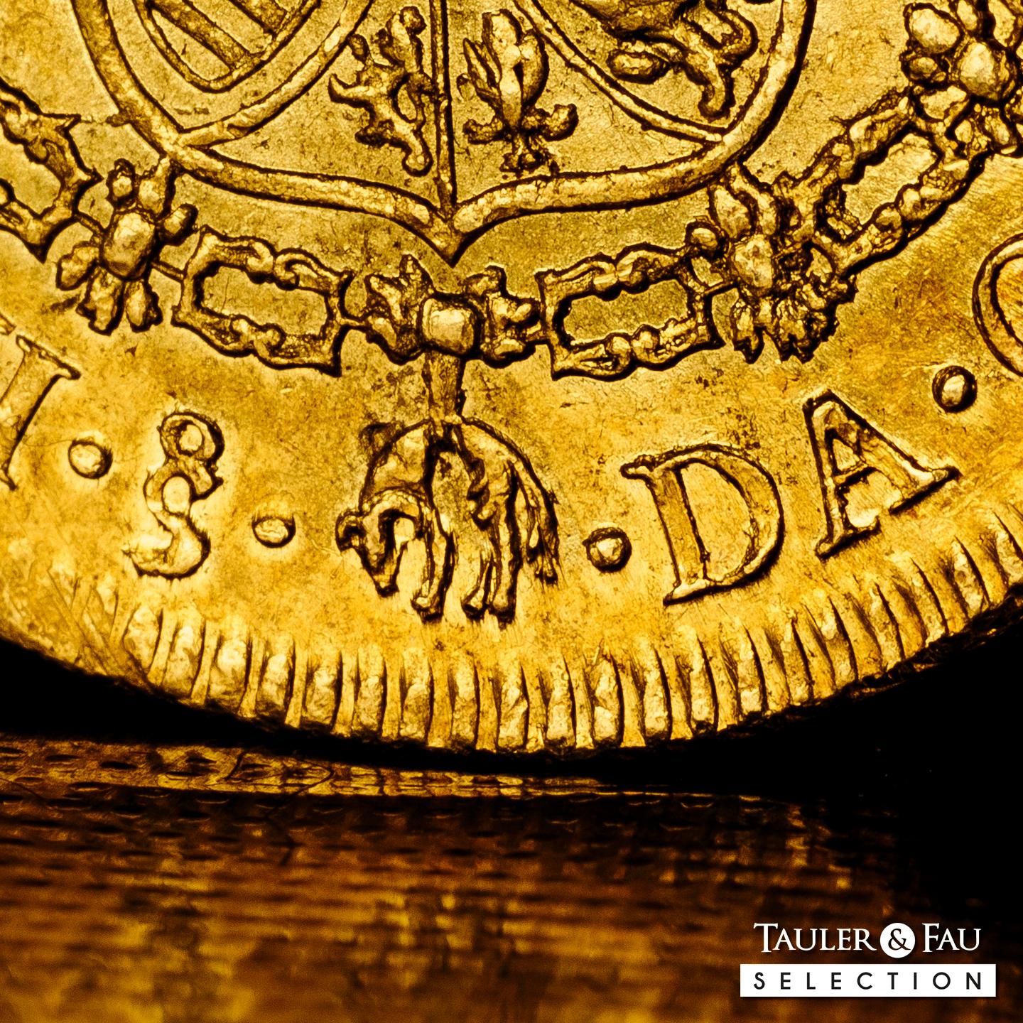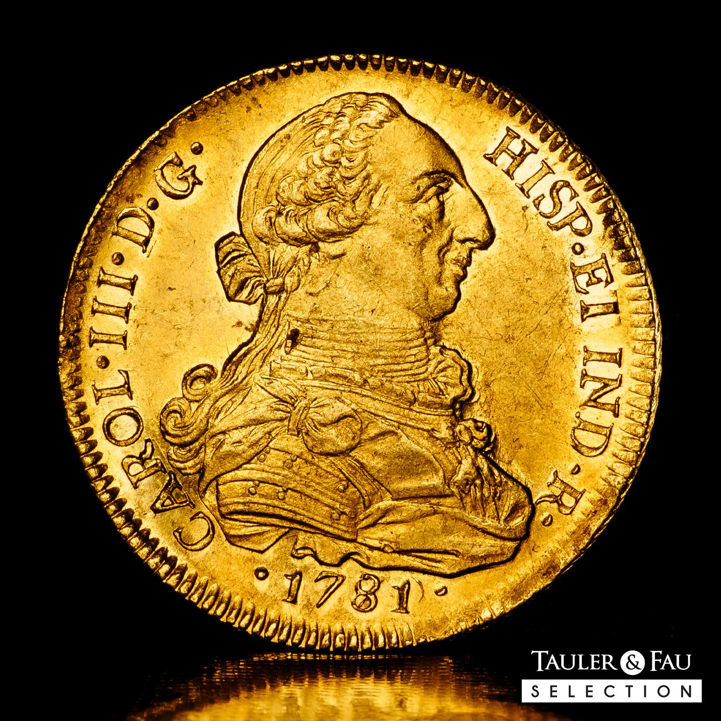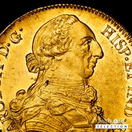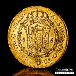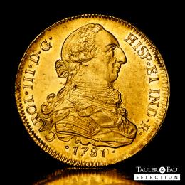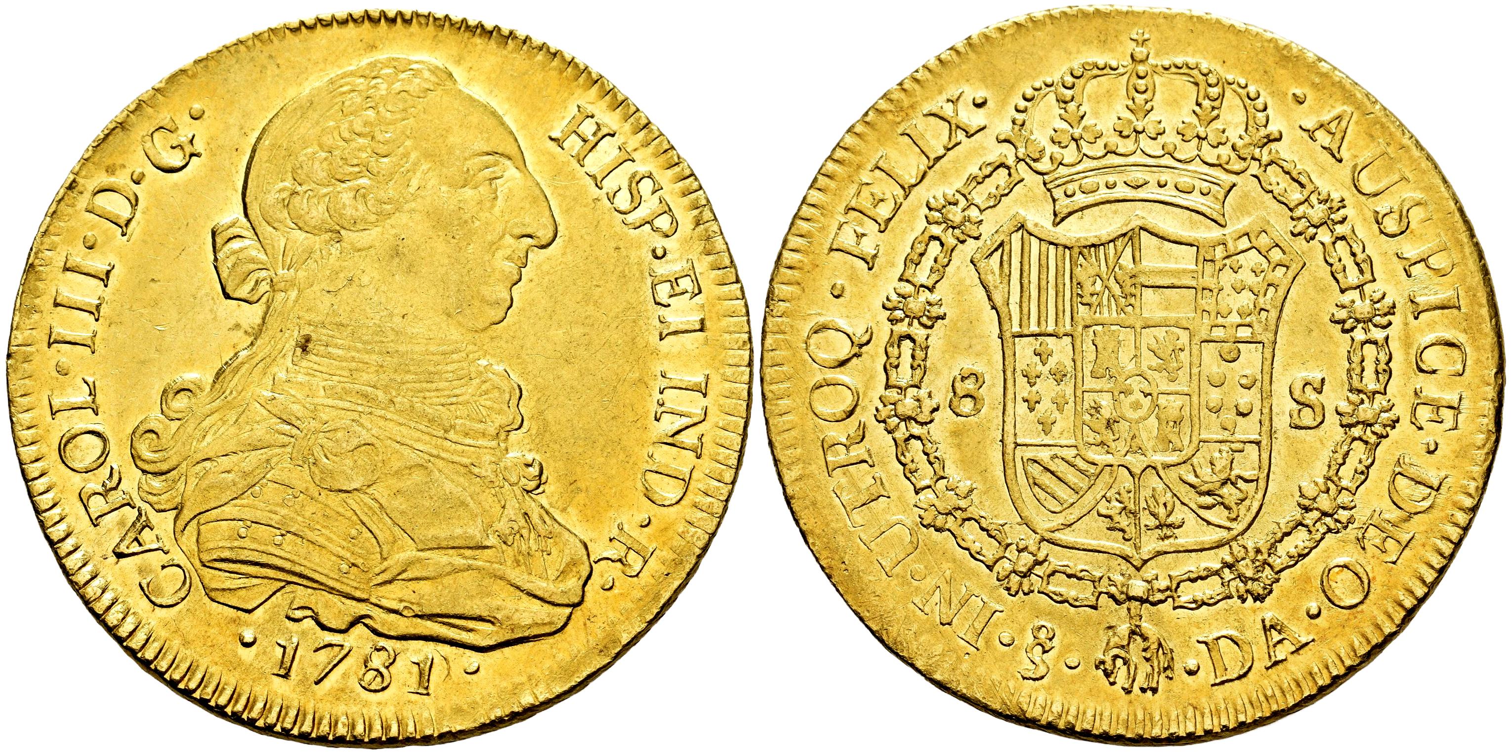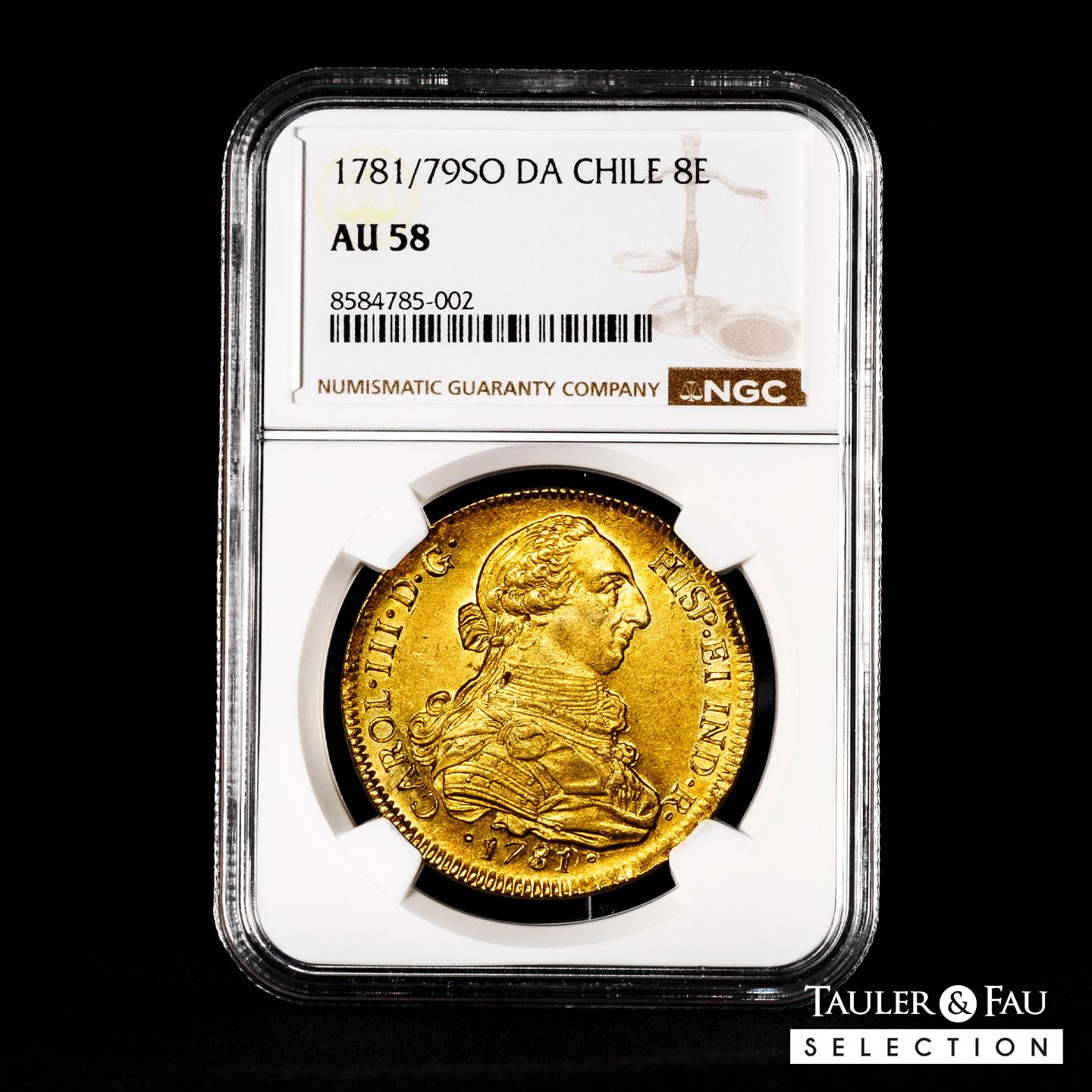 Carlos III (1759-1788). 8 escudos. 1781/79. Santiago. DA. (Cal-2162). (Cal onza-936). Au. 27,06 g. Sobrefecha. Brillo original y precioso color. Atractiva y rara en esta conservación. Encapsulada por NGC como AU 58 (Top Pop), el mejor ejemplar conservado en el censo de NGC. Est...4500,00.